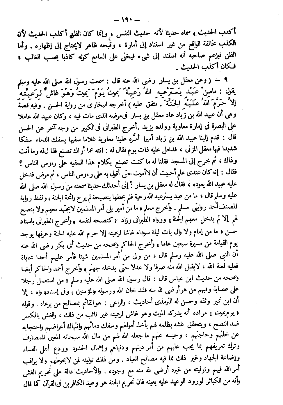 9- وعن معقل بن يسار رضي الله عنه قال سمعت رسول الله صلى الله عليه وسلم يقول: "ما من عبد يسترعيه الله رعية يموت يوم يموت وهو غاش لرعيته إلا حرم الله عليه الجنة" متفق عليه أخرجه البخاري من رواية الحسن وفيه قصة وهي أن عبيد الله بن زياد عاد معقل بن يسار في مرضه الذي مات فيه وكان عبيد الله عاملا على البصرة في إمارة معاوية وولده يزيد أخرجه الطبراني في الكبير من وجه آخر عن الحسن قال قدم إلينا عبيد الله بن زياد أميرا أمره علينا معاوية غلاما سفيها يسفك الدماء سفكا شديدا وفيها معقل المزني فدخل عليه ذات يوم فقال له انته عما أراك تصنع فقال له وما أنت وذاك ثم خرج إلى المسجد فقالنا له ما كنت تصنع بكلام هذا السفيه على رءوس الناس فقال إنه كان عندي علم فأحببت أن لا أموت حتى أقول به على رؤوس الناس ثم مرض فدخل عليه عبيد الله يعوده فقال له معقل بن يسار إني أحدثك حديثا سمعته من رسول الله صلى الله عليه سلم قال ما من عبد يسترعيه الله رعية فلم يحظها بنصيحة لم يرح رائحة الجنة ولفظ رواية المصنف أحد روايتي مسلم وأخرج مسلم "ما من أمير يلي أمر المسلمين لا يجتهد معهم ولا ينصح لهم إلا لم يدخل معهم الجنة" ورواه الطبراني وزاد كنصحه لنفسه وأخرج الطبراني بإسناد حسن ما من إمام ولا وال بات ليل سوداء غاشا لرعيته إلا حرم الله عليه الجنة وعرفها يوجد يوم القيامة من مسيرة سبعين عاما وأخرج الحاكم وصححه من حديث أبي بكر رضي الله عنه أن النبي صلى الله عليه سلم قال: "من ولي من أمر المسلمين شيئا فأمر عليهم أحدا محاباة فعليه لعنة الله لا يقبل الله منه صرفا ولا عدلا حتى يدخله جهنم" وأخرج أحمد والحاكم أيضا وصححه من حديث ابن عباس قال قال رسول الله صلى الله عليه وسلم: "من استعمل رجلا على عصابة وفيهم من هو أرضى لله منه فقد خان الله ورسوله والمؤمنين" وفي إسناده واه إلا أن ابن نمير وثقه وحسن له الترمذي أحاديث والراعي هو القائم بمصالح من يرعاه وقوله يوم يموت مراده أن يدركه الموت وهو غاش لرعيته غير تائب من ذلك والغش بالكسر ضد النصح ويتحقق غشه بظلمه لهم وأخذ أموالهم وسفك دمائهم وانتهاك أعراضهم واحتجابه عن خلتهم وحاجتهم وحبسه عنهم ما جعله الله لهم من مال الله سبحانه المعين للمصارف وترك تعريفهم بما يجب عليهم من أمر دينهم ودنياهم وإهمال الحدود وردع أهل الفساد وإضاعة الجهاد وغير ذلك مما فيه مصالح العباد ومن ذلك توليته لمن لا يحوطهم ولا يراقب أمر الله فيهم وتوليته من غيره أرضى لله منه مع وجوده والأحاديث دالة على تحريم الغش وأنه من الكبائر لورود الوعيد عليه بعينه فإن تحريم الجنة هو وعيد الكافرين في القرآن كما قال
