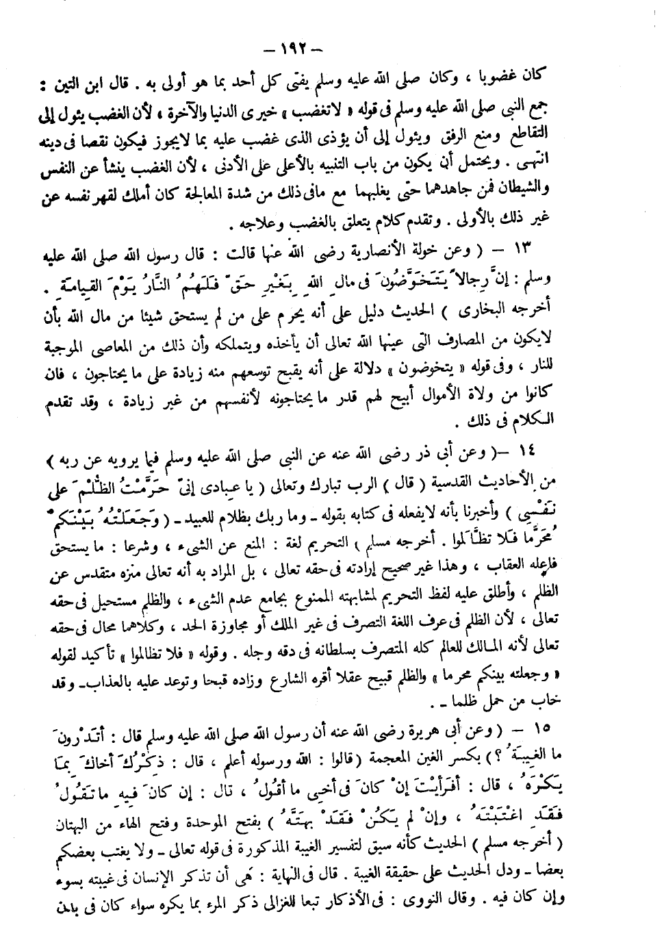 14- وعن أبي ذر رضي الله عنه عن النبي صلى الله عليه سلم فيما يرويه عن ربه من الأحاديث القدسية قال الرب تبارك وتعالى: "يا عبادي إني حرمت الظلم على نفسي" وأخبرنا بأنه لا يفعله في كتابه بقوله: {وَمَا رَبُّكَ بِظَلَّامٍ لِلْعَبِيدِ} وجعلته بينكم محرما فلا تظالموا" أخرجه مسلم التحريم لغة المنع عن الشيء وشرعا ما يستحق فاعله العقاب وهذا غير صحيح إرادته في حقه تعالى بل المراد به أنه تعالى منزه متقدس عن الظلم وأطلق عليه لفظ التحريم لمشابهته الممنوع بجامع عدم الشيء والظلم مستحيل في حقه تعالى لأن الظلم في عرف اللغة التصرف غي غير الملك أو مجاوزة الحد وكلاهما محال في حقه تعالى لأنه المالك للعالم كله المتصرف بسلطانه في دقه وجله وقوله فلا تظالموا تأكيد لقوله وجعلته بينكم محرما والظلم قبيح عقلا أقره الشارع وزاده قبحا وتوعد عليه بالعذاب وقد خاب من حمل ظلما وغيرها