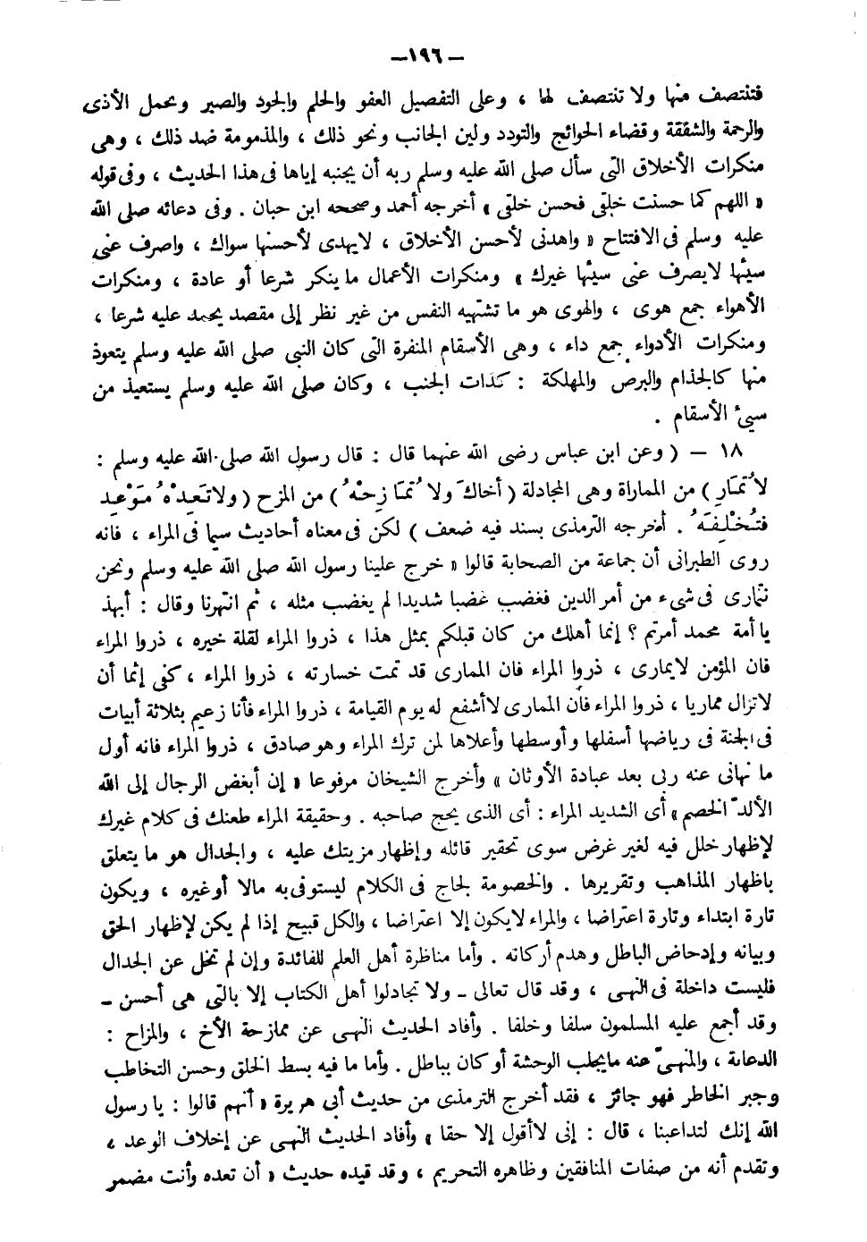 18- وعن ابن عباس رضي الله عنهما قال قال رسول الله صلى الله عليه سلم: "لا تمار" من المماراة وهي المجادلة "أخاك ولا تمازحه" من المزح "ولا تعده موعدا فتخلفه" أخرجه الترمذي بسند فيه ضعف لكن في معناه أحاديث سيما في المراء فإنه روى الطبراني أن جماعة من الصحابة قالوا خرج علينا رسول الله صلى الله عليه وسلم ونحن نتمارى في شيء من أمر الدين فغضب غضبا شديدا لم يغضب مثله ثم انتهرنا وقال أبهذا يا أمة محمد أمرتم إنما أهلك من كان قبلكم بمثل هذا ذروا المراء لقلة خيره ذروا المراء فإن المؤمن لا يماري ذروا المراء فإن المماري قد تمت خسارته ذروا المراء كفى إثما أن لا تزال مماريا ذروا المراء فإن المماري لا أشفع له يوم القيامة ذروا المراء فأنا زعيم بثلاثة أبيات في الجنة في رياضها أسفلها وأوسطها وأعلاها لمن ترك المراء وهو صادق ذروا المراء فإنه أول ما نهاني عنه ربي بعد عبادة الأوثان وأخرج الشيخان مرفوعا "إن أبغض الرجال إلى الله الألد الخصم" أي الشديد المراء أي الذي يحج صاحبه وحقيقة المراء طعنك في كلام غيرك لإظهار خلل فيه لغير غرض سوى تحقير قائله وإظهار مزيتك عليه والجدال هو ما يتعلق بإظهار المذاهب وتقريرها والخصومة لجاج في الكلام ليستوفى به أو غيره ويكون تارة ابتداء وتارة اعتراضا والمراء لا يكون إلا اعتراضا والكل قبيح إذا لم يكن لإظهار الحق وبيانه وإدحاض الباطل وهدم أركانه وأما مناظرة أهل العلم للفائدة وإن لم تخل عن الجدال فليست داخلة في النهي وقد قال تعالى: {وَلا تُجَادِلُوا أَهْلَ الْكِتَابِ إِلَّا بِالَّتِي هِيَ أَحْسَنُ} وقد أجمع عليه المسلمون سلفا وخلفا وأفاد الحديث النهي عن ممازحة الأخ والمزاح الدعابة والمنهي عنه ما يجلب الوحشة أو كان بباطل وأما ما فيه بسط الخلق وحسن التخاطب وجبر الخاطر فهو جائز فقد أخرج الترمذي من حديث أبي هريرة أنهم قالوا يا رسول الله إنك لتداعبنا قال "إني لا أقول إلا حقا" وأفاد الحديث النهي عن إخلاف الوعد وتقدم أنه من صفات المنافقين وظاهره التحريم وقد قيده حديث أن تعده وأنت مضمر