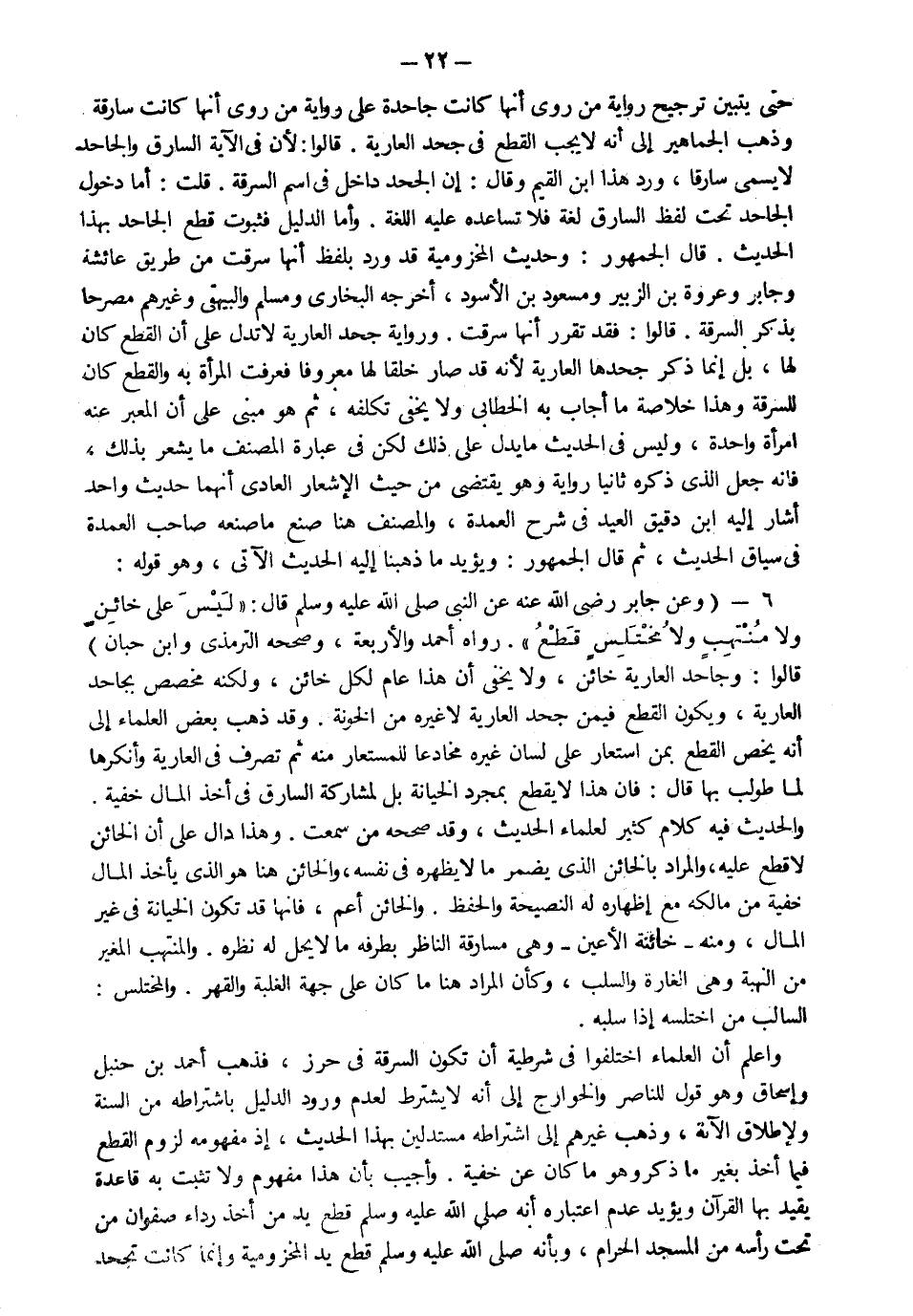 6- وعن جابر رضي الله عنه عن النبي صلى الله عليه وسلم قال: "ليس على خائن ولا منتهب ولا مختلس قطع" رواه أحمد والأربعة وصححه الترمذي وابن حبان قالوا وجاحد العارية خائن ولا يخفى أن هذا عام لكل خائن ولكنه مخصص بجاحد العارية ويكون القطع فيمن جحد العارية لا غيره من الخونة وقد ذهب بعض العلماء إلى أنه يخص القطع بمن استعار على لسان غيره مخادعا للمستعار منه ثم تصرف في العارية وأنكرها لما طولب بها قال فإن هذا لا يقطع بمجرد الخيانة بل لمشاركة السارق في أخذ المال خفية والحديث فيه كلام كثير لعلماء الحديث وقد صححه من سمعت وهذا دال على أن الخائن لا قطع عليه والمراد بالخائن الذي يضمر ما لا يظهره في نفسه والخائن هنا هو الذي يأخذ المال خفية من مالكه مع إظهاره له النصيحة والحفظ والخائن أعم فإنها تكون الخيانة في غير المال ومنه خائنة الأعين وهي مسارقة الناظر بطرفه ما لا يحل له نظره والمنتهب المغير من النهبة وهي الغارة والسلب وكأن المراد هنا ما كان على جهة الغلبة والقهر والمختلس السالب من اختلسه إذا سلبه واعلم أن العلماء اختلفوا في شرطية أن تكون السرقة في حرز فذهب أحمد بن حنبل وإسحاق وهو قول للناصر والخوارج إلى أنه لا يشترط لعدم ورود الدليل باشتراطه من السنة ولإطلاق الآية وذهب غيرهم إلى اشتراطه مستدلين بهذا الحديث إذ مفهومه لزوم القطع فيما أخذ بغير ما ذكر وهو ما كان عن خفية وأجيب بأن هذا مفهوم ولا تثبت به قاعدة يقيد بها القرآن ويؤيد عدم اعتباره أنه صلى الله عليه وسلم قطع يد من أخذ رداء صفوان من تحت رأسه من المسجد الحرام وبأنه صلى الله عليه وسلم قطع يد المخزومية وإنما كانت تجحد