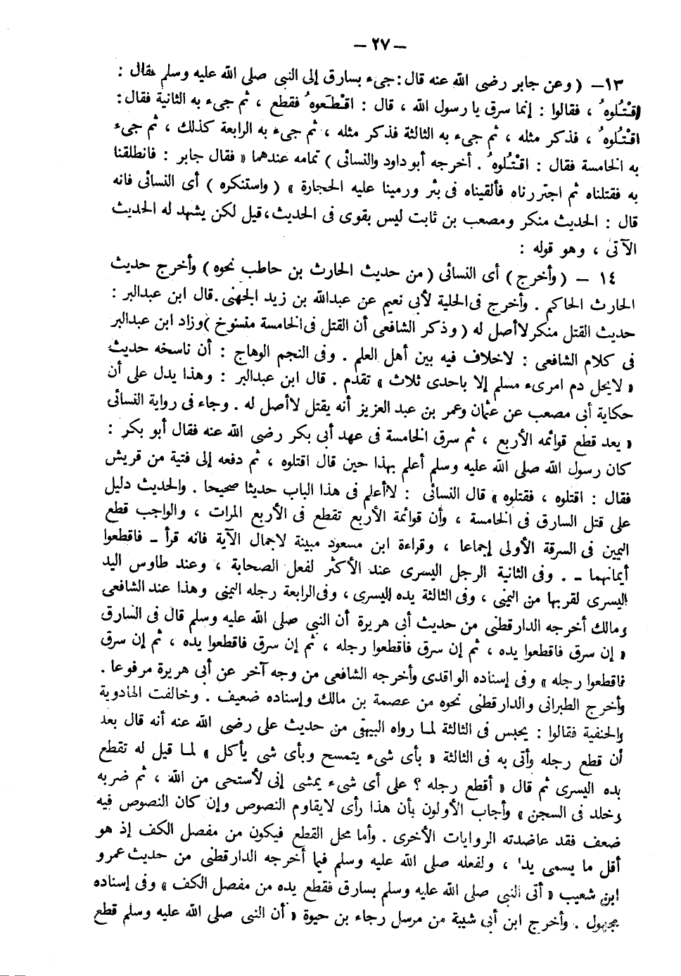 13- وعن جابر رضي الله عنه قال جيء بسارق إلى النبي صلى الله عليه وسلم فقال: "اقتلوه" فقال إنما سرق يا رسول الله قال: "اقطعوه" فقطع ثم جيء به الثانية فقال: "اقتلوه" فذكر مثله ثم جيء به الثالثة فذكر مثله ثم جيء به الرابعة كذلك ثم جيء به الخامسة فقال "اقتلوه" أخرجه أبو داود والنسائي تمامه ثمهما فقال جابر فانطلقنا به فقتلناه ثم اجتررناه فألقيناه في بئر ورمينا عليه الحجارة واستنكره أي النسائي فإنه قال الحديث منكر ومصعب بن ثابت ليس بقوي في الحديث قيل لكن يشهد له الحديث الآتي وهو قوله