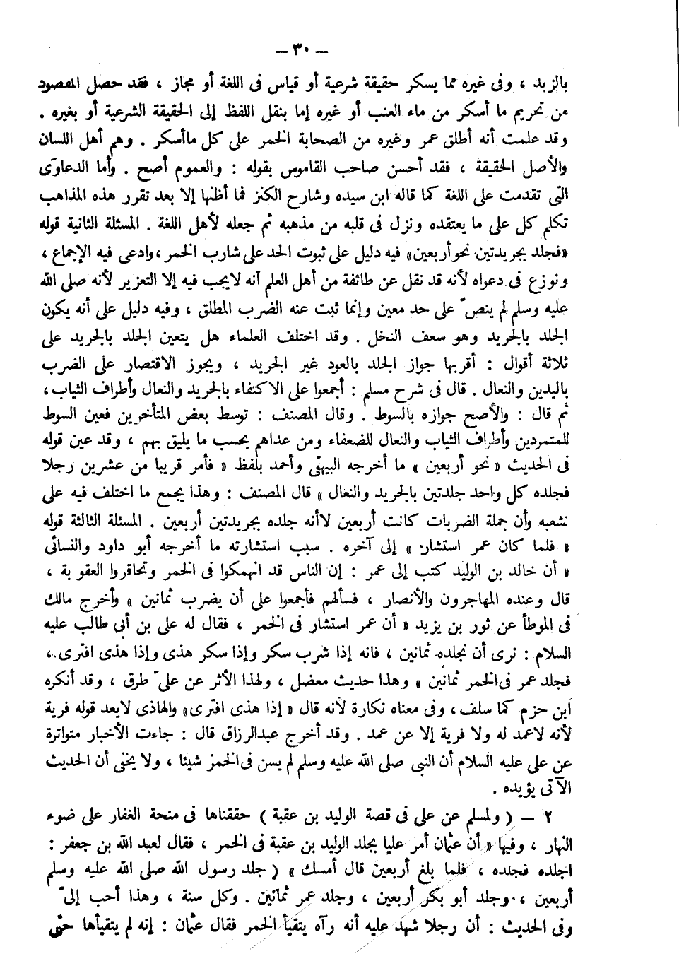بالزبد وفي غيره مما يسكر حقيقة شرعية أو قياس في اللغة أو مجاز فقد حصل المقصود من تحريم ما أسكر من ماء العنب أو غيره إما بنقل اللفظ إلى الحقيقة الشرعية أو بغيره وقد علمت أنه أطلق عمر وغيره من الصحابة الخمر على كل ما أسكر وهم أهل اللسان والأصل الحقيقة فقد أحسن صاحب القاموس بقوله والعموم أصح وأما الدعاوى التي تقدمت على اللغة كما قاله ابن سيده وشارح الكنز فما أظنها إلا بعد تقرير هذه المذاهب إذنه تكلم كل على ما يعتقده ونزل في قلبه من مذهبه ثم جعله لأهل اللغة المسألة الثانية قوله فجلده بجريدتين نحو أربعين فيه دليل على ثبوت الحد على شارب الخمر وادعى فيه الإجماع ونوزع في دعواه لأنه قد نقل عن طائفة من أهل العلم أنه لا يجب فيه إلا التعزير لأنه صلى الله عليه وسلم لم ينص على حد معين وإنما ثبت عنه الضرب المطلق وفيه دليل على أنه يكون الجلد بالجريد وهو سعف النخل وقد اختلف العلماء هل يتعين الجلد بالجريد على ثلاثة أقوال أقربها جواز الجلد بالعود غير الجريد ويجوز الاقتصار على الضرب باليدين والنعال قال في شرح مسلم أجمعوا على الاكتفاء بالجريد والنعال وأطراف الثياب ثم قال والأصح جوازه بالسوط وقال المصنف: توسط بعض المتأخرين فعين السوط للمتمردين وأطراف الثياب والنعال للضعفاء ومن عداهم بحسب ما يليق بهم وقد عين قوله في الحديث نحو أربعين ما أخرجه البيهقي وأحمد بلفظ فأمر قريبا من عشرين رجلا فجلده كل واحد جلدتين بالجريد والنعال قال المصنف وهذا يجمع ما اختلف فيه على تشعبه وأن جملة الضربات كانت أربعين لا أنه جلده بجريدتين أربعين المسألة الثالثة قوله فلما كان عمر استشار إلى آخره سبب استشارته ما أخرجه أبو داود والنسائي أن خالد بن الوليد كتب إلى عمر إن الناس قد انهمكوا في الخمر وتحاقروا العقوبة قال وعنده المهاجرون والأنصار فسألهم فأجمعوا على أن يضرب ثمانين وأخرج مالك في الموطأ عن ثور بن يزيد أن عمر استشار في الخمر فقال له علي بن أبي طالب عليه السلام نرى أن تجلده ثمانين فإنه إذا شرب سكر وإذا سكر هذي وإذا هذي افترى فجلد عمر في الخمر ثمانين وهذا حديث معضل ولهذا الأثر عن علي طرق وقد أنكره ابن حزم كما سلف وفي معناه نكارة لأنه قال إذا هذي إفترى لا يعد قوله فرية لأنه لا عمد له ولا فرية إلا عن عمد وقد أخرج عبد الرزاق قال جاءت الأخبار متواترة عن علي عليه السلام أن النبي صلى الله عليه وسلم لم يسن في الخمر شيئا ولا يخفى أن الحديث الآتي يؤيده