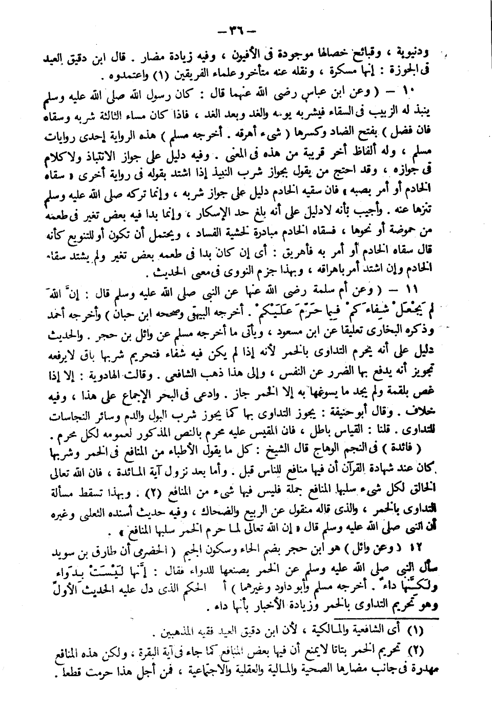10- وعن ابن عباس رضي الله عنهما قال: "كان رسول الله صلى الله عليه وسلم ينبذ له الزبيب في السقاء فيشربه يومه والغد وبعد الغد فإذا كان مساء الثالثة شربه وسقاه فإن فضل" بفتح الضاد وكسرها "شيء أهراقه" أخرجه مسلم هذه الرواية إحدى روايات مسلم وله ألفاظ أخر المساجد من هذه في المعنى وفي دليل على جواز الانتباذ ولا كلام في جوازه وقد احتج من يقول بجواز شرب النبيذ إذا اشتد بقوله في رواية أخرى "سقاه الخادم أو أمر بصبه" فإن سقيه الخادم دليل على جواز شربه وإنما تركه صلى الله عليه وسلم تنزها عنه وأجيب بأنه لا دليل على أنه بلغ حد الإسكار وإنما بدا فيه بعض تغير في طعمه من حموضة أو نحوها فسقاه الخادم مبادرة لخشية الفساد ويحتمل أن تكون أو للتنويع كأنه قال سقاه الخادم أو أمر به فأهريق أي إن كان بدا في طعمه بعض تغير ولم يشتد سقاه الخادم وإن اشتد أمر بإهراقه وبهذا جزم النووي في معنى الحديث