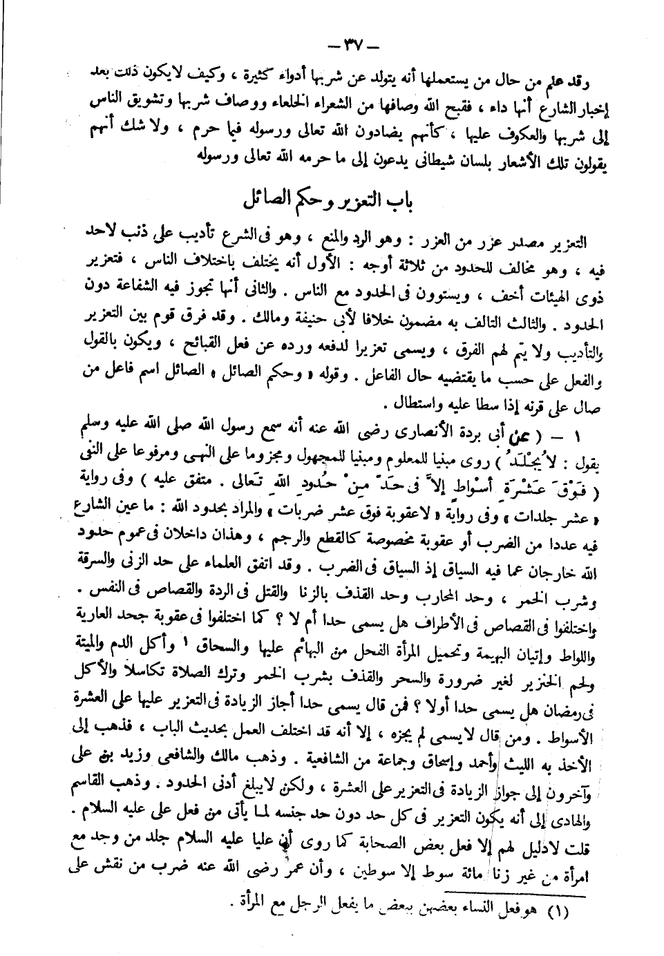 1- عن أبي بردة الأنصاري رضي الله عنه أنه سمع رسول الله صلى الله عليه وسلم يقول "لا يجلد" روي مبنيا للمعلوم ومبنيا للمجهول ومجزوما على النهي ومرفوعا على النفي "فوق عشرة أسواط إلا في حد من حدود الله تعالى" متفق عليه وفي رواية عشر جلدات وفي رواية "لا عقوبة فوق عشر ضربات" والمراد بحدود الله ما عين الشارع فيه عددا من الضرب أو عقوبة مخصوصة كالقطع والرجم وهذان داخلان في عموم حدود الله خارجان عما فيه السياق إذ السياق في الضرب وقد اتفق العلماء على حد الزنا والسرقة وشرب الخمر وحد المحارب وحد القذف بالزنا والقتل في الردة والقصاص في النفس واختلفوا في القصاص في الأطراف هل يسمى حدا أم لا كما اختلفوا في عقوبة جحد العارية واللواط وإتيان البهيمة وتحميل المرأة الفحل من البهائم عليها والسحاق وأكل الدم والميتة ولحم الخنزير لغير ضرورة والسحر والقذف بشرب الخمر وترك الصلاة تكاسلا والأكل في رمضان هل يسمى حدا أو لا فمن قال يسمى حدا أجاز الزيادة في التعزير عليها على العشر الأسواط ومن قال لا يسمى لم يجزه إلا أنه قد اختلف في العمل بحديث الباب فذهب إلى الأخذ به الليث وأحمد وإسحق وجماعة من الشافعية وذهب مالك والشافعي وزيد بن علي وآخرون إلى جواز الزيادة في التعزير على العشرة ولكن لا يبلغ أدنى الحدود وذهب القاسم والهادي إلى أن يكون التعزير في كل حد دون حد جنسه لما يأتي من فعل علي عليه السلام قلت لا دليل لهم إلا فعل بعض الصحابة كما روي أن عليا عليه السلام جلد من وجد مع امرأة من غير زنا مائة سوط إلا سوطين وأن عمر رضي الله عنه ضرب من نقش على