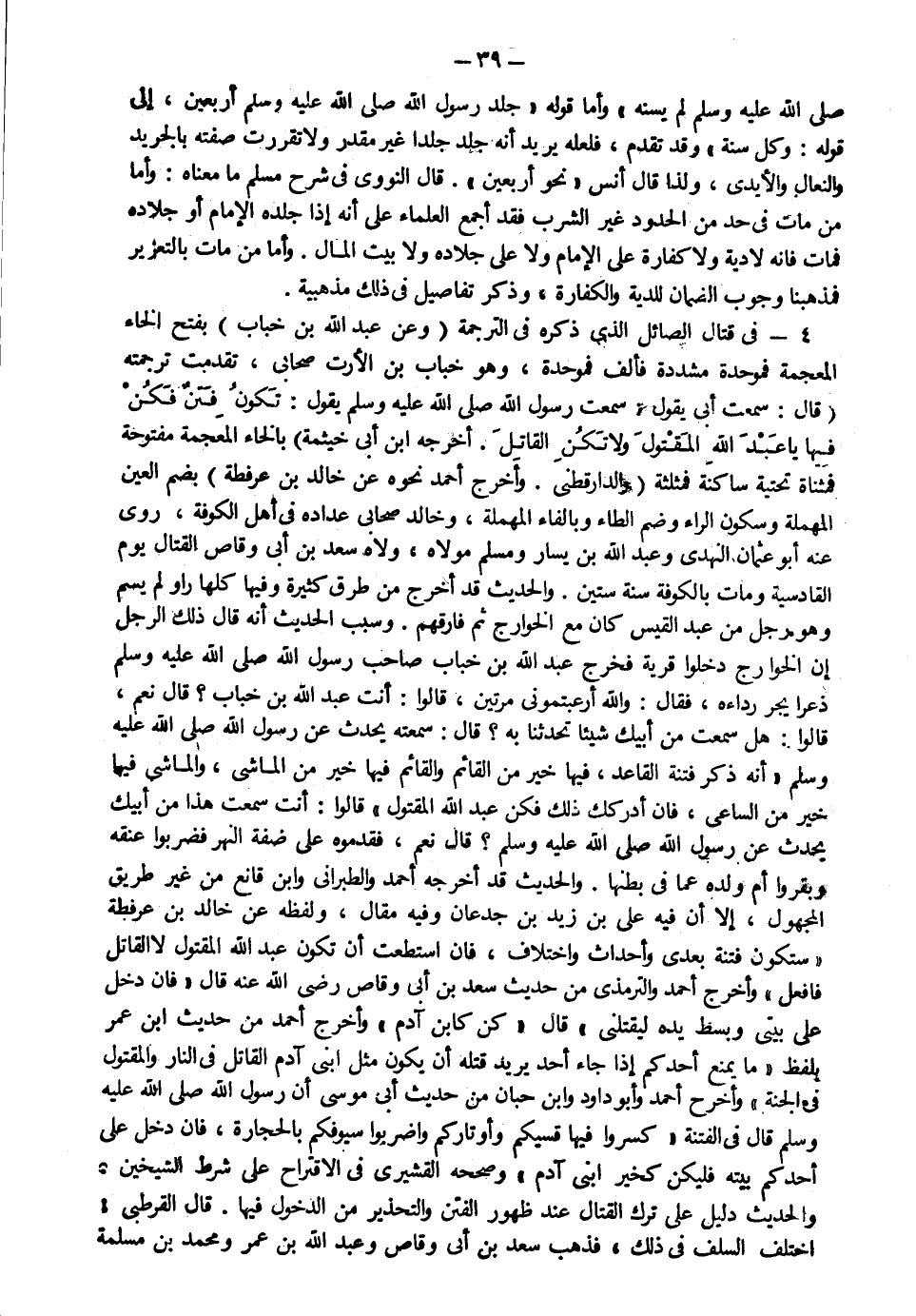 4- في قتال الصائل الذي ذكره في الترجمة وعن عبد الله بن خباب بفتح الخاء المعجمة فموحدة مشددة فألف فموحدة وهو خباب بن الأرت صحابي تقدمت ترجمته قال سمعت أبي يقول سمعت رسول الله صلى الله عليه سلم يقول: "تكون فتن فكن فيها ياعبد الله المقتول ولا تكن القاتل" أخرجه ابن أبي خيثمة بالخاء المعجمة مفتوحة فمثناة تحتية ساكنة فمثلثة والدارقطني وأخرج أحمد نحوه عن خالد بن عرفطة بضم العين المهملة وسكون الراء وضم الفاء وبالطاء المهملة وخالد صحابي عداده في أهل الكوفة روى عنه أبو عثمان النهدي وعبد الله بن يسار ومسلم مولاه ولاه سعد بن أبي وقاص القتال يوم القادسية ومات بالكوفة سنة ستين والحديث قد أخرج من طرق كثيرة وفيها كلها راو لم يسم وهو رجل من عبد القيس كان مع الخوارج ثم فارقهم وسبب الحديث أنه قال ذلك الرجل إن الخوارج دخلوا قرية فخرج عبد الله بن خباب صاحب رسول الله صلى الله عليه وسلم ذعرا يجر رداءه فقال والله أرعبتموني مرتين قالوا أنت عبد الله بن خباب قال نعم قالوا هل سمعت من أبيك شيئا تحدثنا به قال سمعته يحدث عن رسول الله صلى الله عليه وسلم أنه ذكر "فتنة القاعد فيها خير والقائم فيها خير من الماشي والماشي فيها خير من الساعي فإن أدركك ذلك فكن عبد الله المقتول" قالوا أنت سمعت هذا من أبيك يحدث عن رسول الله صلى الله عليه وسلم قال نعم فقدموه على ضفة النهر فضربوا عنقه وبقروا أم ولده عما في بطنها والحديث قد أخرجه أحمد والطبراني وابن قانع طريق المجهول إلا أن فيه علي بن زيد بن جدعان وفهي مقال ولفظه عن خالد بن عرفطة "ستكون فتنة بعدي وأحداث واختلاف فإن استطعت أن تكون عبد الله المقتول لا القاتل فافعل" وأخرج أحمد والترمذي من حديث سعد بن أبي وقاص رضي الله عنه قال فإن دخل على بيتي وبسط يده ليقتلني قال كن كابن آدم وأخرج أحمد من حديث ابن عمر بلفظ ما يمنع أحدكم إذا جاء أحدا يريد قتله أن يكون مثل أبني آدم القاتل في النار والمقتول في الجنة وأخرج أحمد وأبو داود وابن حبان من حديث أبي موسى أن رسول الله صلى الله عليه سلم قال في الفتنة "كسروا فيها قسيكم وأوتاركم واضربوا سيوفكم بالحجارة فإن دخل على أحدكم بيته فليكن كخير ابني آدم" وصححه القشيري في الاقتراح على شرط الشيخين والحديث دليل على ترك القتال عند ظهور الفتن والتحذير من الدخول فيها قال القرطبي اختلف السلف في ذلك فذهب سعد بن أبي وقاص وعبد الله بن عمر ومحمد بن مسلمة