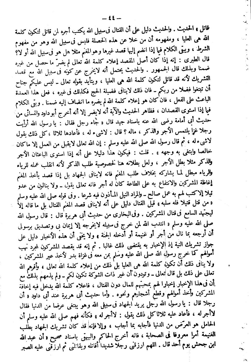 قاتل..." الحديث والحديث دليل على أن القتال في سبيل الله يكتب أجره لمن قاتل لتكون كلمة الله هي العليا ومفهومه أن من خلا عن هذه الخصلة فليس في سبيل الله وهو من مفهوم الشرط ويبقى الكلام فيما إذا انضم إليها قصد غيرها وهو المغنم مثلا هل هو في سبيل الله أو لا قال الطبري إنه إذا كان أصل المقصد إعلاء كلمة الله تعالى لم يضر ما حصل من غيره ضمنا وبذلك قال الجمهور والحديث يحتمل أنه لا يخرج عن كونه في سبيل الله مع قصد التشريك لأنه قد قاتل لتكون كلمة الله هي العليا ويتأيد بقوله تعالى: {لَيْسَ عَلَيْكُمْ جُنَاحٌ أَنْ تَبْتَغُوا فَضْلاً مِنْ رَبِّكُمْ} فإن ذلك لا ينافي فضيلة الحج فكذلك في غيره فعلى هذا العمدة الباعث على الفعل فإن كان هو إعلاء كلمة الله لم يضره ما انضاف إليه ضمنا وبقي الكلام فيما إذا استوى القصدان فظاهر الحديث والآية أنه لا يضر إلا أنه أخرج أبو داود والنسائي من حديث أبي أمامة رضي الله عنه بإسناد جيد قال جاء رجل فقال يا رسول الله أرأيت رجلا غزا يلتمس الأجر والذكر ماله؟ قال: "لا شيء له" فأعادها ثلاثاً كل ذلك يقول لا شيء له ثم قال رسول الله صلى الله عليه وسلم "إن الله تعالى لا يقبل من العمل إلا ما كان خالصا وابتغي به وجهه" قلت: فيكون هذا دليلا على أنه إذا استوى الباعثان الأجر والذكر مثلا بطل الأجر ولعل بطلانه هنا لخصوصية طلب الذكر لأنه انقلب عمله للرياء والرياء مبطل لما يشاركه بخلاف طلب المغنم فإنه لا ينافي الجهاد بل إذا قصد بأخذ المغنم إغاظة المشركين والانتفاع به على الطاعة كان له أجر فإنه تعالى يقول: {وَلا يَنَالُونَ مِنْ عَدُوٍّ نَيْلاً إِلَّا كُتِبَ لَهُمْ بِهِ عَمَلٌ صَالِحٌ} والمراد النيل المأذون فيه شرعا وفي قوله صلى الله عليه وسلم: "من قتل قتيلا فله سلبه" قيل القتال دليل على أنه لا ينافي قصد المغنم القتال بل ما قاله إلا ليجتهد السامع في قتال المشركين وفي البخاري من حديث أبي هريرة قال قال رسول الله صلى الله عليه وسلم: "انتدب الله لمن خرج في سبيله لا يخرجه إلا إيمان بي وتصديق برسولي أن أرجعه بما نال من أجر أو غنيمة أو أدخله الجنة" ولا يخفى أن الأخبار هذه دليل على جواز تشريك النية إذ الإخبار به يقتضي ذلك غالبا ثم إنه قد يقصد المشركون لمجرد نهب أموالهم كما خرج رسول الله صلى الله عليه وسلم بمن معه في غزاة بدر لأخذ عير المشركين ولا ينافي ذلك أن تكون كلمة الله هي العليا بل ذلك من إعلاء كلمة الله تعالى وأقرهم الله تعالى على ذلك بل قال تعالى: {وَتَوَدُّونَ أَنَّ غَيْرَ ذَاتِ الشَّوْكَةِ تَكُونُ لَكُمْ} ولم يذمهم بذلك مع أن في هذا الإخبار إخبارا لهم بمحبتهم للمال دون القتال فإعلاء كلمة الله يدخل فيه إخافة المشركين وأخذ أموالهم وقطع أشجارهم ونحوه وأما حديث أبي هريرة عند أبي داود أن رجلا قال يا رسول الله رجل يريد الجهاد في سبيل الله وهو يبتغي عرضا من الدنيا فقال لا أجر له فأعاد عليه ثلاثا كل ذلك يقول: "لا أجر له" فكأنه فهم صلى الله عليه وسلم أن الحامل هو العرض من الدنيا فأجابه بما أجاب وإلا فإنه قد كان تشريك الجهاد بطلب الغنيمة أمرا معروفا في الصحابة فإنه أخرج الحاكم والبيهقي بإسناد صحيح أن عبد الله بن جحش قال يوم أحد اللهم ارزقني رجلا شديدا أقاتله ويقاتلني ثم ارزقني عليه الصبر
