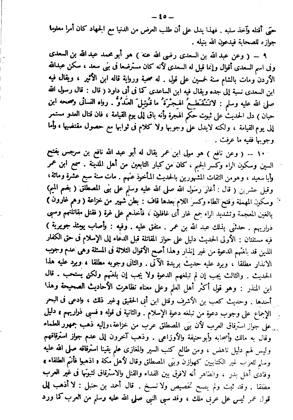 10- وعن نافع هو مولى بن عمر يقال أبو عبد الله نافع بن سرجس بفتح السين وسكون الراء وكسر الجيم كان من كبار التابعين من أهل المدينة سمع ابن عمر وأبا سعيد وهو من الثقات المشهورين بالحديث المأخوذ عنهم مات سنة سبع عشرة ومائة وقيل عشرين قال "أغار رسول الله صلى الله عليه وسلم على بني المصطلق" بضم الميم وسكون المهملة وفتح الطاء وكسر اللام بعدها قاف بطن شهير من خزاعة "وهم غارون" بالغين المعجمة وتشديد الراء جمع غار أي غافلون فأخذهم على غرة "فقتل مقاتلتهم وسبى ذراريهم" حدثني بذلك عبد الله بن عمر متفق عليه وفيه وأصاب يومئذ جويرية فيه مسألتان الأولى الحديث دليل على جواز المقاتلة قبل الدعاء إلى الإسلام في حق الكفار الذين قد بلغتهم الدعوة من غير إنذار وهذا أصح الأقوال الثلاثة في المسألة وهي عدم وجوب الإنذار مطلقا ويرد عليه حديث بريدة الآتي والثاني وجوبه مطلقا ويرد عليه هذا الحديث والثالث يجب إن لم تبلغهم الدعوة ولا يجب إن بلغتهم ولكن يستحب قال ابن المنذر وهو قول أكثر أهل العلم وعلى معناه تظاهرت الأحاديث الصحيحة وهذا أحدها وحديث كعب بن الأشرف وقتل ابن أبي الحقيق وغير ذلك وادعى في البحر الإجماع على وجوب دعوة من لم تبلغه دعوة الإسلام والثانية في قوله فسبى ذراريهم دليل على جواز استرقاق العرب لأن بني المصطلق عرب من خزاعة وإليه ذهب جمهور العلماء وقال به مالك وأصحابه وأبو حنيفة والأوزاعي وذهب آخرون إلى عدم جواز استرقاقهم وليس لهم دليل ناهض ومن طالع كتب السير والمغازي علم يقينا استرقاقه صلى الله عليه وسلم للعرب غير الكتابيين كهوازن وبني المصطلق وقال لأهل مكة "اذهبوا فأنتم الطلقاء" وفادى أهل بدر والظاهر أنه لا فرق بين الفداء والقتل والاسترقاق لثبوتها في غير العرب مطلقا وقد ثبت فيهم ولم يصح تخصيص ولا نسخ قال أحمد بن حنبل: لا أذهب إلى قول عمر ليس على عربي ملك وقد سبى النبي صلى الله عليه وسلم من العرب كما ورد