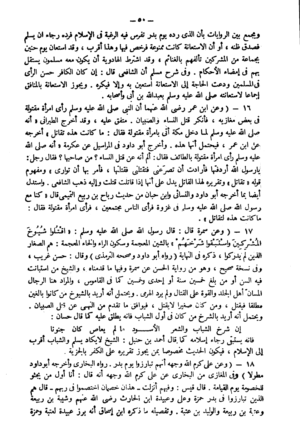 17- وعن سمرة قال قال رسول الله صلى الله عليه سلم: "اقتلوا شيوخ المشركين واستبقوا شرخهم" بالشين المعجمة وسكون الراء والخاء المعجمة هم الصغار الذين لم يدركوا ذكره في النهاية رواه أبو داود وصححه الترمذي وقال حسن غريب وفي نسخة صحيح وهو من رواية الحسن عن سمرة وفيها ما قدمناه والشيخ من استبانت فيه السن أو من بلغ خمسين سنة أو إحدى وخمسين كما في القاموس والمراد هنا الرجال المسان أهل الجلد والقوة على القتال ولم يرد الهرمى ويحتمل أنه أريد بالشيوخ من كانوا بالغين مطلقا فيقتل ومن كان صغيرا لا يقتل فيوافق ما تقدم من النهي عن قتل الصبيان ويحتمل أنه أريد بالشرخ من كان في أول الشباب فإنه يطلق عليه كما قال حسان: