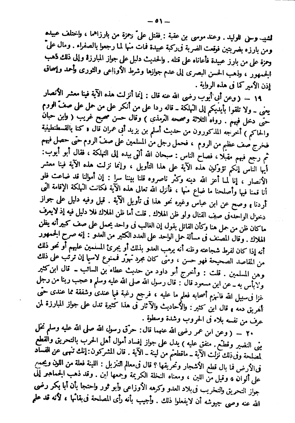 19- وعن أبي أيوب رضي الله عنه قال إنما نزلت هذه الآية فينا معشر الأنصار يعني قوله تعالى: {وَلا تُلْقُوا بِأَيْدِيكُمْ إِلَى التَّهْلُكَةِ} قاله ردا على من أنكر على من حمل على صف الروم حتى دخل فيهم رواه الثلاثة وصححه الترمذي وقال حسن صحيح غريب وابن حبان والحاكم أخرجه المذكورون من حديث أسلم بن يزيد أبي عمران قال كنا بالقسطنطينية فخرج صف عظيم من الروم فحمل رجل من المسلمين على صف الروم حتى حصل فيهم ثم رجع فيهم مقبلا فصاح الناس سبحان الله ألقى بيده إلى التهلكة فقال أبو أيوب أيها الناس إنكم تؤولون هذه الآية على هذا التأويل وإنما نزلت هذه الآية فينا معشر الأنصار إنا لما أعز الله دينه وكثر ناصره قلنا بيننا سرا إن أموالنا قد ضاعت فلو أنا قمنا فيها وأصلحنا ما ضاع منها فأنزل الله تعالى هذه الآية فكانت التهلكة الإقامة التي أردنا وصح عن ابن عباس وغيره نحو هذا في تأويل الآية قيل وفيه دليل على جواز دخول الواحد في صف القتال ولو ظن الهلاك قلت أما ظن الهلاك فلا دليل فيه إذ لا يعرف ما كان ظن من حمل هنا وكأن القائل يقول إن الغالب في واحد يحمل على صف كبير أنه يظن الهلاك وقال المصنف في مسألة حمل الواحد على العدد الكثير من العدو أنه صرح الجمهور أنه إذا كان لفرط شجاعته وظنه أنه يرهب العدو بذلك أو يجرىء المسلمين عليهم أو نحو ذلك من المقاصد الصحيحة فهو حسن ومتى كان مجرد تهور فممنوع لا سيما إن ترتب على ذلك وهن المسلمين قلت وخرج أبو داود من حديث عطاء بن السائب قال ابن كثير ولا بأس به عن ابن مسعود قال قال رسول الله صلى الله عليه وسلم: "عجب ربنا من رجل غزا في سبيل الله فانهزم أصحابه فعلم ما عليه فرجع رغبة فيما عندي وشفقة مما عندي حتى أهريق دمه" قال ابن كثير والأحاديث والآثار في هذا كثيرة تدل على جواز المبارزة لمن عرف من نفسه بلاء في الحروب وشدة وسطوة