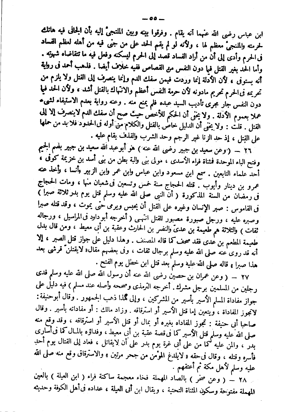 26- وعن سعيد بن جبير رضي الله عنه هو أبو عبد الله سعيد بن جبير بضم الجيم وفتح الباء الموحدة فمثناة فراء الأسدي مولي بني والبة بطن من بني أسد بن خزيمة كوفي أحد علماء التابعين سمع ابن مسعود وابن عباس وابن عمر وابن الزبير وأنسا وأخذ عنه عمرو بن دينار وأيوب قتله الحجاج سنة خمس وتسعين في شعبان منها ومات الحجاج في رمضان من السنة المذكورة "أن النبي صلى الله عليه وسلم قتل يوم بدر ثلاثة صبرا" في القاموس صبر الإنسان وغيره على القتل أن يحبس ويرمى حتى يموت وقد قتله صبرا وصبرا عليه ورجل صبورة مصبور للقتل انتهى أخرجه أبو داود في المراسيل ورجاله ثقات والثلاثة هم طعيمة بن عدي والنضر بن الحارث وعقبة بن أبي معيط ومن قال بدل طعيمة المطعم بن عدي فقد صحف كما قاله المصنف وهذا دليل على جواز قتل الصبر إلا أنه قد روي عنه صلى الله عليه سلم برجال ثقات وفي بعضهم مقال "لا يقتلن قرشي بعد هذا صبرا" قاله صلى الله عليه وسلم بعد قتل ابن الأخطل يوم الفتح