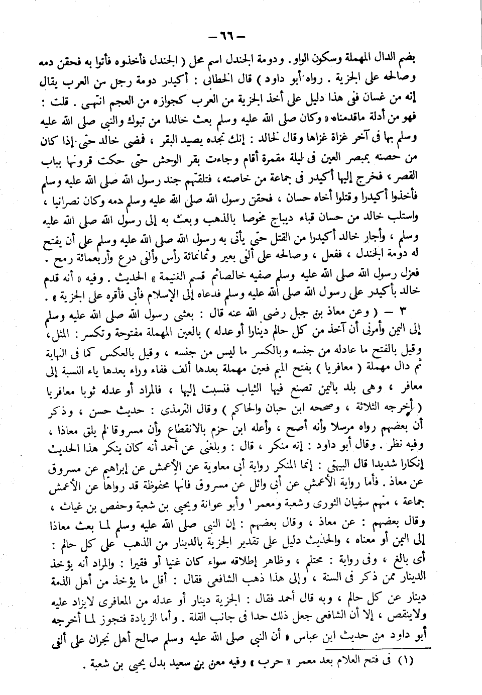 بضم الدال المهملة وسكون الواو ودومة الجندل اسم محل "فأخذوه وأتوا به فحقن له دمه وصالحه على الجزية" رواه أبو داود قال الخطابي أكيدر دومة رجل من العرب يقال إنه من غسان ففي هذا دليل على أخذ الجزية من العرب كجوازه من العجم انتهى قلت فهو من أدلة ما قدمناه وكان صلى الله عليه وسلم بعث خالدا من تبوك والنبي صلى الله عليه وسلم بها في آخر غزاة غزاها وقال لخالد إنك تجده يصيد البقر فمضى خالد حتى إذا كان من حصنه بمبصر العين في ليلة مقمرة أقام وجاءت بقر الوحش حتى حكت قرونها بباب القصر فخرج إليها أكيدر في جماعة من خاصته فتلقتهم جند رسول الله صلى الله عليه وسلم فأخذوا أكيدر وقتلوا أخاه حسان فحقن رسول الله دمه وكان نصرانيا واستلب خالد من حسان قباء ديباج مخوصا بالذهب وبعث به إلى رسول الله صلى الله عليه وسلم وأجار خالد أكيدرا من القتل حتى يأتي به رسول الله صلى الله عليه وسلم على أن يفتح له دومة الجندل ففعل وصالحه على ألفي بعير وثمانمائة رأس وألفي درع وأربعمائة رمح فعزل رسول الله صلى الله عليه وسلم صفيه خالصا ثم قسم الغنيمة الحديث وفيه "أنه قدم على رسول الله صلى الله عليه وسلم فدعاه إلى الإسلام فأبى فأقره على الجزية"