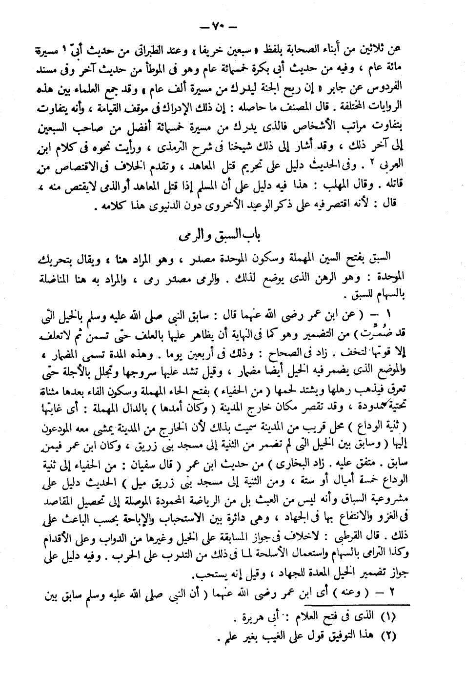 1- عن ابن عمر رضي الله عنهما قال: "سابق النبي صلى الله عليه وسلم بالخيل التي قد ضمرت" من التضمير وهو كما في النهاية أن يظاهر عليها بالعلف حتى تسمن ثم لا تعلف إلا قوتها لتخف زاد في الصحاح وذلك في أربعين يوما وهذه المدة تسمى المضمار والموضع الذي يضمر فيه الخيل أيضا مضمار وقيل تشد عليها سروجها وتجلل بالأجلة حتى تعرق فيذهب رهلها ويشتد لحمها "من الحفياء" بفتح الحاء المهملة وسكون الفاء بعدها مثناة تحتية ممدودة وقد تقصر مكان خارج المدينة "وكان أمدها" بالدال المهملة أي غايتها "ثنية الوداع" محل قريب من المدينة سميت بذلك لأن الخارج من المدينة يمشي معه المودعون إليها "وسابق بين الخيل التي لم تضمر من الثنية إلى مسجد بني زريق وكان ابن عمر فيمن سابق" متفق عليه زاد البخاري من حديث ابن عمر قال سفيان من الحفياء إلى ثنية الوداع خمسة أميال أو ستة ومن الثنية إلى مسجد بني زريق ميل الحديث دليل على مشروعية السباق وأنه ليس من العبث بل من الرياضة المحمودة الموصلة إلى تحصيل المقاصد في الغزو والانتفاع بها في الجهاد وهي دائرة بين الاستحباب والإباحة بحسب الباعث على ذلك قال القرطبي لا خلاف في جواز المسابقة على الخيل وغيرها من الدواب وعلى الأقدام وكذا الترامي بالسهام واستعمال الأسلحة لما في ذلك من التدرب على الحرب وفيه دليل على جواز تضمير الخيل المعدة للجهاد وقيل إنه يستحب