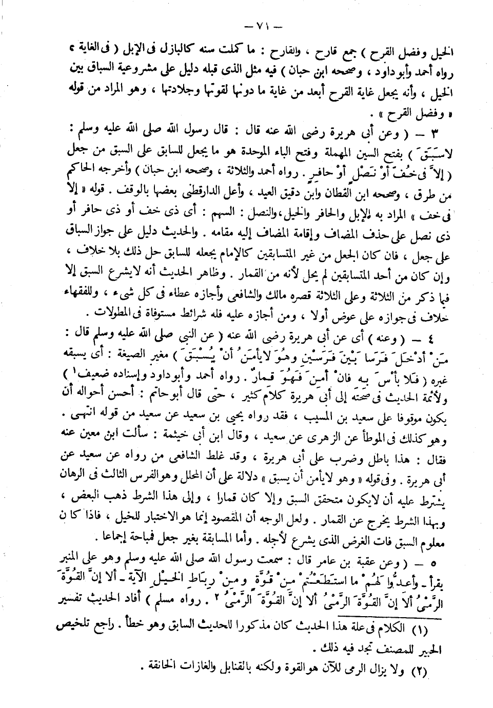 3- وعن أبي هريرة رضي الله عنه قال قال رسول الله صلى الله عليه وسلم: "لا سبق" بفتح السين المهملة وفتح الباء الموحدة هو ما يجعل للسابق على السبق من جعل "إلا في خف أو نصل أو حافر" رواه أحمد والثلاثة وصححه ابن حبان وأخرجه الحاكم من طرق وصححه ابن القطان وابن دقيق العيد وأعل الدارقطني بعضها بالوقف قوله إلا في خف المراد به الإبل والحافر الخيل والنصل السهم أي ذي خف أو ذي حافر أو ذي نصل على حذف المضاف وإقامة المضاف إليه مقامه والحديث دليل على جواز السباق على جعل فإن كان الجعل من غير المتسابقين كالإمام يجعله للسابق حل ذلك بلا خلاف وإن كان من أحد المتسابقين لم يحل لأنه من القمار وظاهر الحديث أنه لا يشرع السبق إلا فيما ذكر من الثلاثة وعلى الثلاثة قصره مالك والشافعي وأجازه عطاء في كل شيء وللفقهاء خلاف في جوازه على عوض أو لا ومن أجازه عليه فله شرائط مستوفاة في المطولات