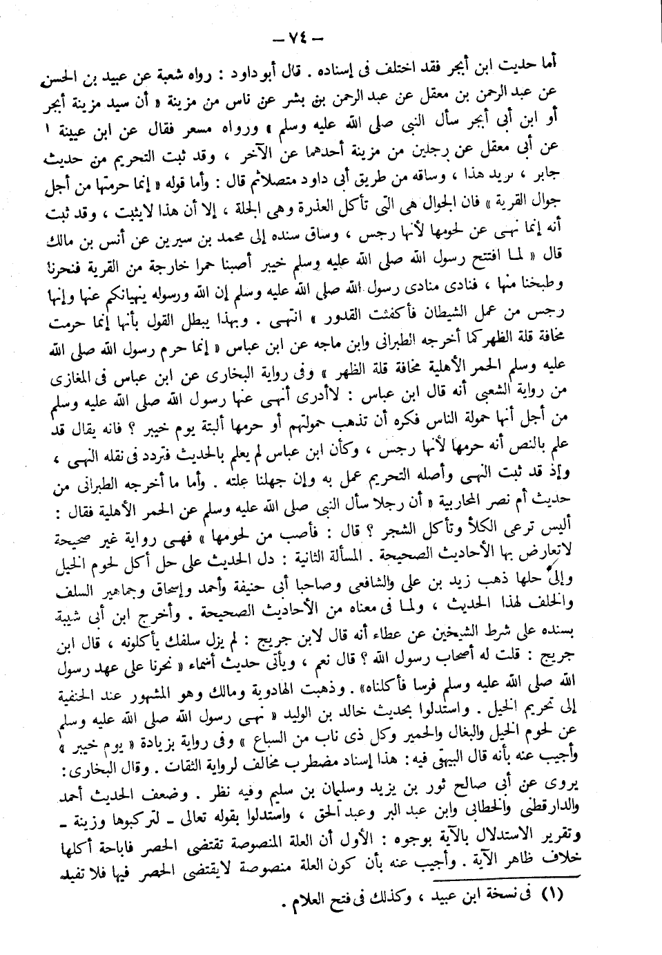 أما حديث ابن أبجر فقد اختلف في إسناده قال أبو داود رواه شعبة عن عبيد بن الحسن عن عبد الرحمن بن معقل عن عبد الرحمن بن بشر عن ناس من مزينة أن سيد مزين أبجر أو ابن أبي أبجر سأل النبي صلى الله عليه وسلم ورواه مسعر فقال عن ابن عيينة عن أبي معقل عن رجلين من مزينة أحدهما عن الآخر وقد ثبت التحريم من حديث جابر يريد هذا وساقه من طريق أبي داود متصلا ثم قال وأما قوله إنما حرمتها من أجل جوال القرية فإن الجوال هي التي تأكل العذرة وهي الجلة إلا أن هذا لا يثبت وقد ثبت أنه إنما نهى عن لحومها لأنها رجس وساق سنده إلى محمد بن سيرين عن أنس بن مالك قال لما افتتح رسول الله صلى الله عليه وسلم خيبر أصبنا حمرا خارجة من القرية فنحرنا وطبخنا منها فنادى منادي رسول الله صلى الله عليه وسلم "إن الله ورسوله ينهيانكم عنها وإنها رجس من عمل الشيطان فأكفئت القدور انتهى " وبهذا يبطل القول بأنها إنما حرمت مخافة قلة الظهر كما أخرجه الطبراني وابن ماجه عن ابن عباس إنما حرم رسول الله صلى الله عليه وسلم الحمر الأهلية مخافة قلة الظهر وفي رواية البخاري عن ابن عباس في المغازي من رواية الشعبي أنه قال ابن عباس لا أدري أنهى عنها رسول الله صلى الله عليه وسلم من أجل أنها حمولة الناس فكره أن تذهب حمولتهم أو حرمها ألبتة يوم خيبر فإنه يقال قد علم بالنص أنه حرمها لأنها رجس وكأن ابن عباس لم يعلم بالحديث فتردد في نقله النهي وإذ قد ثبت النهي وأصله التحريم عمل به وإن جهلنا علته وأما ما أخرجه الطبراني من حديث أم نصر المحاربية أن رجلا سأل النبي صلى الله عليه وسلم عن الحمر الأهلية فقال: "أليس ترعى الكلأ وتأكل الشجر قال فأصب من لحومها" فهي رواية غير صحيحة لا تعارض بها الأحاديث الصحيحة