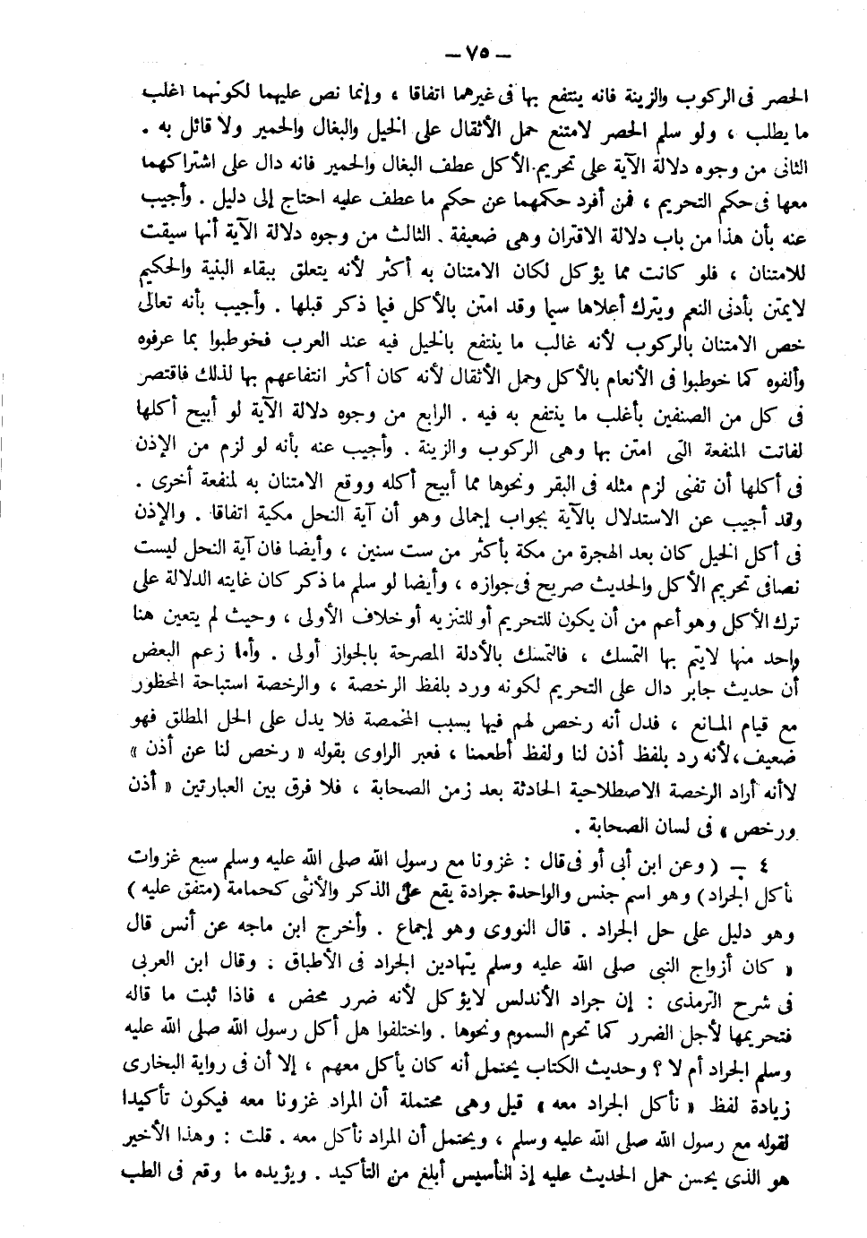 4- وعن ابن أبي أوفى قال: "غزونا مع رسول الله صلى الله عليه وسلم سبع غزوات نأكل الجراد" وهو اسم جنس والواحدة جرادة يقع على الذكر والأنثى كحمامة متفق عليه وهو دليل على حل الجراد قال النووي: وهو إجماع وأخرج ابن ماجه عن أنس قال كان أزواج النبي صلى الله عليه وسلم يتهادين الجراد في الأطباق وقال ابن العربي في شرح الترمذي: إن جراد الأندلس لا يؤكل لأنه ضرر محض فإذا ثبت ما قاله فتحريمها لأجل الضرر كما تحرم السموم ونحوها واختلفوا هل أكل رسول الله صلى الله عليه وسلم الجراد أم لا وحديث الكتاب يحتمل أنه كان يأكل معهم إلا أن في رواية البخاري زيادة لفظ "نأكل الجراد معه" قيل وهي محتملة أن المراد غزونا معه فيكون تأكيدا لقوله مع رسول الله صلى الله عليه وسلم ويحتمل أن المراد نأكل معه قلت وهذا الأخير هو الذي يحسن حمل الحديث عليه إذ التأسيس أبلغ من التأكيد ويؤيده ما وقع في الطب