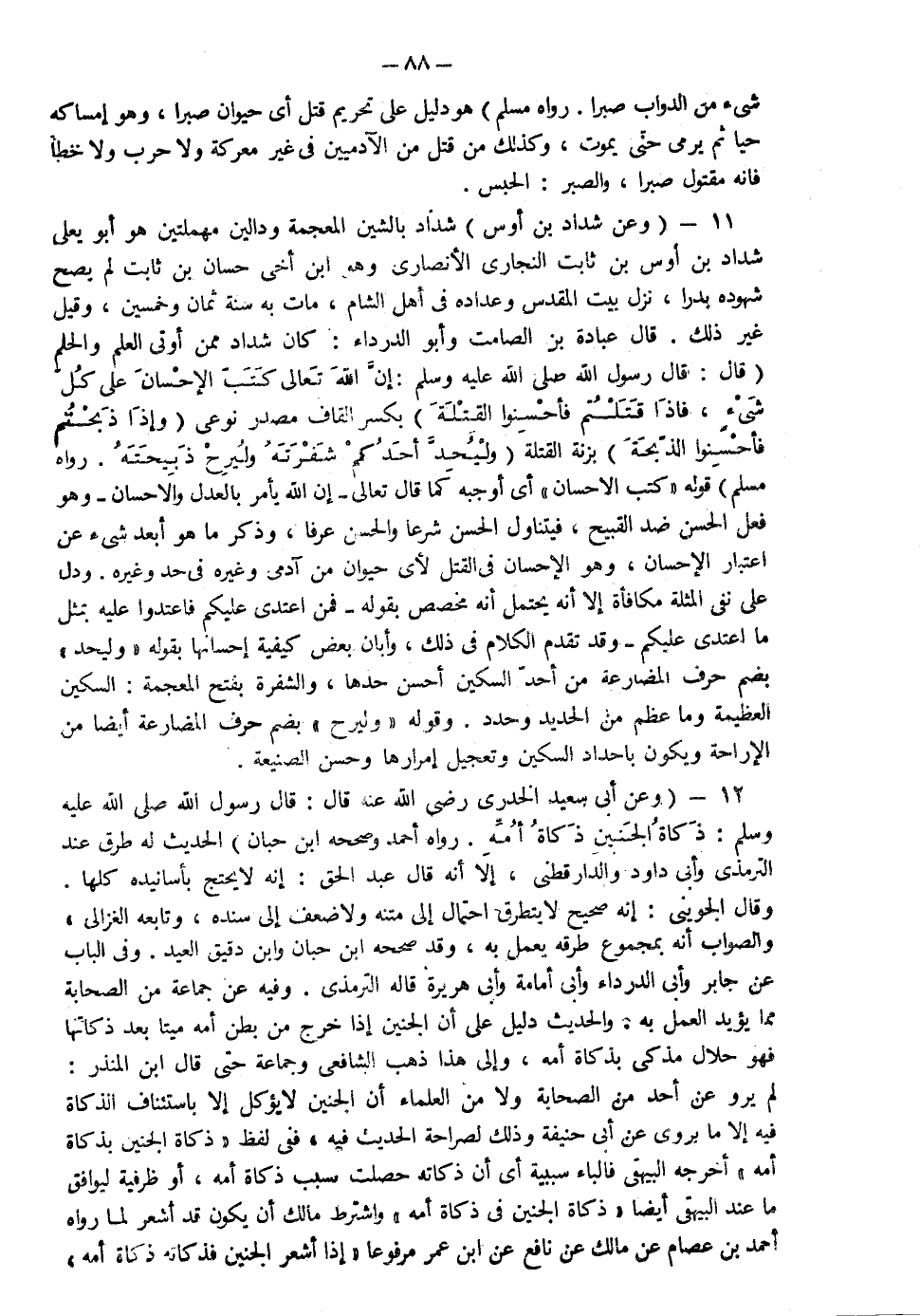 11- وعن شداد بن أوس شداد بالشين المعجمة ودالين مهملتين هو أبو يعلى شداد بن أوس بن ثابت النجاري الأنصاري وهو ابن أخي حسان بن ثابت لم يصح شهوده بدرا نزل بيت المقدس وعداده في أهل الشام مات به سنة ثمان وخمسين وقيل غير ذلك قال عبادة بن الصامت وأبو الدرداء كان شداد ممن أوتي العلم والحلم قال قال رسول الله صلى الله عليه وسلم: "إن الله تعالى كتب الإحسان على كل شيء فإذا قتلتم فأحسنوا القتلة بكسر القاف مصدر نوعي "وإذا ذبحتم فأحسنوا الذبحة" بزنة القتلة "وليحد أحدكم شفرته وليرح ذبيحته" رواه مسلم قوله كتب الإحسان أي أوجبه كما قال تعالى: {إِنَّ اللَّهَ يَأْمُرُ بِالْعَدْلِ وَالإِحْسَانِ} وهو فعل الحسن ضد القبيح فيتناول الحسن شرعا والحسن عرفا وذكر ما هو أبعد شيء عن اعتبار الإحسان وهو الإحسان في القتل لأي حيوان من آدمي وغيره في حد وغيره ودل على نفي المثلة مكافأة إلا أنه يحتمل أنه مخصص بقوله: {فَمَنِ اعْتَدَى عَلَيْكُمْ فَاعْتَدُوا عَلَيْهِ بِمِثْلِ مَا اعْتَدَى عَلَيْكُمْ} وقد تقدم الكلام في ذلك وأبان بعض كيفية إحسانها بقوله وليحد بضم حرف المضارعة من أحد السكين أحسن حدها والشفرة بفتح المعجمة السكين العظيمة وما عظم من الحديد وحدد وقوله وليرح بضم حرف المضارعة أيضا من الإراحة ويكون بإحداد السكين وتعجيل إمرارها وحسن الصنيعة