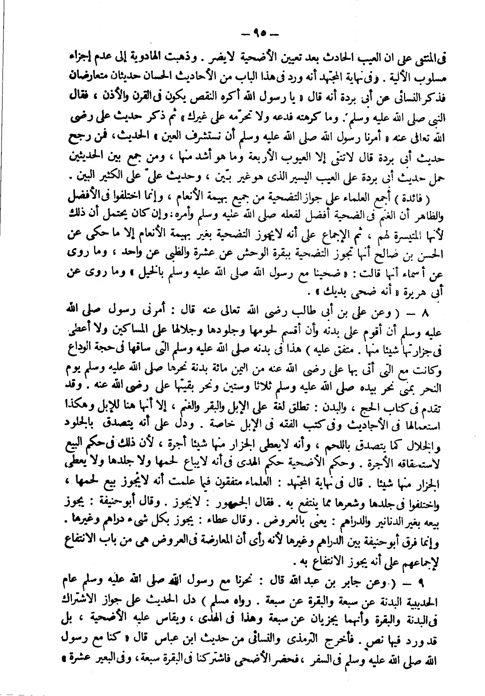 8- وعن علي بن أبي طالب رضي الله عنه قال: "أمرني رسول الله صلى الله عليه وسلم أن أقوم على بدنه وأن أقسم لحومها وجلودها وجلالها على المساكين ولا أعطي في جزارتها شيئا منها" متفق عليه هذا في بدنه صلى الله عليه وسلم التي ساقها في حجة الوداع وكانت مع التي أتى بها علي رضي الله عنه من اليمن مائة بدنة نحرها صلى الله عليه وسلم يوم النحر بمنى نحر بيده صلى الله عليه سلم ثلاثا وستين ونحر بقيتها علي رضي الله عنه وقد تقدم في كتاب الحج والبدن تطلق لغة على الإبل والبقر والغنم إلا أنها هنا للإبل وهكذا استعمالها في أحاديث وفي كتب الفقه في الإبل خاصة ودل على أنه يتصدق بالجلود والجلال كما يتصدق باللحم وأنه لا يعطي الجزار منها شيئا أجرة لأن ذلك في حكم البيع لاستحقاقه الأجرة وحكم الأضحية حكم الهدي في أنه لا يباع لحمها ولا جلدها ولا يعطى الجزار منها شيئا قال في نهاية المجتهد العلماء متفقون فيما علمت أنه لا يجوز بيع لحمها واختلفوا في جلدها وشعرها مما ينتفع به فقال الجمهور لا يجوز وقال أبو حنيفة يجوز بيعه بغير الدنانير والدراهم يعني بالعروض وقال عطاء يجوز بكل شيء دراهم وغيرها وإنما فرق أبو حنيفة بين الدراهم وغيرها لأنه رأى أن المعاوضة في العروض هي من باب الانتفاع لإجماعهم على أنه يجوز الانتفاع به