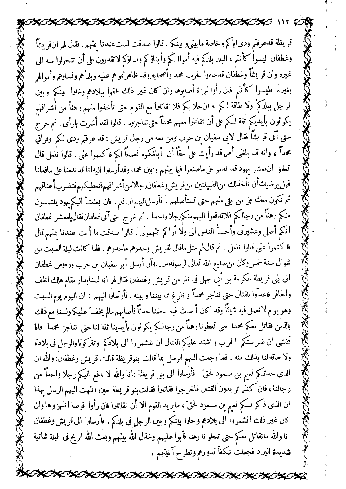 قُرَيْظَةَ قَدْ عَرَفْتُمْ وُدِّي إِيَّاكُمْ وَخَاصَّةَ مَا بَيْنِي وَبَيْنَكُمْ. قَالُوا صَدَقْتَ لَسْتَ عِنْدَنَا بِمُتَّهَمٍ. فَقَالَ لَهُمْ إِنَّ قُرَيْشًا وَغَطَفَانَ لَيْسُوا كَأَنْتُمْ، الْبَلَدُ بَلَدُكُمْ فِيهِ أَمْوَالُكُمْ وَأَبْنَاؤُكُمْ وَنِسَاؤُكُمْ لَا تَقْدِرُونَ عَلَى أَنْ تَتَحَوَّلُوا مِنْهُ إِلَى غَيْرِهِ وَإِنَّ قُرَيْشًا وَغَطَفَانَ قَدْ جَاءُوا لِحَرْبِ مُحَمَّدٍ وَأَصْحَابِهِ وَقَدْ ظَاهَرْتُمُوهُمْ عَلَيْهِ وَبَلَدُهُمْ وَنِسَاؤُهُمْ وَأَمْوَالُهُمْ بِغَيْرِهِ فَلَيْسُوا كَأَنْتُمْ فَإِنْ رَأَوْا نُهْزَةً أَصَابُوهَا وَإِنْ كَانَ غَيْرُ ذَلِكَ لَحِقُوا بِبِلَادِهِمْ وَخَلَّوْا بَيْنَكُمْ وَبَيْنَ الرَّجُلِ بِبَلَدِكُمْ وَلَا طَاقَةَ لَكُمْ بِهِ إِنْ خَلَا بِكُمْ فَلَا تُقَاتِلُوا مَعَ الْقَوْمِ حَتَّى تَأْخُذُوا مِنْهُمْ رَهْنًا مِنْ أَشْرَافِهِمْ يَكُونُونَ بِأَيْدِيكُمْ ثِقَةً لَكُمْ عَلَى أَنْ تُقَاتِلُوا مَعَهُمْ مُحَمَّدًا حَتَّى تُنَاجِزُوهُ. قَالُوا لَقَدْ أَشَرْتَ بِالرَّأْيِ. ثُمَّ خَرَجَ حَتَّى أَتَى قُرَيْشًا فَقَالَ لِأَبِي سُفْيَانَ بْنِ حَرْبٍ وَمَنْ مَعَهُ مِنْ رِجَالِ قُرَيْشٍ: قَدْ عَرَفْتُمْ وُدِّي لَكُمْ وَفِرَاقِي مُحَمَّدًا، وَإِنَّهُ قَدْ بَلَغَنِي أَمْرٌ قَدْ رَأَيْتُ عَلَيَّ حَقًّا أَنْ أُبَلِّغَكُمُوهُ نُصْحًا لَكُمْ فَاكْتُمُوا عَنِّي. قَالُوا نَفْعَلُ قَالَ تَعْلَمُوا أَنَّ مَعْشَرَ يَهُودَ قَدْ نَدِمُوا عَلَى مَا صَنَعُوا فِيمَا بَيْنَهُمْ وَبَيْنَ مُحَمَّدٍ وَقَدْ أَرْسَلُوا إِلَيْهِ أَنَّا قَدْ نَدِمْنَا عَلَى مَا فَعَلْنَا فَهَلْ يُرْضِيكَ أَنْ نَأْخُذَ لَكَ مِنَ الْقَبِيلَتَيْنِ مِنْ قُرَيْشٍ وَغَطَفَانَ رِجَالًا مِنْ أَشْرَافِهِمْ فَنُعْطِيَكَهُمْ فَتَضْرِبَ أَعْنَاقَهُمْ ثُمَّ نَكُونَ مَعَكَ عَلَى مَنْ بَقِيَ مِنْهُمْ حَتَّى تَسْتَأْصِلَهُمْ. فَأَرْسَلَ إِلَيْهِمْ أَنْ نَعَمْ. فَإِنْ بَعَثَتْ إِلَيْكُمْ يَهُودُ يَلْتَمِسُونَ مِنْكُمْ رَهْنًا مِنْ رِجَالِكُمْ فَلَا تَدْفَعُوا إِلَيْهِمْ مِنْكُمْ رَجُلًا وَاحِدًا. ثُمَّ خَرَجَ حَتَّى أَتَى غَطَفَانَ فَقَالَ يَا مَعْشَرَ غَطَفَانَ إِنَّكُمْ أَصْلِي وَعَشِيرَتِي وَأَحَبُّ النَّاسِ إِلَيَّ وَلَا أَرَاكُمْ تَتَّهِمُونِي. قَالُوا صَدَقْتَ مَا أَنْتَ عِنْدَنَا بِمُتَّهَمٍ قَالَ فَاكْتُمُوا عَنِّي قَالُوا نَفْعَلُ. ثُمَّ قَالَ لَهُمْ مِثْلَ مَا قَالَ لِقُرَيْشٍ وَحَذَّرَهُمْ مَا حَذَّرَهُمْ. فَلَمَّا كَانَتْ لَيْلَةُ السَّبْتِ مِنْ شَوَّالٍ سَنَةَ خَمْسٍ وَكَانَ مِنْ صنيع اللَّهِ تَعَالَى لِرَسُولِهِ صَلَّى اللَّهُ عَلَيْهِ وَسَلَّمَ أَنْ أَرْسَلَ أَبُو سُفْيَانَ بْنُ حَرْبٍ وَرُءُوسُ غَطَفَانَ إِلَى بَنِي قُرَيْظَةَ عِكْرِمَةَ بْنَ أَبِي جَهْلٍ فِي نَفَرٍ مِنْ قُرَيْشٍ وَغَطَفَانَ فَقَالَ لهم انا لسنابدار مقام هَلَكَ الْخُفُّ وَالْحَافِرُ فَأَعِدُّوا لِلْقِتَالِ حَتَّى نُنَاجِزَ مُحَمَّدًا وَنَفْرُغُ مِمَّا بَيْنَنَا وَبَيْنَهُ. فَأَرْسَلُوا إِلَيْهِمْ: إِنَّ الْيَوْمَ يَوْمُ السَّبْتِ وَهُوَ يَوْمٌ لَا نَعْمَلُ فِيهِ شَيْئًا وَقَدْ كَانَ أَحْدَثَ فِيهِ بَعْضُنَا حَدَثًا فَأَصَابَهُمْ مَا لَمْ يَخْفَ عَلَيْكُمْ وَلَسْنَا مَعَ ذَلِكَ بِالَّذِينِ نُقَاتِلُ مَعَكُمْ مُحَمَّدًا حَتَّى تُعْطُونَا رُهُنًا مِنْ رِجَالِكُمْ يَكُونُونَ بِأَيْدِينَا ثِقَةً لَنَا حَتَّى نُنَاجِزَ مُحَمَّدًا فَإِنَّا نَخْشَى إِنْ ضَرَّسَتْكُمُ الْحَرْبُ وَاشْتَدَّ عَلَيْكُمُ الْقِتَالُ أَنْ تَنْشَمِرُوا إِلَى بِلَادِكُمْ وَتَتْرُكُونَا وَالرَّجُلَ فِي بِلَادِنَا وَلَا طَاقَةَ لَنَا بِذَلِكَ مِنْهُ. فَلَمَّا رَجَعَتْ إِلَيْهِمُ الرُّسُلُ بِمَا قَالَتْ بَنُو قُرَي