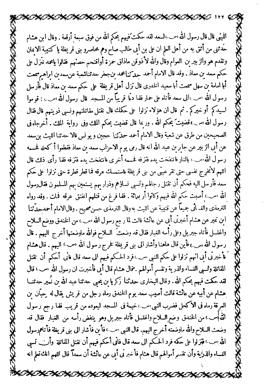 اللَّيْثِيِّ قَالَ قَالَ رَسُولُ اللَّهِ صَلَّى اللَّهُ عَلَيْهِ وَسَلَّمَ لِسَعْدٍ لَقَدْ حَكَمْتَ فِيهِمْ بِحُكْمِ اللَّهِ مِنْ فَوْقِ سَبْعَةِ أَرْقِعَةٍ. وَقَالَ ابْنُ هِشَامٍ حَدَّثَنِي مَنْ أَثِقُ بِهِ مِنْ أَهْلِ الْعِلْمِ أَنَّ عَلِيَّ بْنَ أَبِي طَالِبٍ صَاحَ وَهُمْ مُحَاصِرُو بَنِي قُرَيْظَةَ يَا كَتِيبَةَ الْإِيمَانِ وَتَقَدَّمَ هُوَ وَالزُّبَيْرُ بْنُ الْعَوَّامِ وَقَالَ وَاللَّهِ لَأَذُوقَنَّ مَا ذَاقَ حَمْزَةُ أَوْ أَقْتَحِمُ حِصْنَهُمْ فَقَالُوا يَا مُحَمَّدُ نَنْزِلُ عَلَى حُكْمِ سَعْدِ بْنِ مُعَاذٍ. وَقَدْ قَالَ الْإِمَامُ أَحْمَدُ حَدَّثَنَا مُحَمَّدُ بْنُ جَعْفَرٍ حَدَّثَنَا شُعْبَةُ عَنْ سَعْدِ بْنِ إِبْرَاهِيمَ سَمِعْتُ أَبَا أُمَامَةَ بْنَ سَهْلٍ سَمِعْتُ أَبَا سَعِيدٍ الْخُدْرِيَّ قَالَ نَزَلَ أَهْلُ قُرَيْظَةَ عَلَى حُكْمِ سَعْدِ بْنِ مُعَاذٍ قَالَ فَأَرْسَلَ رَسُولُ اللَّهِ صَلَّى اللَّهُ عَلَيْهِ وَسَلَّمَ إِلَى سَعْدٍ فَأَتَاهُ عَلَى حِمَارٍ فَلَمَّا دَنَا قَرِيبًا مِنَ الْمَسْجِدِ قَالَ رَسُولُ اللَّهِ صَلَّى اللَّهُ عَلَيْهِ وَسَلَّمَ: قُومُوا لِسَيِّدِكُمْ أَوْ خَيْرِكُمْ. ثُمَّ قَالَ إِنَّ هَؤُلَاءِ نَزَلُوا عَلَى حُكْمِكَ قال نقتل مقاتلتهم ونسبي ذُرِّيَّتَهُمْ قَالَ فَقَالَ رَسُولُ اللَّهِ صَلَّى اللَّهُ عَلَيْهِ وَسَلَّمَ قَضَيْتَ بِحُكْمِ اللَّهِ. وَرُبَّمَا قَالَ قَضَيْتَ بِحُكْمِ الْمَلِكِ وَفِي رِوَايَةٍ الْمَلَكِ. أَخْرَجَاهُ فِي الصَّحِيحَيْنِ مِنْ طُرُقٍ عَنْ شُعْبَةَ وَقَالَ الْإِمَامُ أَحْمَدُ حَدَّثَنَا حُجَيْنٌ وَيُونُسُ قَالَا حَدَّثَنَا اللَّيْثُ بْنُ سَعْدٍ عَنْ أَبِي الزُّبَيْرِ عَنْ جَابِرِ بْنِ عَبْدِ اللَّهِ أَنَّهُ قَالَ رُمِيَ يَوْمَ الْأَحْزَابِ سَعْدُ بْنُ مُعَاذٍ فَقَطَعُوا أَكْحَلَهُ فَحَسَمَهُ رَسُولُ اللَّهِ صَلَّى اللَّهُ عَلَيْهِ وَسَلَّمَ بِالنَّارِ فَانْتَفَخَتْ يَدُهُ فَنَزَفَهُ فَحَسَمَهُ أُخْرَى فَانْتَفَخَتْ يَدُهُ فَنَزَفَهُ فَلَمَّا رَأَى ذَلِكَ قَالَ اللَّهمّ لَا تُخْرِجْ نَفْسِي حَتَّى تُقِرَّ عَيْنِي مِنْ بَنِي قُرَيْظَةَ فَاسْتَمْسَكَ عِرْقُهُ فَمَا قَطَرَ قَطْرَةً حَتَّى نَزَلُوا عَلَى حُكْمِ سَعْدٍ فَأَرْسَلَ إِلَيْهِ فَحَكَمَ أَنْ تُقْتَلَ رِجَالُهُمْ وَتُسْبَى نِسَاؤُهُمْ وَذَرَارِيُّهِمْ يَسْتَعِينُ بِهِمُ الْمُسْلِمُونَ فَقَالَ رَسُولُ اللَّهِ صَلَّى اللَّهُ عَلَيْهِ وَسَلَّمَ أَصَبْتَ حُكْمَ اللَّهِ فِيهِمْ وَكَانُوا أَرْبَعَمِائَةٍ. فَلَمَّا فَرَغَ مِنْ قَتْلِهِمْ انْفَتَقَ عِرْقُهُ فَمَاتَ. وَقَدْ رَوَاهُ التِّرْمِذِيُّ وَالنَّسَائِيُّ جَمِيعًا عَنْ قُتَيْبَةَ عَنِ اللَّيْثِ بِهِ وَقَالَ التِّرْمِذِيُّ حَسَنٌ صَحِيحٌ. وَقَالَ الْإِمَامُ أَحْمَدُ حَدَّثَنَا ابْنَ نُمَيْرٍ عَنْ هِشَامٍ أَخْبَرَنِي أَبِي عَنْ عَائِشَةَ قَالَتْ لَمَّا رَجَعَ رَسُولُ اللَّهِ صَلَّى اللَّهُ عَلَيْهِ وَسَلَّمَ مِنَ الْخَنْدَقِ وَوَضَعَ السِّلَاحَ وَاغْتَسَلَ فَأَتَاهُ جِبْرِيلُ وَعَلَى رَأْسِهِ الْغُبَارُ فَقَالَ قَدْ وضعت السلاح فو الله مَا وَضَعْتُهَا اخْرُجْ إِلَيْهِمْ. قَالَ رَسُولُ اللَّهِ صَلَّى اللَّهُ عَلَيْهِ وَسَلَّمَ فَأَيْنَ قَالَ هَاهُنَا وَأَشَارَ إِلَى بَنِي قُرَيْظَةَ فَخَرَجَ رَسُولُ اللَّهِ صَلَّى اللَّهُ عَلَيْهِ وَسَلَّمَ إِلَيْهِمْ. قَالَ هِشَامٌ فَأَخْبَرَنِي أَبِي أَنَّهُمْ نَزَلُوا عَلَى حُكْمِ النَّبِيِّ صَلَّى اللَّهُ عَلَيْهِ وَسَلَّمَ فَرَدَّ الْحُكْمَ فِيهِمْ إِلَى سَعْدٍ قَالَ فَإِنِّي أَحْكُمُ أَنْ تُقْتَلَ الْمُقَاتِلَةُ وَتُسْبَى النِّسَاءُ وَالذُّرِّيَّةُ وَتُقْسَمَ أَمْوَالُهُمْ. قَالَ هِشَامٌ قَالَ أَبِي فَأُخْبِرْتُ أَنَّ رَسُولَ اللَّهِ صَلَّى 