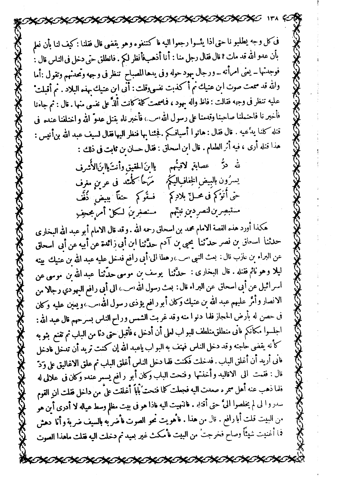 هَكَذَا أَوْرَدَ هَذِهِ الْقِصَّةَ الْإِمَامُ مُحَمَّدُ بْنُ إِسْحَاقَ رَحِمَهُ اللَّهُ. وَقَدْ قَالَ الْإِمَامُ أَبُو عَبْدِ اللَّهِ الْبُخَارِيُّ حَدَّثَنَا إِسْحَاقُ بْنُ نَصْرٍ حَدَّثَنَا يَحْيَى بْنُ آدَمَ حَدَّثَنَا ابْنُ أَبِي زَائِدَةَ عَنْ أَبِيهِ عَنْ أَبِي إِسْحَاقَ عَنِ الْبَرَاءِ بْنِ عَازِبٍ قَالَ: بُعِثَ النَّبِيُّ صَلَّى اللَّهُ عَلَيْهِ وَسَلَّمَ رَهْطًا إِلَى أَبِي رَافِعٍ فَدَخَلَ عَلَيْهِ عَبْدُ اللَّهِ بْنُ عَتِيكٍ بَيْتَهُ لَيْلًا وَهُوَ نَائِمٌ فَقَتَلَهُ. قَالَ البخاري: حدّثنا يوسف بن موسى حدّثنا عبد اللَّهِ بْنِ مُوسَى عَنْ إِسْرَائِيلُ عَنْ أَبِي إِسْحَاقَ عَنِ الْبَرَاءِ قَالَ: بَعَثَ رَسُولُ اللَّهِ صَلَّى اللَّهُ عَلَيْهِ وَسَلَّمَ إِلَى أَبِي رَافِعٍ الْيَهُودِيِّ رِجَالًا مِنَ الْأَنْصَارِ وَأَمَّرَ عَلَيْهِمْ عَبْدَ اللَّهِ بْنَ عَتِيكٍ وَكَانَ أَبُو رَافِعٍ يُؤْذِي رَسُولَ اللَّهِ صَلَّى اللَّهُ عَلَيْهِ وَسَلَّمَ وَيُعِينُ عَلَيْهِ وَكَانَ فِي حِصْنٍ لَهُ بِأَرْضِ الْحِجَازِ فَلَمَّا دَنَوْا مِنْهُ وَقَدْ غَرَبَتِ الشَّمْسُ وَرَاحَ الناس بسرحهم قال عبد الله: