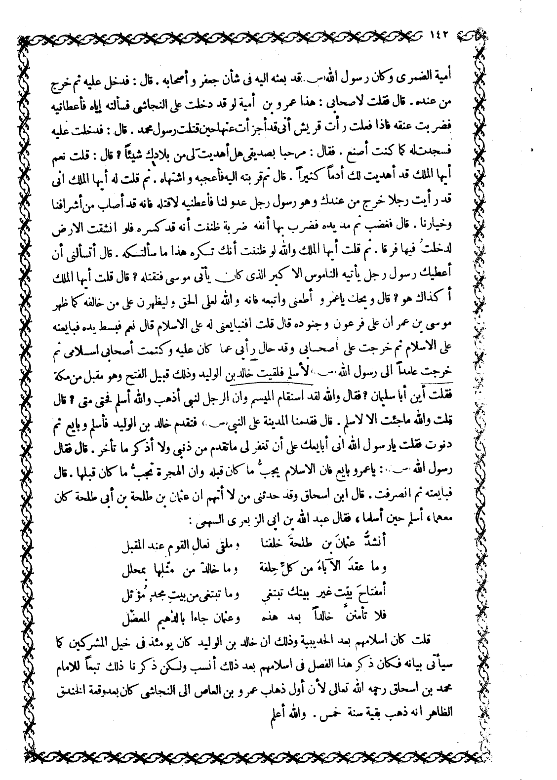 أُمَيَّةَ الضَّمْرِيُّ وَكَانَ رَسُولُ اللَّهِ صَلَّى اللَّهُ عَلَيْهِ وَسَلَّمَ قَدْ بَعَثَهُ إِلَيْهِ فِي شَأْنِ جَعْفَرٍ وَأَصْحَابِهِ. قَالَ: فَدَخَلَ عَلَيْهِ ثُمَّ خَرَجَ مِنْ عِنْدِهِ. قَالَ فَقُلْتُ لِأَصْحَابِي: هَذَا عَمْرُو بْنُ أُمَيَّةَ لَوْ قَدْ دَخَلْتُ عَلَى النَّجَاشِيِّ فَسَأَلْتُهُ إِيَّاهُ فَأَعْطَانِيهِ فَضَرَبْتُ عُنُقَهُ فَإِذَا فَعَلْتُ رَأَتْ قُرَيْشٌ أَنِّي قَدْ أَجْزَأْتُ عَنْهَا حِينَ قَتَلْتُ رَسُولَ مُحَمَّدٍ. قَالَ فَدَخَلْتُ عَلَيْهِ فَسَجَدْتُ لَهُ كَمَا كُنْتُ أَصْنَعُ. فَقَالَ: مَرْحَبًا بِصَدِيقِي هَلْ أَهْدَيْتَ لِي مِنْ بِلَادِكَ شَيْئًا؟ قَالَ: قُلْتُ نَعَمْ أَيُّهَا الْمَلِكُ قَدْ أَهْدَيْتُ لَكَ أَدَمًا كَثِيرًا. قَالَ ثُمَّ قَرَّبْتُهُ إِلَيْهِ فَأَعْجَبَهُ وَاشْتَهَاهُ. ثُمَّ قُلْتُ لَهُ أَيُّهَا الْمَلِكُ إِنِّي قَدْ رَأَيْتُ رَجُلًا خَرَجَ مِنْ عِنْدِكَ وَهُوَ رَسُولُ رَجُلٍ عَدُوٍّ لَنَا فَأَعْطِنِيهِ لِأَقْتُلَهُ فَإِنَّهُ قَدْ أَصَابَ مِنْ أَشْرَافِنَا وَخِيَارِنَا. قَالَ فَغَضِبَ ثُمَّ مَدَّ يَدَهُ فَضَرَبَ بِهَا أَنْفَهُ ضَرْبَةً ظَنَنْتُ أَنَّهُ قَدْ كَسَرَهُ فَلَوِ انْشَقَّتِ الْأَرْضُ لدخلت فيها فرقا. ثم قلت أَيُّهَا الْمَلِكُ وَاللَّهِ لَوْ ظَنَنْتُ أَنَّكَ تَكْرَهُ هَذَا مَا سَأَلْتُكَهُ. قَالَ أَتَسْأَلُنِي أَنْ أُعْطِيَكَ رَسُولَ رَجُلٍ يَأْتِيهِ النَّامُوسُ الْأَكْبَرُ الَّذِي كَانَ يأتى موسى فقتله؟ قَالَ قُلْتُ أَيُّهَا الْمَلِكُ أَكَذَاكَ هُوَ؟ قَالَ وَيْحَكَ يَا عَمْرُو أَطِعْنِي وَاتَّبِعْهُ فَإِنَّهُ وَاللَّهِ لَعَلَى الْحَقِّ وَلَيَظْهَرَنَّ عَلَى مَنْ خَالَفَهُ كَمَا ظَهَرَ مُوسَى بْنُ عِمْرَانَ عَلَى فِرْعَوْنَ وَجُنُودِهِ قَالَ قُلْتُ أَفَتُبَايِعُنِي لَهُ عَلَى الْإِسْلَامِ قَالَ نَعَمْ فَبَسَطَ يَدَهُ فَبَايَعْتُهُ عَلَى الْإِسْلَامِ ثُمَّ خَرَجْتُ عَلَى أَصْحَابِي وَقَدْ حَالَ رَأْيِي عَمَّا كَانَ عَلَيْهِ وَكَتَمْتُ أَصْحَابِي إِسْلَامِي ثُمَّ خَرَجْتُ عَامِدًا إِلَى رَسُولِ اللَّهِ صَلَّى اللَّهُ عَلَيْهِ وَسَلَّمَ لِأُسْلِمَ فَلَقِيتُ خَالِدَ بْنَ الْوَلِيدِ وَذَلِكَ قُبَيْلَ الْفَتْحِ وَهُوَ مُقْبِلٌ مِنْ مَكَّةَ فَقُلْتُ أَيْنَ أَبَا سُلَيْمَانَ؟ فَقَالَ وَاللَّهِ لَقَدِ اسْتَقَامَ الميسم وان الرجل لنبي أذهب والله أسلم فَحَتَّى مَتَى؟ قَالَ قُلْتُ وَاللَّهِ مَا جِئْتُ إِلَّا لِأُسْلِمَ. قَالَ فَقَدِمْنَا الْمَدِينَةَ عَلَى النَّبِيِّ صَلَّى اللَّهُ عَلَيْهِ وَسَلَّمَ فَتَقَدَّمَ خَالِدُ بْنُ الْوَلِيدِ فَأَسْلَمَ وَبَايَعَ ثُمَّ دَنَوْتُ فَقُلْتُ يَا رَسُولَ اللَّهِ إِنِّي أُبَايِعُكَ عَلَى أَنْ تَغْفِرَ لِي مَا تَقَدَّمَ مِنْ ذَنْبِي وَلَا أَذْكُرُ مَا تَأَخَّرَ. قَالَ فَقَالَ رَسُولُ اللَّهِ صَلَّى اللَّهُ عَلَيْهِ وَسَلَّمَ: يَا عَمْرُو بَايِعْ فَإِنَّ الْإِسْلَامَ يَجُبُّ مَا كَانَ قَبْلَهُ وَإِنَّ الْهِجْرَةَ تَجُبُّ مَا كَانَ قَبْلَهَا. قَالَ فَبَايَعْتُهُ ثُمَّ انْصَرَفْتُ. قَالَ ابْنُ إِسْحَاقَ وَقَدْ حَدَّثَنِي مَنْ لَا أَتَّهِمُ أَنَّ عُثْمَانَ بْنَ طَلْحَةَ بْنِ أَبِي طَلْحَةَ كَانَ مَعَهُمَا، أَسْلَمَ حِينَ أَسْلَمَا، فَقَالَ عَبْدُ اللَّهِ بْنُ أَبِي الزِّبَعْرَى السَّهْمِيُّ: