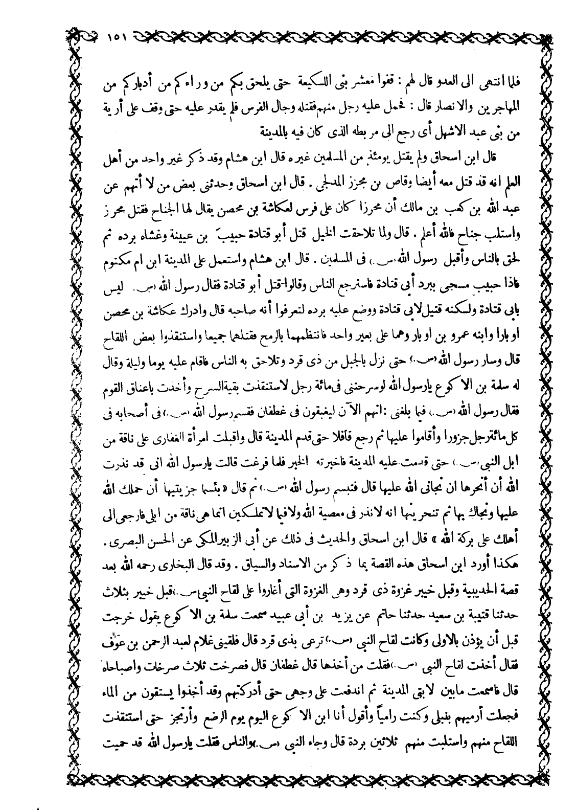 فَلَمَّا انْتَهَى إِلَى الْعَدُوِّ قَالَ لَهُمْ: قِفُوا مَعْشَرَ بَنِي اللَّكِيعَةِ حَتَّى يَلْحَقَ بِكُمْ مَنْ وَرَاءَكُمْ مِنْ أَدْبَارِكُمْ مِنَ الْمُهَاجِرِينَ وَالْأَنْصَارِ قَالَ: فَحَمَلَ عَلَيْهِ رَجُلٌ مِنْهُمْ فَقَتَلَهُ وَجَالَ الْفَرَسُ فَلَمْ يُقْدَرْ عَلَيْهِ حَتَّى وَقَفَ عَلَى أَرِيَّةٍ مِنْ بَنِي عَبْدِ الْأَشْهَلِ أَيْ رَجَعَ إِلَى مِرْبَطِهِ الَّذِي كَانَ فِيهِ بِالْمَدِينَةِ قَالَ ابْنُ إِسْحَاقَ وَلَمْ يُقْتَلْ يَوْمَئِذٍ مِنَ الْمُسْلِمِينَ غَيْرُهُ قَالَ ابْنُ هِشَامٍ وَقَدْ ذَكَرَ غَيْرُ وَاحِدٍ مِنْ أَهْلِ الْعِلْمِ أَنَّهُ قَدْ قُتِلَ مَعَهُ أَيْضًا وَقَّاصُ بْنُ مُجَزِّزٍ الْمُدْلِجِيُّ. قَالَ ابْنُ إِسْحَاقَ وَحَدَّثَنِي بَعْضُ مَنْ لَا أَتَّهِمُ عَنْ عَبْدِ اللَّهِ بْنِ كَعْبِ بْنِ مَالِكٍ أَنَّ مُحْرِزًا كَانَ عَلَى فَرَسٍ لِعُكَّاشَةَ بْنِ مِحْصَنٍ يقال لها الجناح فقتل محرز واستلب جناح فاللَّه أَعْلَمُ. قَالَ وَلَمَّا تَلَاحَقَتِ الْخَيْلُ قَتَلَ أَبُو قَتَادَةَ حَبِيبَ بْنَ عُيَيْنَةَ وَغَشَّاهُ بُرْدَهُ ثُمَّ لَحِقَ بِالنَّاسِ وَأَقْبَلَ رَسُولُ اللَّهِ صَلَّى اللَّهُ عَلَيْهِ وَسَلَّمَ فِي الْمُسْلِمِينَ. قَالَ ابْنُ هِشَامٍ وَاسْتَعْمَلَ عَلَى الْمَدِينَةِ ابْنَ أُمِّ مَكْتُومٍ فَإِذَا حَبِيبٌ مُسَجًّى بِبُرْدِ أَبِي قَتَادَةَ فَاسْتَرْجَعَ النَّاسُ وَقَالُوا قُتِلَ أَبُو قَتَادَةَ فَقَالَ رَسُولُ اللَّهِ صَلَّى اللَّهُ عَلَيْهِ وَسَلَّمَ لَيْسَ بِأَبِي قَتَادَةَ وَلَكِنَّهُ قَتِيلٌ لِأَبِي قَتَادَةَ وَوَضَعَ عَلَيْهِ بُرْدَهُ لِتَعْرِفُوا أَنَّهُ صَاحِبُهُ قَالَ وَأَدْرَكَ عُكَّاشَةُ بْنُ مِحْصَنٍ أَوْبَارًا وَابْنَهُ عَمْرَو بْنَ أَوْبَارٍ وَهُمَا عَلَى بَعِيرٍ وَاحِدٍ فَانْتَظَمَهُمَا بِالرُّمْحِ فَقَتَلَهُمَا جَمِيعًا وَاسْتَنْقَذُوا بَعْضَ اللِّقَاحِ قَالَ وَسَارَ رَسُولِ اللَّهِ صَلَّى اللَّهُ عَلَيْهِ وَسَلَّمَ حَتَّى نَزَلَ بِالْجَبَلِ مِنْ ذِي قَرَدٍ وَتَلَاحَقَ بِهِ النَّاسُ فَأَقَامَ عَلَيْهِ يَوْمًا وَلَيْلَةً وَقَالَ لَهُ سَلَمَةُ بْنُ الْأَكْوَعِ يَا رَسُولَ اللَّهِ لَوْ سَرَّحْتَنِي فِي مِائَةِ رَجُلٍ لَاسْتَنْقَذْتُ بَقِيَّةَ السَّرْحِ وَأَخَذْتُ بِأَعْنَاقِ الْقَوْمِ فَقَالَ رَسُولُ اللَّهِ صَلَّى اللَّهُ عَلَيْهِ وَسَلَّمَ فِيمَا بَلَغَنِي: إِنَّهُمُ الْآنَ لَيُغْبَقُونَ فِي غَطَفَانَ فَقَسَمَ رَسُولُ اللَّهِ صَلَّى اللَّهُ عَلَيْهِ وَسَلَّمَ فِي أَصْحَابِهِ فِي كُلِّ مِائَةِ رجل جزورا وأقاموا عليها ثُمَّ رَجَعَ قَافِلًا حَتَّى قَدِمَ الْمَدِينَةَ قَالَ وَأَقْبَلَتِ امْرَأَةُ الْغِفَارِيِّ عَلَى نَاقَةٍ مِنْ إِبِلِ النَّبِيِّ صَلَّى اللَّهُ عَلَيْهِ وَسَلَّمَ حَتَّى قَدِمَتْ عَلَيْهِ الْمَدِينَةَ فَأَخْبَرَتْهُ الْخَبَرَ فَلَمَّا فَرَغَتْ قَالَتْ يَا رَسُولَ اللَّهِ إِنِّي قَدْ نَذَرْتُ اللَّهَ أَنْ أَنْحَرَهَا إِنْ نَجَّانِي اللَّهُ عَلَيْهَا قَالَ فَتَبَسَّمَ رَسُولُ اللَّهِ صَلَّى اللَّهُ عَلَيْهِ وَسَلَّمَ ثُمَّ قال «بئسما جزيتيها أَنْ حَمَلَكِ اللَّهُ عَلَيْهَا وَنَجَّاكِ بِهَا ثُمَّ تَنْحَرِينَهَا إِنَّهُ لَا نَذْرَ فِي مَعْصِيَةِ اللَّهِ وَلَا فِيمَا لَا تَمْلِكِينَ إِنَّمَا هِيَ نَاقَةٌ مِنْ إِبِلِي فَارْجِعِي إِلَى أَهْلِكِ عَلَى بَرَكَةِ اللَّهِ» قَالَ ابْنُ إِسْحَاقَ وَالْحَدِيثُ فِي ذَلِكَ عَنِ أَبِي الزُّبَيْرِ الْمَكِّيِّ عَنِ الْحَسَنِ الْبَصْرِيِّ.