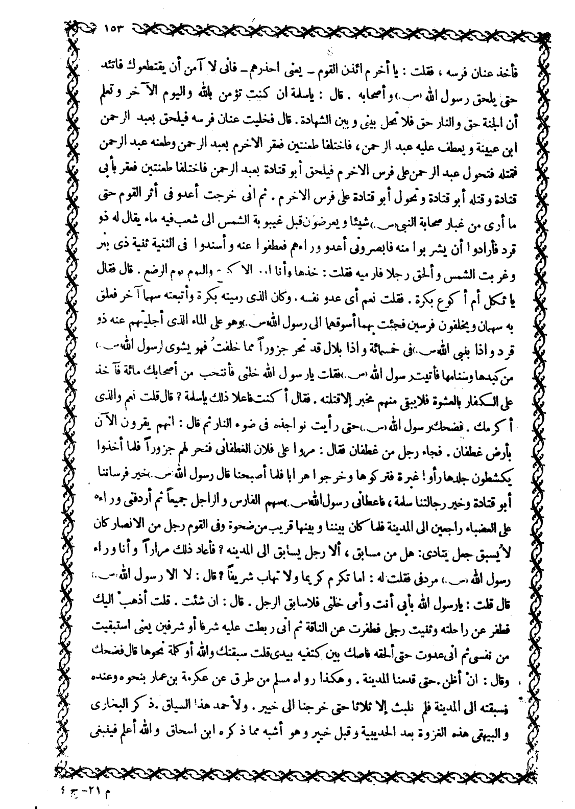 فأخذ عنان فرسه، فقلت: يا أخرم ائذن الْقَوْمَ- يَعْنِي احْذَرْهُمْ- فَإِنِّي لَا آمَنُ أَنْ يَقْتَطِعُوكَ فَاتَّئِدْ حَتَّى يَلْحَقَ رَسُولُ اللَّهِ صَلَّى اللَّهُ عَلَيْهِ وَسَلَّمَ وَأَصْحَابُهُ. قَالَ: يَا سَلَمَةُ إِنْ كُنْتَ تُؤْمِنُ باللَّه وَالْيَوْمِ الْآخِرِ وَتَعْلَمُ أَنَّ الْجَنَّةَ حَقٌّ وَالنَّارَ حَقٌّ فَلَا تَحُلْ بَيْنِي وَبَيْنَ الشَّهَادَةِ. قَالَ فَخَلَّيْتُ عِنَانَ فَرَسِهِ فيلحق بعبد الرحمن ابن عُيَيْنَةَ وَيَعْطِفُ عَلَيْهِ عَبْدُ الرَّحْمَنِ، فَاخْتَلَفَا طَعْنَتَيْنِ فَعَقَرَ الْأَخْرَمُ بِعَبْدِ الرَّحْمَنِ وَطَعَنَهُ عَبْدُ الرَّحْمَنِ فَقَتَلَهُ فَتَحَوَّلَ عَبْدُ الرَّحْمَنِ عَلَى فَرَسِ الْأَخْرَمِ فَيَلْحَقُ أَبُو قَتَادَةَ بِعَبْدِ الرَّحْمَنِ فَاخْتَلَفَا طَعْنَتَيْنِ فَعَقَرَ بِأَبِي قَتَادَةَ وَقَتَلَهُ أَبُو قَتَادَةَ وَتَحَوَّلَ أَبُو قَتَادَةَ عَلَى فَرَسِ الْأَخْرَمِ. ثُمَّ إِنِّي خَرَجْتُ أَعْدُو فِي أَثَرِ الْقَوْمِ حَتَّى مَا أَرَى مِنْ غُبَارِ صَحَابَةِ النَّبِيِّ صَلَّى اللَّهُ عَلَيْهِ وَسَلَّمَ شَيْئًا وَيُعْرِضُونَ قَبْلَ غَيْبُوبَةِ الشَّمْسِ إِلَى شِعْبٍ فِيهِ مَاءٌ يُقَالُ لَهُ ذُو قَرَدٍ فَأَرَادُوا أَنْ يَشْرَبُوا مِنْهُ فَأَبْصَرُونِي أَعْدُو وراءهم فعطفوا عنه وأسندوا فِي الثَّنِيِّةِ ثَنِيَّةِ ذِي بِئْرٍ وَغَرَبَتِ الشَّمْسُ وَأَلْحَقُ رَجُلًا فَأَرْمِيهِ فَقُلْتُ: خُذْهَا وَانَا ابْنُ الْأَكْوَعْ وَالْيَوْمُ يَوْمُ الرُّضَّعْ. قَالَ فَقَالَ يَا ثُكْلَ أُمِّ أَكْوَعَ بُكْرَةَ. فَقُلْتُ نَعَمْ أَيْ عَدُوَّ نَفْسِهِ. وَكَانَ الَّذِي رَمَيْتُهُ بُكْرَةَ وَأَتْبَعْتُهُ سَهْمًا آخَرَ فَعَلِقَ بِهِ سَهْمَانِ وَيَخْلُفُونَ فَرَسَيْنِ فَجِئْتُ بِهِمَا أَسُوقُهُمَا إِلَى رَسُولِ اللَّهِ صَلَّى اللَّهُ عَلَيْهِ وَسَلَّمَ وَهُوَ عَلَى الْمَاءِ الَّذِي أَجْلَيْتُهُمْ عَنْهُ ذُو قَرَدٍ وَإِذَا بِنَبِيِّ اللَّهِ صَلَّى اللَّهُ عَلَيْهِ وَسَلَّمَ فِي خَمْسِمِائَةٍ وَإِذَا بِلَالٌ قَدْ نَحَرَ جَزُورًا مِمَّا خَلَفْتُ فَهُوَ يَشْوِي لِرَسُولِ اللَّهِ صَلَّى اللَّهُ عَلَيْهِ وَسَلَّمَ مِنْ كَبِدِهَا وَسَنَامِهَا فَأَتَيْتُ رَسُولِ اللَّهِ صَلَّى اللَّهُ عَلَيْهِ وَسَلَّمَ فَقُلْتُ يا رسول الله خَلِّنِي فَأَنْتَخِبُ مِنْ أَصْحَابِكَ مِائَةً فَآخُذُ عَلَى الْكُفَّارِ بِالْعَشْوَةِ فَلَا يَبْقَى مِنْهُمْ مُخْبِرٌ إِلَّا قَتَلْتُهُ. فَقَالَ أَكُنْتَ فَاعِلًا ذَلِكَ يَا سَلَمَةُ؟ قَالَ قُلْتُ نَعَمْ وَالَّذِي أَكْرَمَكَ. فَضَحِكَ رَسُولُ اللَّهِ صَلَّى اللَّهُ عَلَيْهِ وَسَلَّمَ حَتَّى رَأَيْتُ نَوَاجِذَهُ فِي ضَوْءِ النَّارِ ثُمَّ قَالَ: إِنَّهُمْ يُقْرَوْنَ الْآنَ بِأَرْضِ غَطَفَانَ. فَجَاءَ رَجُلٌ مِنْ غَطَفَانَ فَقَالَ: مَرُّوا عَلَى فُلَانٍ الْغَطَفَانِيِّ فَنَحَرَ لَهُمْ جَزُورًا فَلَمَّا أَخَذُوا يَكْشِطُونَ جِلْدَهَا رَأَوْا غَبَرَةً فَتَرَكُوهَا وَخَرَجُوا هِرَابًا فَلَمَّا أَصْبَحْنَا قَالَ رَسُولُ اللَّهِ صَلَّى اللَّهُ عَلَيْهِ وَسَلَّمَ خَيْرُ فرساننا أَبُو قَتَادَةَ وَخَيْرُ رَجَّالَتِنَا سَلَمَةُ، فَأَعْطَانِي رَسُولُ اللَّهِ صَلَّى اللَّهُ عَلَيْهِ وَسَلَّمَ سَهْمَ الْفَارِسِ وَالرَّاجِلِ جَمِيعًا ثُمَّ أَرْدَفَنِي وَرَاءَهُ عَلَى الْعَضْبَاءِ رَاجِعِينَ إِلَى الْمَدِينَةِ فَلَمَّا كَانَ بَيْنَنَا وَبَيْنَهَا قَرِيبٌ مِنْ ضَحْوَةٍ وَفِي الْقَوْمِ رَجُلٌ مِنَ الْأَنْصَارِ كَانَ لَا يُسْبَقُ جَعَلَ يُنَادِي: هَلْ مِنْ مُسَابِقٍ، أَلَا رَجُلٌ يُسَابِقُ إِلَى الْمَدِينَةِ؟ فَأَعَادَ ذَلِكَ مِرَارًا وَأَنَا وَرَاءَ رَسُولِ اللَّهِ صَلَّى اللَّهُ عَلَيْهِ وَسَلَّمَ مُرْدِفِي فَقُلْتُ لَهُ: أَمَا تُك