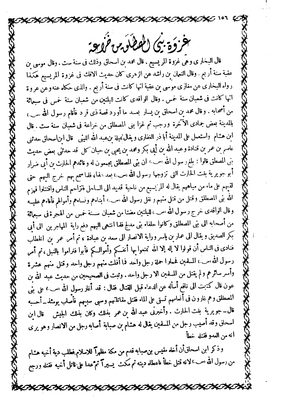 قَالَ الْبُخَارِيُّ وَهِيَ غَزْوَةُ الْمُرَيْسِيعِ. قَالَ مُحَمَّدُ بْنُ إِسْحَاقَ وَذَلِكَ فِي سَنَةِ سِتٍّ. وَقَالَ مُوسَى بْنُ عُقْبَةَ سَنَةَ أَرْبَعٍ. وَقَالَ النُّعْمَانُ بْنُ رَاشِدٍ عَنِ الزُّهْرِيِّ كَانَ حَدِيثُ الْإِفْكِ في غزوة المريسيع هكذا رواه الْبُخَارِيُّ عَنْ مَغَازِي مُوسَى بْنِ عُقْبَةَ أَنَّهَا كانت في سنة أربع. والّذي حكاه عَنْهُ وَعَنْ عُرْوَةَ أَنَّهَا كَانَتْ فِي شَعْبَانَ سَنَةَ خَمْسٍ. وَقَالَ الْوَاقِدِيُّ كَانَتْ لِلَيْلَتَيْنِ مِنْ شَعْبَانَ سَنَةَ خَمْسٍ فِي سَبْعِمِائَةٍ مِنْ أَصْحَابِهِ. وقال محمد بن إسحاق بن يسار بعد ما أَوْرَدَ قِصَّةَ ذِي قَرَدٍ فَأَقَامَ رَسُولُ اللَّهِ صَلَّى اللَّهُ عَلَيْهِ وَسَلَّمَ بِالْمَدِينَةِ بَعْضَ جُمَادَى الآخرة ورجب ثُمَّ غَزَا بَنِي الْمُصْطَلِقِ مِنْ خُزَاعَةَ فِي شَعْبَانَ سَنَةَ سِتٍّ. قَالَ ابْنُ هِشَامٍ وَاسْتَعْمَلَ عَلَى الْمَدِينَةِ أَبَا ذَرٍّ الْغِفَارِيَّ وَيُقَالُ نُمَيْلَةُ بن عبد الله الليثي. قال ابن إسحاق حدثني عاصم بن عمرو بن قتادة وعبد الله بن أبي بكر وَمُحَمَّدُ بْنُ يَحْيَى بْنِ حِبَّانَ كُلٌّ قَدْ حَدَّثَنِي بَعْضَ حَدِيثِ بَنِي الْمُصْطَلِقِ قَالُوا: بَلَغَ رَسُولُ اللَّهِ صَلَّى اللَّهُ عَلَيْهِ وَسَلَّمَ إِنَّ بَنِي الْمُصْطَلِقِ يَجْمَعُونَ لَهُ وَقَائِدُهُمُ الْحَارِثُ بْنُ أَبِي ضِرَارٍ أَبُو جُوَيْرِيَةَ بِنْتِ الْحَارِثِ الَّتِي تَزَوَّجَهَا رَسُولُ اللَّهِ صَلَّى اللَّهُ عَلَيْهِ وَسَلَّمَ بَعْدَ هَذَا، فَلَمَّا سَمِعَ بِهِمْ خَرَجَ إِلَيْهِمْ حَتَّى لَقِيَهُمْ عَلَى مَاءٍ مِنْ مِيَاهِهِمْ يُقَالُ لَهُ الْمُرَيْسِيعُ مِنْ نَاحِيَةِ قُدَيْدٍ إِلَى السَّاحِلِ فَتَزَاحَمَ النَّاسُ وَاقْتَتَلُوا فَهَزَمَ اللَّهُ بَنِي الْمُصْطَلِقِ وقتل من قتل منهم ونقل رَسُولُ اللَّهِ صَلَّى اللَّهُ عَلَيْهِ وَسَلَّمَ أَبْنَاءَهُمْ وَنِسَاءَهُمْ وَأَمْوَالَهُمْ فَأَفَاءَهُمْ عَلَيْهِ وَقَالَ الْوَاقِدِيُّ خَرَجَ رَسُولُ اللَّهِ صَلَّى اللَّهُ عَلَيْهِ وَسَلَّمَ لِلَيْلَتَيْنِ مضتا مِنْ شَعْبَانَ سَنَةَ خَمْسٍ مِنَ الْهِجْرَةِ فِي سَبْعِمِائَةٍ مِنْ أَصْحَابِهِ إِلَى بَنِي الْمُصْطَلِقِ وَكَانُوا حُلَفَاءَ بَنِي مُدْلِجٍ فَلَمَّا انْتَهَى إِلَيْهِمْ دَفَعَ رَايَةَ الْمُهَاجِرِينَ إِلَى أَبِي بَكْرٍ الصِّدِّيقِ وَيُقَالُ إِلَى عَمَّارِ بْنِ يَاسِرٍ وَرَايَةَ الْأَنْصَارِ إِلَى سَعْدِ بْنِ عُبَادَةَ، ثُمَّ أَمَرَ عُمَرَ بْنَ الْخَطَّابِ فَنَادَى فِي النَّاسِ أَنْ قُولُوا لَا إِلَهَ إِلَّا اللَّهُ تَمْنَعُوا بِهَا أَنْفُسَكُمْ وَأَمْوَالَكُمْ فَأَبَوْا فَتَرَامَوْا بِالنَّبْلِ، ثُمَّ أَمَرَ رَسُولُ اللَّهِ صَلَّى اللَّهُ عَلَيْهِ وَسَلَّمَ الْمُسْلِمِينَ فَحَمَلُوا حَمْلَةَ رَجُلٍ وَاحِدٍ فَمَا أَفْلَتَ مِنْهُمْ رَجُلٌ وَاحِدٌ وَقُتِلَ مِنْهُمْ عَشَرَةٌ وَأُسِرَ سَائِرُهُمْ وَلَمْ يُقْتَلْ مِنَ الْمُسْلِمِينَ إِلَّا رَجُلٌ وَاحِدٌ. وَثَبَتَ فِي الصَّحِيحَيْنِ مِنْ حَدِيثِ عَبْدِ اللَّهِ بْنِ عَوْنٍ قَالَ كَتَبْتُ إِلَى نَافِعٍ أَسْأَلُهُ عَنِ الدُّعَاءِ قَبْلَ الْقِتَالِ فَقَالَ: قَدْ أَغَارَ رَسُولُ اللَّهِ صَلَّى اللَّهُ عَلَيْهِ وَسَلَّمَ عَلَى بَنِي الْمُصْطَلِقِ وهم غارون في أنعامهم تُسْقَى عَلَى الْمَاءِ فَقَتَلَ مُقَاتِلَتَهُمْ وَسَبَى سَبْيَهُمْ فَأَصَابَ يَوْمَئِذٍ- أَحْسَبُهُ قَالَ- جُوَيْرِيَةَ بِنْتَ الْحَارِثِ. وَأَخْبَرَنِي عَبْدُ اللَّهِ بْنُ عُمَرَ بِذَلِكَ وَكَانَ بذلك الْجَيْشِ. قَالَ ابْنُ إِسْحَاقَ وَقَدْ أُصِيبَ رَجُلٌ مِنَ الْمُسْلِمِينَ يُقَالُ لَهُ هِشَامُ بْنُ صُبَابَةَ أَصَابَهُ رَجُلٌ مِنَ الْأَنْصَارِ وَهُوَ يَرَى أَنَّهُ مِنَ الْعَدُوِّ فَقَتَلَهُ