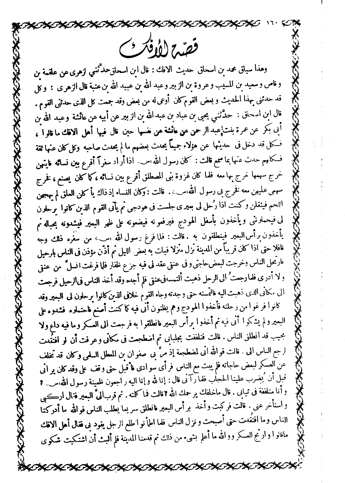 قَالَ ابْنُ إِسْحَاقَ: وَحَدَّثَنِي يَحْيَى بْنُ عَبَّادِ بْنِ عَبْدِ اللَّهِ بْنِ الزُّبَيْرِ عَنْ أَبِيهِ عَنْ عَائِشَةَ وَعَبْدِ اللَّهِ بْنِ أَبِي بَكْرٍ عَنْ عَمْرَةَ بِنْتِ عَبْدِ الرَّحْمَنِ عَنْ عَائِشَةَ عَنْ نَفْسِهَا حِينَ قَالَ فِيهَا أَهْلُ الْإِفْكِ مَا قَالُوا، فَكُلٌّ قَدْ دَخَلَ فِي حَدِيثِهَا عَنْ هَؤُلَاءِ جَمِيعًا يُحَدِّثُ بَعْضُهُمْ مَا لَمْ يُحَدِّثْ صَاحِبُهُ وَكُلٌّ كَانَ عَنْهَا ثِقَةً فَكُلُّهُمْ حَدَّثَ عَنْهَا بِمَا سَمِعَ قَالَتْ: كَانَ رَسُولُ اللَّهِ صَلَّى اللَّهُ عَلَيْهِ وَسَلَّمَ إِذَا أَرَادَ سَفَرًا أَقْرَعَ بَيْنَ نِسَائِهِ فَأَيَّتُهُنَّ خَرَجَ سَهْمُهَا خَرَجَ بِهَا مَعَهُ فَلَمَّا كَانَ غَزْوَةُ بَنِي الْمُصْطَلِقِ أَقْرَعَ بَيْنَ نِسَائِهِ، كَمَا كَانَ يَصْنَعُ، فَخَرَجَ سَهْمِي عَلَيْهِنَّ مَعَهُ فَخَرَجَ بِي رَسُولُ اللَّهِ صَلَّى اللَّهُ عَلَيْهِ وَسَلَّمَ. قَالَتْ: وَكَانَ النِّسَاءُ إِذْ ذَاكَ يأكلن العلق لم يهجهن اللَّحْمُ فَيَثْقُلْنَ وَكُنْتُ إِذَا رَحَلَ لِي بَعِيرِي جَلَسْتُ فِي هَوْدَجِي ثُمَّ يَأْتِي الْقَوْمُ الَّذِينَ كانوا يرحلون لي فيحملوننى ويأخذون بِأَسْفَلِ الْهَوْدَجِ فَيَرْفَعُونَهُ فَيَضَعُونَهُ عَلَى ظَهْرِ الْبَعِيرِ فَيَشُدُّونَهُ بِحِبَالِهِ ثُمَّ يَأْخُذُونَ بِرَأْسِ الْبَعِيرِ فَيَنْطَلِقُونَ بِهِ. قَالَتْ: فَلَمَّا فَرَغَ رَسُولُ اللَّهِ صَلَّى اللَّهُ عَلَيْهِ وَسَلَّمَ مِنْ سَفَرِهِ ذَلِكَ وَجَّهَ قَافِلًا حَتَّى إِذَا كَانَ قَرِيبًا مِنَ الْمَدِينَةِ نَزَلَ مَنْزِلًا فَبَاتَ بِهِ بَعْضَ اللَّيْلِ ثُمَّ أذّن مؤذن فِي النَّاسِ بِالرَّحِيلِ فَارْتَحَلَ النَّاسُ وَخَرَجْتُ لِبَعْضِ حَاجَتِي وَفِي عُنُقِي عِقْدٌ لِي فِيهِ جَزْعُ ظَفَارٍ فَلَمَّا فَرَغْتُ انْسَلَّ مِنْ عُنُقِي وَلَا أَدْرِي فَلَمَّا رَجَعْتُ إِلَى الرَّحْلِ ذَهَبْتُ أَلْتَمِسُهُ فِي عُنُقِي فَلَمْ أَجِدْهُ وَقَدْ أَخَذَ النَّاسُ فِي الرَّحِيلِ فَرَجَعْتُ إِلَى مَكَانِي الَّذِي ذَهَبْتُ إِلَيْهِ فَالْتَمَسْتُهُ حَتَّى وَجَدْتُهُ وَجَاءَ الْقَوْمُ خِلَافِي الَّذِينَ كَانُوا يُرَحِّلُونَ لِيَ الْبَعِيرَ وَقَدْ كَانُوا فَرَغُوا مَنْ رِحْلَتِهِ فَأَخَذُوا الْهَوْدَجَ وَهُمْ يَظُنُّونَ أَنِّي فِيهِ كَمَا كُنْتُ أَصْنَعُ فَاحْتَمَلُوهُ فَشَدُّوهُ عَلَى الْبَعِيرِ وَلَمْ يَشُكُّوا أَنِّي فِيهِ ثُمَّ أَخَذُوا بِرَأْسِ الْبَعِيرِ فَانْطَلَقُوا بِهِ فَرَجَعْتُ إِلَى الْعَسْكَرِ وَمَا فِيهِ دَاعٍ وَلَا مُجِيبٌ قَدِ انْطَلَقَ النَّاسُ. قَالَتْ فَتَلَفَّفْتُ بِجِلْبَابِي ثُمَّ اضْطَجَعْتُ فِي مَكَانِي وَعَرَفْتُ أَنْ لَوِ افْتُقِدْتُ لَرُجِعَ الناس الى. قالت فو الله انى لمضطجعة إذ مرّ بين صفوان بن المعطل السلمي وكان قد تخلف عن العسكر لبعض حاجاته فَلَمْ يَبِتْ مَعَ النَّاسِ فَرَأَى سَوَادِي فَأَقْبَلَ حَتَّى وَقَفَ عَلَيَّ وَقَدْ كَانَ يَرَانِي قَبْلَ أَنْ يُضْرَبَ عَلَيْنَا الْحِجَابُ فَلَمَّا رَآنِي قَالَ: إِنَّا لِلَّهِ وَإِنَّا إِلَيْهِ راجِعُونَ 2: 156 ظَعِينَةُ رَسُولُ اللَّهِ صَلَّى اللَّهُ عَلَيْهِ وَسَلَّمَ؟