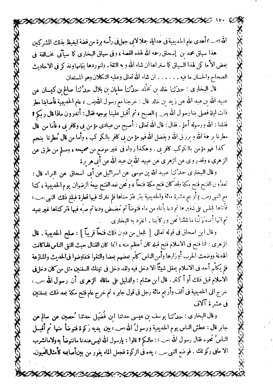 اللَّهِ صَلَّى اللَّهُ عَلَيْهِ وَسَلَّمَ أَهْدَى عَامَ الْحُدَيْبِيَةِ فِي هَدَايَاهُ جَمَلًا لِأَبِي جَهْلٍ فِي رَأْسِهِ بُرَّةٌ مِنْ فِضَّةٍ لِيَغِيظَ بِذَلِكَ الْمُشْرِكِينَ هَذَا سِيَاقُ مُحَمَّدِ بْنِ إِسْحَاقَ رَحِمَهُ اللَّهُ لِهَذِهِ الْقِصَّةِ، وَفِي سِيَاقِ الْبُخَارِيِّ كَمَا سَيَأْتِي مُخَالَفَةٌ فِي بَعْضِ الْأَمَاكِنِ لِهَذَا السِّيَاقِ كَمَا ستراها ان شاء الله وبه الثقة. ولنوردها بتمامها ونذكر في الأحاديث الصحاح والحسان ما فيه...... إِنْ شَاءَ اللَّهُ تَعَالَى وَعَلَيْهِ التُّكْلَانُ وَهُوَ الْمُسْتَعَانُ قَالَ الْبُخَارِيُّ: حَدَّثَنَا خَالِدُ بْنُ مَخْلَدٍ حَدَّثَنَا سُلَيْمَانُ بْنُ بِلَالٍ حَدَّثَنَا صَالِحُ بْنُ كَيْسَانَ عَنْ عُبَيْدِ اللَّهِ بْنِ عَبْدِ اللَّهِ عَنِ زَيْدِ بْنِ خَالِدٍ قَالَ: خَرَجْنَا مَعَ رَسُولِ اللَّهِ صَلَّى اللَّهُ عَلَيْهِ وَسَلَّمَ عام الحديبيّة فأصابنا مطر ذات ليلة فَصَلَّى بِنَا رَسُولُ اللَّهِ صَلَّى اللَّهُ عَلَيْهِ وَسَلَّمَ الصبح، ثم أقبل علينا بوجهه فقال: أتدرون ماذا قال ربكم؟