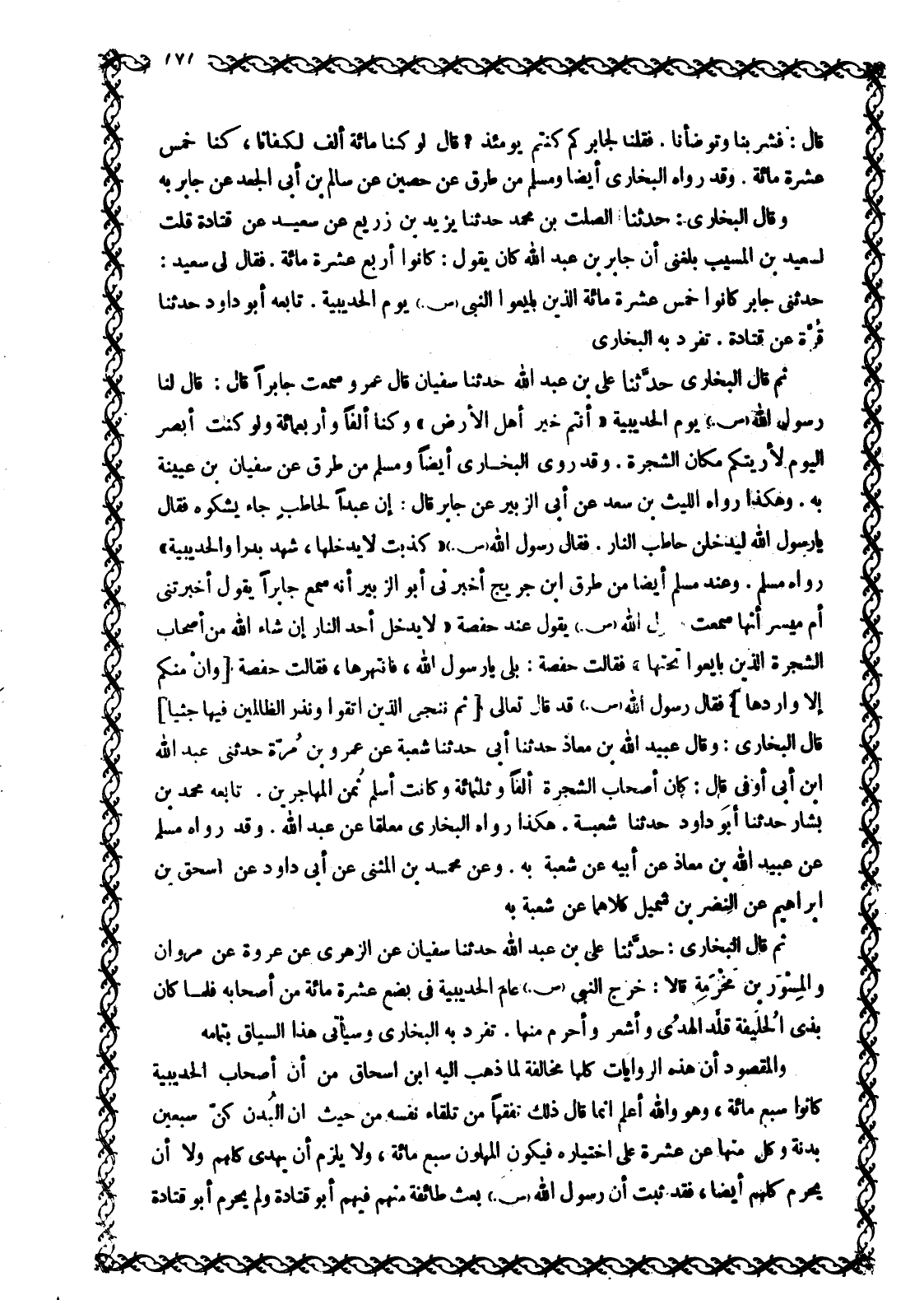 حَدَّثَنِي جَابِرٌ كَانُوا خَمْسَ عَشْرَةَ مِائَةً الَّذِينَ بَايَعُوا النبي صلى الله عليه وسلم يوم الحديبية. تَابَعَهُ أَبُو دَاوُدَ حَدَّثَنَا قُرَّةُ عَنْ قَتَادَةَ. تَفَرَّدَ بِهِ الْبُخَارِيُّ ثُمَّ قَالَ الْبُخَارِيُّ حَدَّثَنَا عَلِيُّ بْنُ عَبْدِ اللَّهِ حَدَّثَنَا سُفْيَانُ قَالَ عَمْرٌو سَمِعْتُ جَابِرًا قَالَ: قَالَ لَنَا رَسُولُ اللَّهِ صَلَّى اللَّهُ عَلَيْهِ وَسَلَّمَ يَوْمَ الْحُدَيْبِيَةِ «أَنْتُمْ خَيْرُ أَهْلِ الْأَرْضِ» وَكُنَّا أَلْفًا وَأَرْبَعَمِائَةٍ وَلَوْ كُنْتُ أُبْصِرُ الْيَوْمَ لَأَرَيْتُكُمْ مَكَانَ الشَّجَرَةِ. وقد روى الْبُخَارِيُّ أَيْضًا وَمُسْلِمٌ مِنْ طُرُقٍ عَنْ سُفْيَانَ بْنِ عُيَيْنَةَ بِهِ. وَهَكَذَا رَوَاهُ اللَّيْثُ بْنُ سَعْدٍ عَنْ أَبِي الزُّبَيْرِ عَنْ جَابِرٍ قَالَ: أَنَّ عَبْدًا لِحَاطِبٍ جَاءَ يَشْكُوهُ فَقَالَ يَا رَسُولَ اللَّهِ لَيَدْخُلَنَّ حَاطِبٌ النَّارَ. فَقَالَ رَسُولُ اللَّهِ صَلَّى اللَّهُ عَلَيْهِ وَسَلَّمَ «كَذَبْتَ لَا يدخلها، شَهِدَ بَدْرًا وَالْحُدَيْبِيَةَ» رَوَاهُ مُسْلِمٌ. وَعِنْدَ مُسْلِمٍ أيضا من طرق ابْنُ جُرَيْجٍ أَخْبَرَنِي أَبُو الزُّبَيْرِ أَنَّهُ سَمِعَ جابرا يقول أخبرتنى أم ميسر أَنَّهَا سَمِعْتُ رَسُولَ اللَّهِ صَلَّى اللَّهُ عَلَيْهِ وَسَلَّمَ يَقُولُ عِنْدَ حَفْصَةَ «لَا يَدْخُلُ أَحَدٌ النَّارَ إِنْ شَاءَ اللَّهُ مِنْ أَصْحَابِ الشَّجَرَةِ الَّذِينَ بَايَعُوا تَحْتَهَا» فَقَالَتْ حَفْصَةُ: بَلَى يَا رَسُولَ اللَّهِ، فَانْتَهَرَهَا، فَقَالَتْ حَفْصَةُ وَإِنْ مِنْكُمْ إِلَّا وارِدُها 19: 71 فَقَالَ رَسُولُ اللَّهِ صَلَّى اللَّهُ عَلَيْهِ وَسَلَّمَ قَدْ قَالَ تَعَالَى ثُمَّ نُنَجِّي الَّذِينَ اتَّقَوْا وَنَذَرُ الظَّالِمِينَ فِيها جِثِيًّا 19: 72 قَالَ الْبُخَارِيُّ: وَقَالَ عُبَيْدُ اللَّهِ بْنُ مُعَاذٍ حَدَّثَنَا أَبِي حَدَّثَنَا شُعْبَةُ عَنْ عَمْرِو بْنِ مرّة حدثني عبد الله ابن أبى أو في قَالَ: كَانَ أَصْحَابُ الشَّجَرَةِ أَلْفًا وَثَلَاثَمِائَةٍ وَكَانَتْ أَسْلَمُ ثُمُنَ الْمُهَاجِرِينَ. تَابَعَهُ مُحَمَّدُ بْنُ بَشَّارٍ حَدَّثَنَا أَبُو دَاوُدَ حَدَّثَنَا شُعْبَةُ. هَكَذَا رَوَاهُ البخاري معلقا عن عبد اللَّهِ. وَقَدْ رَوَاهُ مُسْلِمٌ عَنْ عُبَيْدِ اللَّهِ بْنِ مُعَاذٍ عَنْ أَبِيهِ عَنْ شعبة به. وَعَنْ مُحَمَّدِ بْنِ الْمُثَنَّى عَنْ أَبِي دَاوُدَ عَنْ إِسْحَاقَ بْنِ إِبْرَاهِيمَ عَنِ النَّضْرِ بْنِ شُمَيْلٍ كِلَاهُمَا عَنْ شُعْبَةَ بِهِ ثُمَّ قَالَ الْبُخَارِيُّ: حَدَّثَنَا عَلِيُّ بْنُ عَبْدِ اللَّهِ حَدَّثَنَا سُفْيَانُ عَنِ الزُّهْرِيِّ عَنْ عُرْوَةَ عَنْ مَرْوَانَ وَالْمِسْوَرِ بْنِ مَخْرَمَةَ قَالَا: خَرَجَ النَّبِيُّ صَلَّى اللَّهُ عَلَيْهِ وَسَلَّمَ عَامَ الْحُدَيْبِيَةِ فِي بِضْعَ عَشْرَةَ مِائَةً مِنْ أَصْحَابِهِ فَلَمَّا كَانَ بِذِي الْحُلَيْفَةِ قَلَّدَ الْهَدْيَ وَأَشْعَرَ وَأَحْرَمَ مِنْهَا. تَفَرَّدَ بِهِ الْبُخَارِيُّ وَسَيَأْتِي هَذَا السِّيَاقُ بِتَمَامِهِ وَالْمَقْصُودُ أَنَّ هَذِهِ الرِّوَايَاتِ كُلَّهَا مُخَالِفَةٌ لِمَا ذَهَبَ إِلَيْهِ ابْنُ إِسْحَاقَ مِنْ أَنَّ أَصْحَابَ الْحُدَيْبِيَةِ كانوا سبع مائة، وَهُوَ وَاللَّهُ أَعْلَمُ إِنَّمَا قَالَ ذَلِكَ تَفَقُّهًا مِنْ تِلْقَاءِ نَفْسِهِ مِنْ حَيْثُ إِنَّ الْبُدْنَ كُنَّ سَبْعِينَ بَدَنَةً وَكُلٌّ مِنْهَا عَنْ عَشَرَةٍ على اختياره فيكون المهلون سبع مائة، وَلَا يَلْزَمُ أَنْ يُهْدِيَ كُلُّهُمْ وَلَا أَنْ يُحْرِمَ كُلُّهُمْ أَيْضًا، فَقَدْ ثَبَتَ أَنَّ رَسُولَ اللَّهِ صَلَّى اللَّهُ عَلَيْهِ وَسَلَّمَ بَعَثَ طَائِفَةً مِنْهُمْ فِيهِمْ أَبُو قَتَادَةَ وَلَمْ يُحْرِمْ أَبُو قتادة