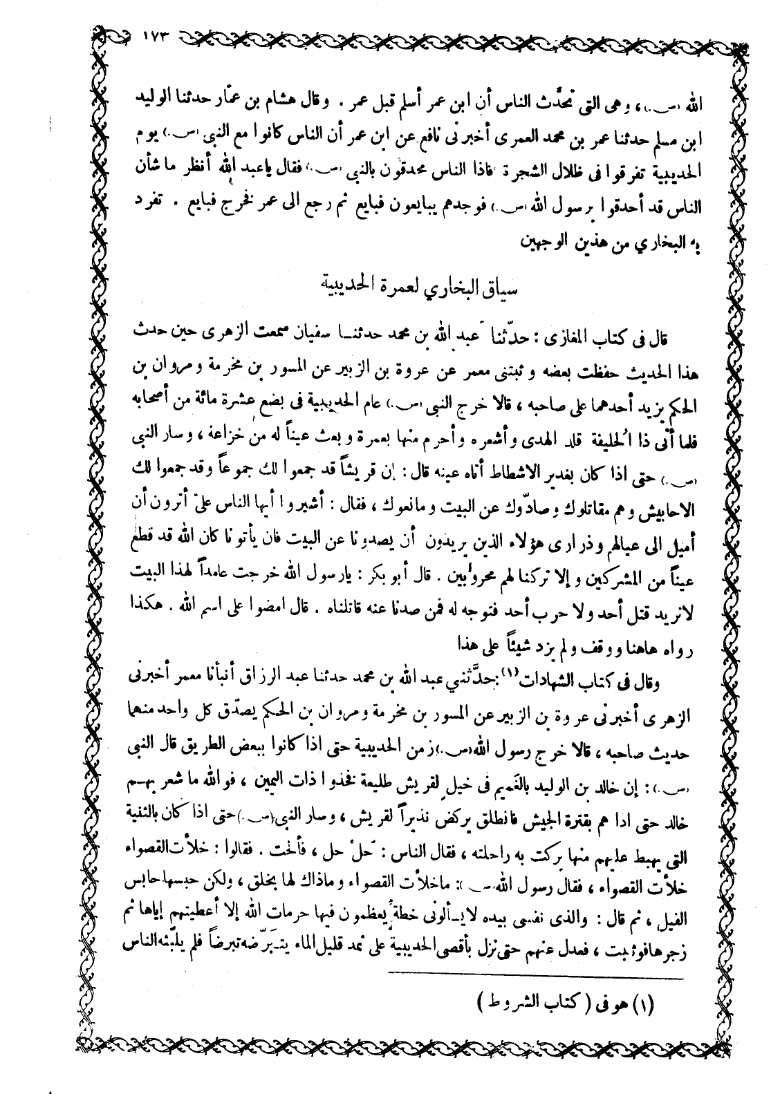 قَالَ فِي كِتَابِ الْمَغَازِي: حَدَّثَنَا عَبْدُ اللَّهِ بْنُ مُحَمَّدٍ حَدَّثَنَا سُفْيَانُ سَمِعْتُ الزُّهْرِيَّ حِينَ حَدَّثَ هَذَا الْحَدِيثَ حَفِظْتُ بَعْضَهُ وَثَبَّتَنِي مَعْمَرٌ عَنْ عُرْوَةَ بن الزبير عن المسور بن مخرمة ومروان بْنِ الْحَكَمِ يَزِيدُ أَحَدُهُمَا عَلَى صَاحِبِهِ، قَالَا خَرَجَ النَّبِيُّ صَلَّى اللَّهُ عَلَيْهِ وَسَلَّمَ عَامَ الْحُدَيْبِيَةِ فِي بِضْعَ عَشْرَةَ مِائَةً مِنْ أَصْحَابِهِ فَلَمَّا أَتَى ذَا الْحُلَيْفَةِ قَلَّدَ الْهَدْيَ وَأَشْعَرَهُ وَأَحْرَمَ مِنْهَا بِعُمْرَةٍ وَبَعَثَ عَيْنًا لَهُ مِنْ خُزَاعَةَ، وَسَارَ النَّبِيُّ صَلَّى اللَّهُ عَلَيْهِ وَسَلَّمَ حَتَّى إِذَا كَانَ بِغَدِيرِ الْأَشْطَاطِ أَتَاهُ عَيْنُهُ قَالَ: إِنَّ قُرَيْشًا قَدْ جَمَعُوا لَكَ جُمُوعًا وَقَدْ جَمَعُوا لَكَ الْأَحَابِيشَ وَهُمْ مُقَاتِلُوكَ وَصَادُّوكَ عَنِ الْبَيْتِ وَمَانِعُوكَ، فَقَالَ: أَشِيرُوا أَيُّهَا النَّاسُ عَلَيَّ أَتَرَوْنَ أَنْ أَمِيلَ إِلَى عِيَالِهِمْ وَذَرَارِيِّ هَؤُلَاءِ الَّذِينَ يُرِيدُونَ أَنْ يَصُدُّونَا عَنِ الْبَيْتِ فَإِنْ يَأْتُونَا كَانَ اللَّهُ قَدْ قَطَعَ عَيْنًا من المشركين وإلا تركنا لهم محروبين. قَالَ أَبُو بَكْرٍ: يَا رَسُولَ اللَّهِ خَرَجْتَ عامدا لهذا البيت لا نريد قَتْلَ أَحَدٍ وَلَا حَرْبَ أَحَدٍ فَتَوَجَّهْ لَهُ فَمَنْ صَدَّنَا عَنْهُ قَاتَلْنَاهُ. قَالَ امْضُوا عَلَى اسْمِ اللَّهِ. هَكَذَا رَوَاهُ هَاهُنَا وَوَقَفَ وَلَمْ يَزِدْ شَيْئًا عَلَى هَذَا وَقَالَ فِي كِتَابِ الشَّهَادَاتِ [1] : حَدَّثَنِي عَبْدُ اللَّهِ بْنُ مُحَمَّدٍ حَدَّثَنَا عَبْدُ الرَّزَّاقِ أَنْبَأَنَا مَعْمَرٌ أَخْبَرَنِي الزُّهْرِيُّ أَخْبَرَنِي عروة بن الزبير عن المسور بن مخرمة وَمَرْوَانَ بْنِ الْحَكَمِ يُصَدِّقُ كُلُّ وَاحِدٍ مِنْهُمَا حَدِيثَ صَاحِبِهِ، قَالَا خَرَجَ رَسُولُ اللَّهِ صَلَّى اللَّهُ عَلَيْهِ وَسَلَّمَ زَمَنَ الْحُدَيْبِيَةِ حَتَّى إِذَا كَانُوا بِبَعْضِ الطَّرِيقِ قَالَ النَّبِيُّ صَلَّى اللَّهُ عَلَيْهِ وَسَلَّمَ: إِنَّ خَالِدَ بْنَ الْوَلِيدِ بِالْغَمِيمِ فِي خَيْلٍ لِقُرَيْشٍ طَلِيعَةً فَخُذُوا ذَاتَ الْيَمِينِ، فو الله مَا شَعَرَ بِهِمْ خَالِدٌ حَتَّى إِذَا هُمْ بِقَتَرَةِ الْجَيْشِ فَانْطَلَقَ يَرْكُضُ نَذِيرًا لِقُرَيْشٍ، وَسَارَ النَّبِيُّ صَلَّى اللَّهُ عَلَيْهِ وَسَلَّمَ حَتَّى إِذَا كَانَ بِالثَّنِيَّةِ الَّتِي يُهْبَطُ عَلَيْهِمْ مِنْهَا بَرَكَتْ بِهِ رَاحِلَتُهُ، فَقَالَ النَّاسُ: حَلْ حَلْ، فَأَلَحَّتْ. فَقَالُوا: خَلَأَتِ الْقَصْوَاءُ خَلَأَتِ الْقَصْوَاءُ، فَقَالَ رَسُولُ اللَّهِ صَلَّى اللَّهُ عَلَيْهِ وَسَلَّمَ: مَا خَلَأَتِ الْقَصْوَاءُ وَمَا ذَاكَ لَهَا بِخُلُقٍ، وَلَكِنْ حَبَسَهَا حَابِسُ الْفِيلِ، ثُمَّ قَالَ: وَالَّذِي نَفْسِي بِيَدِهِ لَا يَسْأَلُونِي خُطَّةً يُعَظِّمُونَ فِيهَا حُرُمَاتِ اللَّهِ إِلَّا أَعْطَيْتُهُمْ إِيَّاهَا ثُمَّ زَجَرَهَا فَوَثَبَتْ، فَعَدَلَ عَنْهُمْ حَتَّى نَزَلَ بِأَقْصَى الْحُدَيْبِيَةِ عَلَى ثَمَدٍ قَلِيلِ الماء يتبرّضه تبرضا فلم يلبّثه الناس