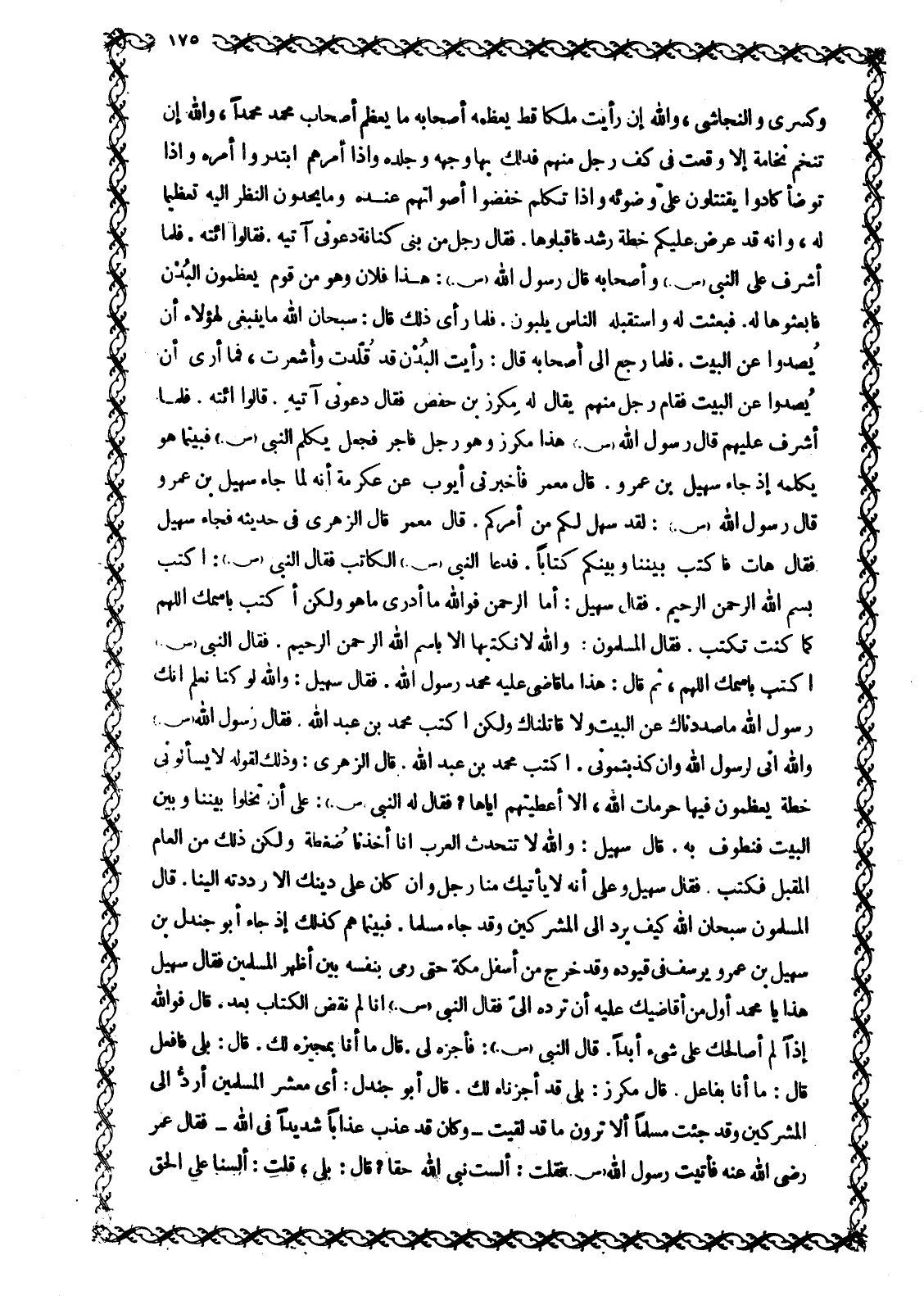 وَكِسْرَى وَالنَّجَاشِيِّ، وَاللَّهِ إِنْ رَأَيْتُ مَلِكًا قَطُّ يُعَظِّمُهُ أَصْحَابُهُ مَا يُعَظِّمُ أَصْحَابُ مُحَمَّدٍ مُحَمَّدًا، وَاللَّهِ إِنْ تَنَخَّمَ نُخَامَةً إِلَّا وَقَعَتْ فِي كَفِّ رَجُلٍ مِنْهُمْ فَدَلَّكَ بِهَا وَجْهَهُ وَجِلْدَهُ وَإِذَا أَمَرَهُمُ ابْتَدَرُوا أَمْرَهُ وَإِذَا تَوَضَّأَ كَادُوا يَقْتَتِلُونَ عَلَى وَضُوئِهِ وَإِذَا تَكَلَّمَ خَفَضُوا أَصْوَاتَهُمْ عِنْدَهُ وَمَا يُحِدُّونَ النَّظَرَ إِلَيْهِ تَعْظِيمًا لَهُ، وَإِنَّهُ قَدْ عَرَضَ عَلَيْكُمْ خُطَّةَ رُشْدٍ فَاقْبَلُوهَا. فقال رجل من بنى كنانة دعوني آتيه. فَقَالُوا ائْتِهِ. فَلَمَّا أَشْرَفَ عَلَى النَّبِيِّ صَلَّى اللَّهُ عَلَيْهِ وَسَلَّمَ وَأَصْحَابِهِ قَالَ رَسُولُ اللَّهِ صَلَّى اللَّهُ عَلَيْهِ وَسَلَّمَ: هَذَا فُلَانٌ وَهُوَ مِنْ قَوْمٍ يُعَظِّمُونَ الْبُدْنَ فَابْعَثُوهَا لَهُ. فَبُعِثَتْ لَهُ وَاسْتَقْبَلَهُ النَّاسُ يُلَبُّونَ. فَلَمَّا رَأَى ذَلِكَ قَالَ: سُبْحَانَ اللَّهِ مَا يَنْبَغِي لِهَؤُلَاءِ أَنْ يُصَدُّوا عَنِ الْبَيْتِ. فَلَمَّا رَجَعَ إِلَى أَصْحَابِهِ قَالَ: رَأَيْتُ الْبُدْنَ قَدْ قُلِّدَتْ وَأُشْعِرَتْ، فَمَا أَرَى أَنْ يُصَدُّوا عَنِ الْبَيْتِ فَقَامَ رَجُلٌ مِنْهُمْ يُقَالُ لَهُ مِكْرَزُ بْنُ حَفْصٍ فَقَالَ دعوني آتيه. قَالُوا ائْتِهِ. فَلَمَّا أَشْرَفَ عَلَيْهِمْ قَالَ رَسُولُ اللَّهِ صَلَّى اللَّهُ عَلَيْهِ وَسَلَّمَ هَذَا مِكْرَزٌ وَهُوَ رَجُلٌ فَاجِرٌ فَجَعَلَ يُكَلِّمُ النَّبِيَّ صَلَّى اللَّهُ عَلَيْهِ وَسَلَّمَ فَبَيْنَمَا هُوَ يُكَلِّمُهُ إِذْ جَاءَ سُهَيْلُ بْنُ عَمْرٍو. قَالَ مَعْمَرٌ فَأَخْبَرَنِي أَيُّوبُ عَنْ عِكْرِمَةَ أَنَّهُ لَمَّا جَاءَ سُهَيْلُ بْنُ عَمْرٍو قَالَ رَسُولُ اللَّهِ صَلَّى اللَّهُ عَلَيْهِ وَسَلَّمَ: لَقَدْ سَهُلَ لَكُمْ مِنْ أَمْرِكُمْ. قَالَ مَعْمَرٌ قَالَ الزُّهْرِيُّ فِي حَدِيثِهِ فَجَاءَ سهيل فقال هات فاكتب بَيْنَنَا وَبَيْنَكُمْ كِتَابًا. فَدَعَا النَّبِيُّ صَلَّى اللَّهُ عَلَيْهِ وَسَلَّمَ الْكَاتِبَ فَقَالَ النَّبِيُّ صَلَّى اللَّهُ عَلَيْهِ وَسَلَّمَ: اكْتُبْ بِسْمِ اللَّهِ الرَّحْمَنِ الرَّحِيمِ. فقال سهيل: أما الرحمن فو الله مَا أَدْرِي مَا هُوَ وَلَكِنِ اكْتُبْ بِاسْمِكَ اللَّهمّ كَمَا كُنْتَ تَكْتُبُ. فَقَالَ الْمُسْلِمُونَ: وَاللَّهِ لا نكتبها الا باسم اللَّهِ الرَّحْمَنِ الرَّحِيمِ. فَقَالَ النَّبِيُّ صَلَّى اللَّهُ عَلَيْهِ وَسَلَّمَ اكْتُبْ بِاسْمِكَ اللَّهمّ، ثُمَّ قَالَ: هَذَا مَا قَاضَى عَلَيْهِ مُحَمَّدٌ رَسُولُ اللَّهِ. فَقَالَ سُهَيْلٌ: وَاللَّهِ لَوْ كُنَّا نَعْلَمُ أَنَّكَ رَسُولُ اللَّهِ مَا صَدَدْنَاكَ عَنِ الْبَيْتِ وَلَا قَاتَلْنَاكَ وَلَكِنِ اكْتُبْ مُحَمَّدُ بْنُ عَبْدِ اللَّهِ. فَقَالَ رَسُولُ اللَّهِ صَلَّى اللَّهُ عَلَيْهِ وَسَلَّمَ وَاللَّهِ إِنِّي لَرَسُولُ اللَّهِ وَإِنْ كَذَّبْتُمُونِي. اكْتُبْ مُحَمَّدُ بْنُ عَبْدِ اللَّهِ. قَالَ الزُّهْرِيُّ: وَذَلِكَ لِقَوْلِهِ لَا يَسْأَلُونِي خُطَّةً يُعَظِّمُونَ فِيهَا حُرُمَاتِ اللَّهِ، إِلَّا أَعْطَيْتُهُمْ إِيَّاهَا؟ فَقَالَ لَهُ النَّبِيُّ صَلَّى اللَّهُ عَلَيْهِ وَسَلَّمَ: عَلَى أَنْ تُخَلُّوا بَيْنَنَا وَبَيْنَ الْبَيْتِ فَنَطُوفُ بِهِ. قَالَ سُهَيْلٌ: وَاللَّهِ لَا تَتَحَدَّثُ الْعَرَبُ أَنَّا أُخِذْنَا ضُغْطَةً وَلَكِنْ ذَلِكَ مِنَ الْعَامِ الْمُقْبِلِ فَكَتَبَ. فَقَالَ سُهَيْلٌ وَعَلَى أَنَّهُ لَا يَأْتِيكَ مِنَّا رَجُلٌ وَإِنْ كَانَ عَلَى دِينِكَ إِلَّا رَدَدْتَهُ إِلَيْنَا. قَالَ الْمُسْلِمُونَ سُبْحَانَ اللَّهِ كَيْفَ يُرَدُّ إِلَى الْمُشْرِكِينَ وَقَدْ جَاءَ مُسْلِمًا. فَبَيْنَمَا هُمْ كَذَلِكَ إِذْ جَاءَ أَبُو جَنْدَلِ بْن