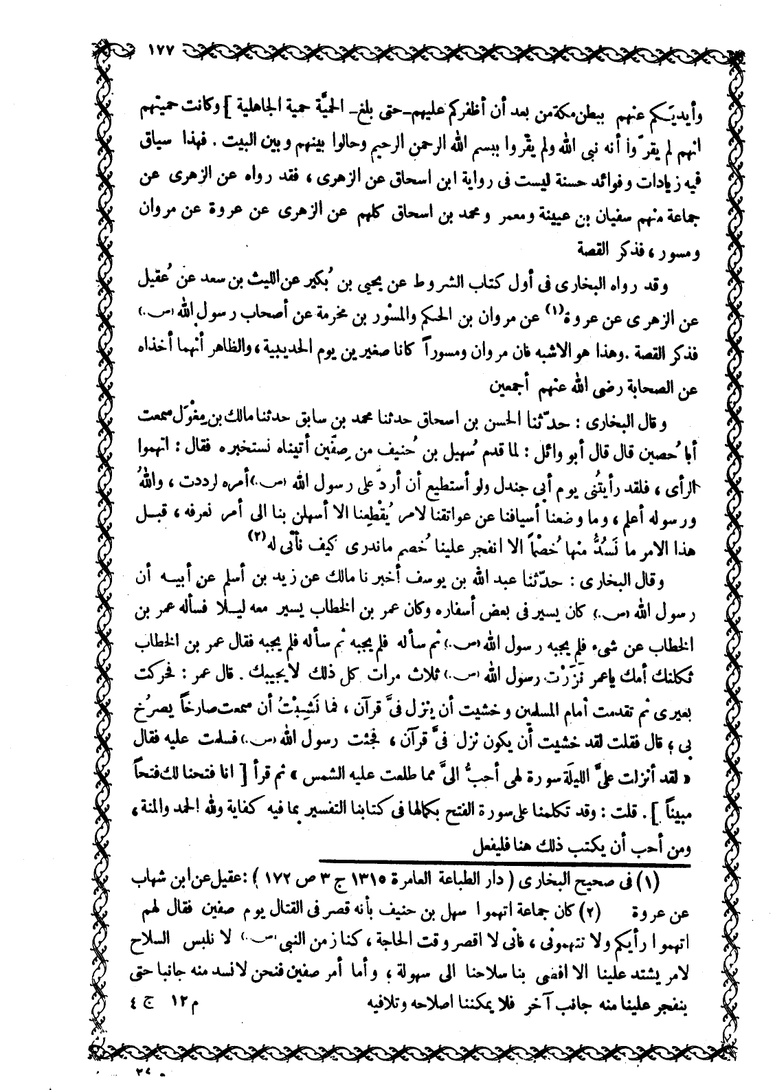 وَأَيْدِيَكُمْ عَنْهُمْ بِبَطْنِ مَكَّةَ مِنْ بَعْدِ أَنْ أَظْفَرَكُمْ عَلَيْهِمْ 48: 24- حتى بلغ- الحمية حمية الجاهلية وَكَانَتْ حَمِيَّتُهُمْ أَنَّهُمْ لَمْ يُقِرُّوا أَنَّهُ نَبِيُّ اللَّهِ وَلَمْ يُقِرُّوا بِبِسْمِ اللَّهِ الرَّحْمَنِ الرَّحِيمِ وحالوا بينهم وبين البيت. فهذا سياق فِيهِ زِيَادَاتٌ وَفَوَائِدُ حَسَنَةٌ لَيْسَتْ فِي رِوَايَةِ ابْنِ إِسْحَاقَ عَنِ الزُّهْرِيِّ، فَقَدْ رَوَاهُ عَنِ الزهري عن جَمَاعَةٌ مِنْهُمْ سُفْيَانُ بْنُ عُيَيْنَةَ وَمَعْمَرٌ وَمُحَمَّدُ بْنُ إِسْحَاقَ كُلُّهُمْ عَنِ الزُّهْرِيِّ عَنْ عُرْوَةَ عَنْ مَرْوَانَ وَمِسْوَرٍ، فَذَكَرَ الْقِصَّةَ وَقَدْ رَوَاهُ الْبُخَارِيُّ فِي أَوَّلِ كِتَابِ الشُّرُوطِ عَنْ يَحْيَى بْنِ بُكَيْرٍ عَنِ اللَّيْثِ بْنِ سَعْدٍ عَنْ عُقَيْلٍ عَنِ الزُّهْرِيِّ عَنْ عُرْوَةَ [1] عَنْ مَرْوَانَ بْنِ الْحَكَمِ وَالْمِسْوَرِ بْنِ مَخْرَمَةَ عَنْ أَصْحَابِ رَسُولِ اللَّهِ صَلَّى اللَّهُ عَلَيْهِ وَسَلَّمَ فذكر الْقِصَّةَ. وَهَذَا هُوَ الْأَشْبَهُ فَإنَّ مَرْوَانَ وَمِسْوَرًا كَانَا صَغِيرَيْنِ يَوْمَ الْحُدَيْبِيَةِ، وَالظَّاهِرُ أَنَّهُمَا أَخَذَاهُ عَنِ الصَّحَابَةِ رَضِيَ اللَّهُ عَنْهُمْ أَجْمَعِينَ وَقَالَ الْبُخَارِيُّ: حَدَّثَنَا الْحَسَنُ بْنُ إِسْحَاقَ حَدَّثَنَا مُحَمَّدُ بْنُ سَابِقٍ حَدَّثَنَا مَالِكُ بْنُ مِغْوَلٍ سَمِعْتُ أَبَا حَصِينٍ قَالَ قَالَ أَبُو وَائِلٍ: لَمَّا قدم سهيل بْنُ حُنَيْفٍ مِنْ صِفِّينَ أَتَيْنَاهُ نَسْتَخْبِرُهُ فَقَالَ: اتَّهِمُوا الرَّأْيَ، فَلَقَدْ رَأَيْتُنِي يَوْمَ أَبِي جَنْدَلٍ وَلَوْ أَسْتَطِيعُ أَنْ أَرُدَّ عَلَى رَسُولِ اللَّهِ صَلَّى اللَّهُ عَلَيْهِ وَسَلَّمَ أَمْرَهُ لَرَدَدْتُ، وَاللَّهُ ورسوله أعلم، وما وضعنا أسيافنا عن عواتقنا لِأَمْرٍ يَقْطَعُنَا إِلَّا أَسْهَلْنَ بِنَا إِلَى أَمْرٍ نَعْرِفُهُ، قَبْلَ هَذَا الْأَمْرِ مَا نَسُدُّ مِنْهَا خُصْمًا إِلَّا انْفَجَرَ عَلَيْنَا خُصْمٌ مَا نَدْرِي كَيْفَ نَأْتِي لَهُ [2] وَقَالَ الْبُخَارِيُّ: حَدَّثَنَا عَبْدُ اللَّهِ بْنُ يُوسُفَ أَخْبَرَنَا مَالِكٌ عَنْ زَيْدِ بْنِ أَسْلَمَ عَنْ أَبِيهِ أَنَّ رَسُولَ اللَّهِ صَلَّى اللَّهُ عَلَيْهِ وَسَلَّمَ كَانَ يَسِيرُ فِي بَعْضِ أَسْفَارِهِ وَكَانَ عُمَرُ بْنُ الْخَطَّابِ يَسِيرُ مَعَهُ لَيْلًا فَسَأَلَهُ عُمَرُ بْنُ الْخَطَّابِ عَنْ شَيْءٍ فَلَمْ يُجِبْهُ رَسُولُ اللَّهِ صَلَّى اللَّهُ عَلَيْهِ وَسَلَّمَ ثُمَّ سَأَلَهُ فَلَمْ يُجِبْهُ ثُمَّ سَأَلَهُ فَلَمْ يُجِبْهُ فَقَالَ عُمَرُ بْنُ الْخَطَّابِ ثَكِلَتْكَ أُمُّكَ يَا عُمَرُ نَزَّرْتَ رَسُولَ اللَّهِ صَلَّى اللَّهُ عَلَيْهِ وَسَلَّمَ ثَلَاثَ مَرَّاتٍ كُلُّ ذَلِكَ لَا يُجِيبُكَ. قَالَ عُمَرُ: فَحَرَّكْتُ بَعِيرِي ثُمَّ تَقَدَّمْتُ أَمَامَ الْمُسْلِمِينَ وَخَشِيتُ أَنْ يَنْزِلَ فِيَّ قُرْآنٌ، فَمَا نَشِبْتُ أَنْ سَمِعْتُ صَارِخًا يَصْرُخُ بِي، قَالَ فَقُلْتُ لَقَدْ خَشِيتُ أَنْ يَكُونَ نَزَلَ فِيَّ قُرْآنٌ، فَجِئْتُ رَسُولَ اللَّهِ صَلَّى اللَّهُ عَلَيْهِ وَسَلَّمَ فَسَلَّمْتُ عَلَيْهِ فَقَالَ «لَقَدْ أُنْزِلَتْ عَلَيَّ اللَّيْلَةَ سُورَةٌ لَهِيَ أَحَبُّ إِلَيَّ مِمَّا طَلَعَتْ عَلَيْهِ الشَّمْسُ» ثُمَّ قَرَأَ إِنَّا فَتَحْنا لَكَ فَتْحاً مُبِيناً 48: 1. قُلْتُ: وَقَدْ تَكَلَّمْنَا عَلَى سُورَةِ الْفَتْحِ بِكَمَالِهَا فِي كِتَابِنَا التَّفْسِيرِ بِمَا فِيهِ كِفَايَةٌ وللَّه الْحَمْدُ وَالْمِنَّةُ، وَمَنْ أَحَبَّ أَنْ يَكْتُبَ ذَلِكَ هنا فليفعل