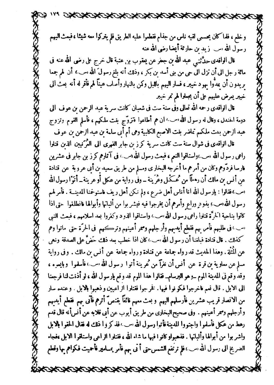 وَخِلَعٍ، فَلَمَّا كَانَ بِحِسْمَى لَقِيَهُ نَاسٌ مِنْ جُذَامٍ فَقَطَعُوا عَلَيْهِ الطَّرِيقَ فَلَمْ يَتْرُكُوا مَعَهُ شَيْئًا، فَبَعَثَ إِلَيْهِمْ رَسُولُ اللَّهِ صَلَّى اللَّهُ عَلَيْهِ وَسَلَّمَ زَيْدَ بْنَ حَارِثَةَ أَيْضًا رَضِيَ اللَّهُ عَنْهُ قَالَ الْوَاقِدِيُّ حَدَّثَنِي عَبْدُ اللَّهِ بْنُ جَعْفَرٍ عَنْ يَعْقُوبَ بْنِ عُتْبَةَ قَالَ خَرَجَ عَلِيٌّ رَضِيَ اللَّهُ عَنْهُ فِي مِائَةِ رَجُلٍ إِلَى أَنْ نَزَلَ إِلَى حَيٍّ مِنْ بنى أسد بْنِ بَكْرٍ، وَذَلِكَ أَنَّهُ بَلَغَ رَسُولُ اللَّهِ صَلَّى اللَّهُ عَلَيْهِ وَسَلَّمَ أَنَّ لَهُمْ جَمْعًا يُرِيدُونَ أَنْ يُمِدُّوا يَهُودَ خَيْبَرَ، فَسَارَ إِلَيْهِمْ بِاللَّيْلِ وَكَمَنَ بِالنَّهَارِ وَأَصَابَ عَيْنًا لَهُمْ فَأَقَرَّ لَهُ أَنَّهُ بُعِثَ إِلَى خَيْبَرَ يَعْرِضُ عَلَيْهِمْ عَلَى أَنْ يَجْعَلُوا لَهُمْ تَمْرَ خَيْبَرَ قَالَ الْوَاقِدِيُّ رَحِمَهُ اللَّهُ تَعَالَى وَفِي سَنَةِ سِتٍّ في شعبان كَانَتْ سَرِيَّةُ عَبْدِ الرَّحْمَنِ بْنِ عَوْفٍ إِلَى دَوْمَةِ الْجَنْدَلِ، وَقَالَ لَهُ رَسُولُ اللَّهِ صَلَّى اللَّهُ عَلَيْهِ وَسَلَّمَ إِنْ هُمْ أَطَاعُوا فَتَزَوَّجْ بِنْتَ مَلِكِهِمْ، فَأَسْلَمَ الْقَوْمُ وَتَزَوَّجَ عَبْدُ الرَّحْمَنِ بنت ملكهم تماضر بنت الإصبع الْكَلْبِيَّةَ وَهِيَ أُمُّ أَبِي سَلَمَةَ بْنِ عَبْدِ الرَّحْمَنِ بْنِ عَوْفٍ قَالَ الْوَاقِدِيُّ فِي شَوَّالٍ سَنَةَ سِتٍّ كَانَتْ سَرِيَّةُ كُرْزِ بْنِ جَابِرٍ الْفِهْرِيِّ إِلَى الْعُرَنِيِّينَ الَّذِينَ قَتَلُوا رَاعِيَ رَسُولِ اللَّهِ صَلَّى اللَّهُ عَلَيْهِ وَسَلَّمَ وَاسْتَاقُوا النَّعَمَ، فَبُعِثَ رَسُولُ اللَّهِ صَلَّى اللَّهُ عَلَيْهِ وَسَلَّمَ فِي آثَارِهِمْ كُرْزَ بْنَ جَابِرٍ فِي عِشْرِينَ فارسا فردّوهم وكان مِنْ أَمْرِهِمْ مَا أَخْرَجَهُ الْبُخَارِيُّ وَمُسْلِمٌ مِنْ طَرِيقِ سَعِيدِ بْنِ أَبِي عَرُوبَةَ عَنْ قَتَادَةَ عَنِ أَنَسِ بْنِ مَالِكٍ أَنَّ رَهْطًا مِنْ عُكْلٍ وَعُرَيْنَةَ- وَفِي رِوَايَةٍ مِنْ عُكْلٍ أَوْ عُرَيْنَةَ- أَتَوْا رَسُولِ اللَّهِ صَلَّى اللَّهُ عَلَيْهِ وَسَلَّمَ فَقَالُوا: يَا رَسُولَ اللَّهِ إِنَّا أُنَاسٌ أَهْلُ ضَرْعٍ، وَلَمْ نَكُنْ أَهْلَ رِيفٍ فَاسْتَوْخَمْنَا الْمَدِينَةَ. فَأَمَرَ لَهُمْ رَسُولُ اللَّهِ صَلَّى اللَّهُ عَلَيْهِ وَسَلَّمَ بِذَوْدٍ وَرَاعٍ وَأَمَرَهُمْ أَنْ يَخْرُجُوا فيه فَيَشْرَبُوا مِنْ أَلْبَانِهَا وَأَبْوَالِهَا فَانْطَلَقُوا حَتَّى إِذَا كانوا بناحية الْحَرَّةِ قَتَلُوا رَاعِيَ رَسُولِ اللَّهِ صَلَّى اللَّهُ عَلَيْهِ وَسَلَّمَ وَاسْتَاقُوا الذَّوْدَ وَكَفَرُوا بَعْدَ إِسْلَامِهِمْ، فَبَعَثَ النَّبِيُّ صَلَّى اللَّهُ عَلَيْهِ وَسَلَّمَ فِي طَلَبِهِمْ فَأَمَرَ بِهِمْ فَقَطَعَ أَيْدِيَهُمْ وَأَرْجُلَهُمْ وَسَمَرَ أعينهم وتركهم في الْحَرَّةِ حَتَّى مَاتُوا وَهُمْ كَذَلِكَ. قَالَ قَتَادَةُ فَبَلَغَنَا أَنَّ رَسُولَ اللَّهِ صَلَّى اللَّهُ عَلَيْهِ وَسَلَّمَ كَانَ إِذَا خَطَبَ بَعْدَ ذَلِكَ حَضَّ عَلَى الصَّدَقَةِ وَنَهَى عَنِ الْمُثْلَةِ. وَهَذَا الْحَدِيثُ قَدْ رَوَاهُ جَمَاعَةٌ عَنْ قَتَادَةَ وَرَوَاهُ جَمَاعَةٌ عَنْ أَنَسِ بْنِ مَالِكٍ. وَفِي رِوَايَةِ مُسْلِمٍ عَنْ مُعَاوِيَةَ بْنِ قُرَّةَ عَنْ أَنَسٍ أَنَّ نَفَرًا مِنْ عُرَيْنَةَ أَتَوْا رَسُولُ اللَّهِ صَلَّى اللَّهُ عَلَيْهِ وَسَلَّمَ فَأَسْلَمُوا وَبَايَعُوهُ، وَقَدْ وَقَعَ فِي الْمَدِينَةِ الْمُومُ- وَهُوَ الْبِرْسَامُ- فَقَالُوا هَذَا الموم قد وقع يا رسول الله، لو أَذِنْتَ لَنَا فَرَجَعْنَا إِلَى الْإِبِلِ. قَالَ نَعَمْ فَاخْرُجُوا فَكُونُوا فِيهَا. فَخَرَجُوا فَقَتَلُوا الرَّاعِيَيْنِ وَذَهَبُوا بالإبل وعنده سار من الأنصا