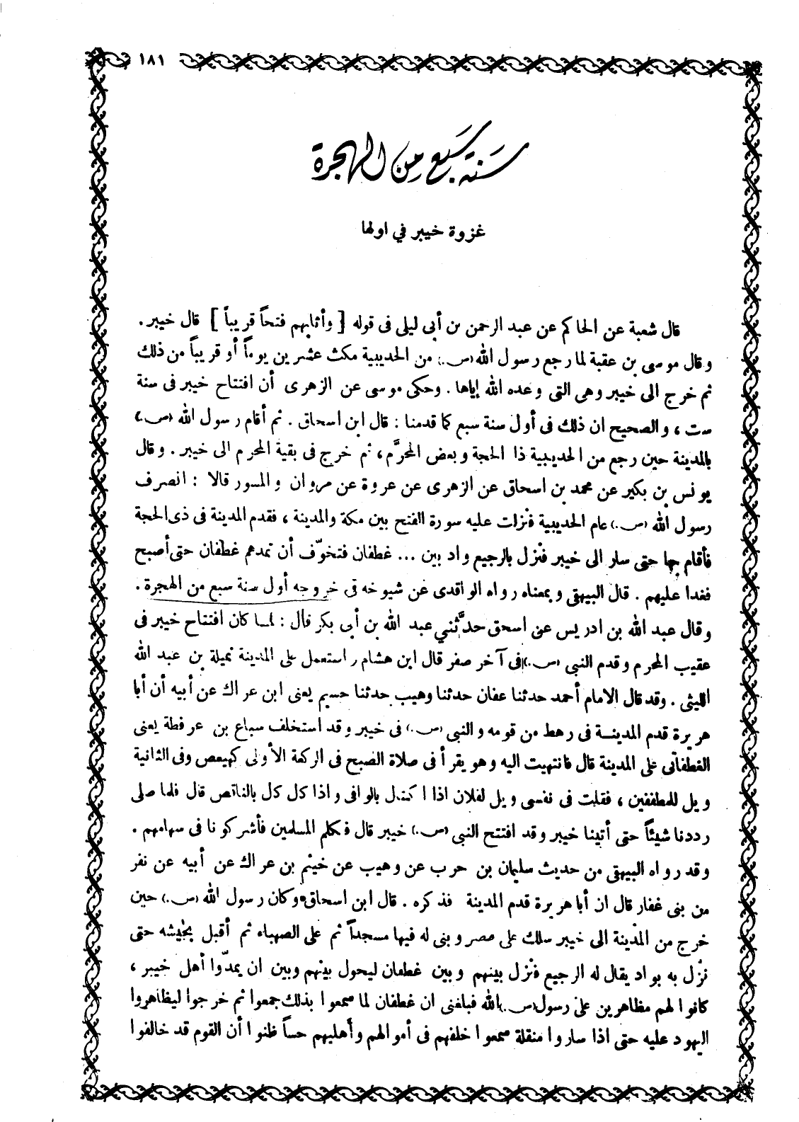 وَقَالَ مُوسَى بْنُ عُقْبَةَ لَمَّا رَجَعَ رَسُولُ اللَّهِ صَلَّى اللَّهُ عَلَيْهِ وَسَلَّمَ مَنْ الحديبيّة مكث عِشْرِينَ يَوْمًا أَوْ قَرِيبًا مِنْ ذَلِكَ ثُمَّ خَرَجَ إِلَى خَيْبَرَ وَهِيَ الَّتِي وَعَدَهُ اللَّهُ إِيَّاهَا. وَحَكَى مُوسَى عَنِ الزُّهْرِيِّ أَنَّ افْتِتَاحَ خَيْبَرَ فِي سَنَةِ سِتٍّ، وَالصَّحِيحُ أَنَّ ذَلِكَ فِي أَوَّلِ سَنَةِ سَبْعٍ كَمَا قَدَّمْنَا. قَالَ ابْنُ إِسْحَاقَ: ثُمَّ أَقَامَ رَسُولُ اللَّهِ صَلَّى اللَّهُ عَلَيْهِ وَسَلَّمَ بِالْمَدِينَةِ حِينَ رَجَعَ مِنَ الْحُدَيْبِيَةِ ذَا الْحِجَّةِ وَبَعْضَ الْمُحَرَّمِ، ثُمَّ خَرَجَ فِي بَقِيَّةِ الْمُحَرَّمِ إِلَى خَيْبَرَ. وَقَالَ يُونُسُ بْنُ بُكَيْرٍ عَنْ مُحَمَّدِ بْنِ إِسْحَاقَ عن الزُّهْرِيِّ عَنْ عُرْوَةَ عَنْ مَرْوَانَ وَالْمِسْوَرِ قَالَا: انْصَرَفَ رَسُولُ اللَّهِ صَلَّى اللَّهُ عَلَيْهِ وَسَلَّمَ عَامَ الْحُدَيْبِيَةِ فَنَزَلَتْ عَلَيْهِ سُورَةُ الْفَتْحِ بَيْنَ مَكَّةَ وَالْمَدِينَةِ، فَقَدِمَ الْمَدِينَةَ فِي ذِي الْحِجَّةِ فأقام بها حتى سار الى خيبر فنزل بالرجيع واد بين.... غطفان فتخوّف أن تمدهم غطفان حتى أصبح فغدا عليهم. قَالَ الْبَيْهَقِيُّ وَبِمَعْنَاهُ رَوَاهُ الْوَاقِدِيُّ عَنْ شُيُوخِهِ في خروجه أَوَّلِ سَنَةِ سَبْعٍ مِنَ الْهِجْرَةِ.