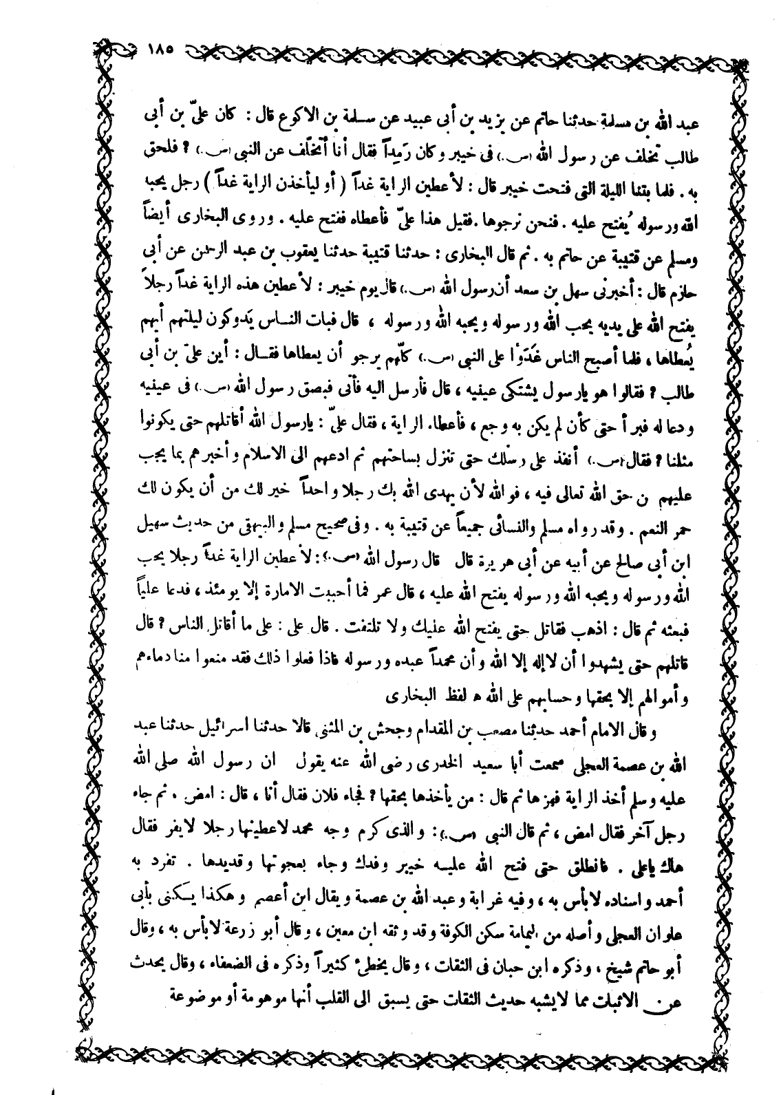 عَبْدُ اللَّهِ بْنُ مَسْلَمَةَ حَدَّثَنَا حَاتِمٌ عَنْ يَزِيدَ بْنِ أَبِي عُبَيْدٍ عَنْ سَلَمَةَ بْنِ الْأَكْوَعِ قَالَ: كَانَ عَلِيُّ بْنُ أَبِي طَالِبٍ تَخَلَّفَ عَنْ رَسُولِ اللَّهِ صَلَّى اللَّهُ عَلَيْهِ وَسَلَّمَ فِي خَيْبَرَ وَكَانَ رَمِدًا فَقَالَ أَنَا أَتَخَلَّفُ عَنِ النَّبِيِّ صَلَّى اللَّهُ عَلَيْهِ وَسَلَّمَ؟ فَلَحِقَ بِهِ. فَلَمَّا بِتْنَا اللَّيْلَةَ الَّتِي فُتِحَتْ خَيْبَرُ قَالَ: لَأُعْطِيَنَّ الرَّايَةَ غَدًا (أَوْ لَيَأْخُذَنَّ الرَّايَةَ غَدًا) رَجُلٌ يُحِبُّهُ اللَّهُ وَرَسُولُهُ يُفْتَحُ عَلَيْهِ. فَنَحْنُ نَرْجُوهَا. فَقِيلَ هَذَا عَلِيٌّ فَأَعْطَاهُ ففتح عليه. وَرَوَى الْبُخَارِيُّ أَيْضًا وَمُسْلِمٌ عَنْ قُتَيْبَةَ عَنِ حَاتِمٍ بِهِ. ثُمَّ قَالَ الْبُخَارِيُّ: حَدَّثَنَا قُتَيْبَةُ حَدَّثَنَا يَعْقُوبُ بْنُ عَبْدِ الرَّحْمَنِ عَنْ أَبِي حَازِمٍ قَالَ: أَخْبَرَنِي سَهْلُ بْنُ سَعْدٍ أَنَّ رَسُولَ اللَّهِ صَلَّى اللَّهُ عَلَيْهِ وَسَلَّمَ قال يَوْمَ خَيْبَرَ: لَأُعْطِيَنَّ هَذِهِ الرَّايَةَ غَدًا رَجُلًا يَفْتَحُ اللَّهُ عَلَى يَدَيْهِ يُحِبُّ اللَّهَ وَرَسُولَهُ وَيُحِبُّهُ اللَّهُ وَرَسُولُهُ، قَالَ فَبَاتَ النَّاسُ يَدُوكُونَ لَيْلَتَهُمْ أَيُّهُمْ يُعْطَاهَا، فَلَمَّا أَصْبَحَ النَّاسُ غَدَوْا عَلَى النَّبِيِّ صَلَّى اللَّهُ عَلَيْهِ وَسَلَّمَ كُلُّهُمْ يَرْجُو أَنْ يُعْطَاهَا فَقَالَ: أَيْنَ عَلِيُّ بْنُ أبى طالب؟ فقالوا هو يا رسول يشتكي عينيه، قال فأرسل اليه فأتى فَبَصَقَ رَسُولُ اللَّهِ صَلَّى اللَّهُ عَلَيْهِ وَسَلَّمَ فِي عَيْنَيْهِ وَدَعَا لَهُ فَبَرِأَ حَتَّى كَأَنْ لم يكن به وجع، فأعطى الرَّايَةَ، فَقَالَ عَلِيٌّ: يَا رَسُولَ اللَّهِ أُقَاتِلُهُمْ حَتَّى يَكُونُوا مِثْلَنَا؟ فَقَالَ صَلَّى اللَّهُ عَلَيْهِ وَسَلَّمَ انْفُذْ عَلَى رِسْلِكَ حَتَّى تَنْزِلَ بِسَاحَتِهِمْ ثُمَّ ادْعُهُمْ إِلَى الْإِسْلَامِ وَأَخْبِرْهُمْ بِمَا يَجِبُ عليهم من حق الله تعالى فيه، فو الله لَأَنْ يَهْدِيَ اللَّهُ بِكَ رَجُلًا وَاحِدًا خَيْرٌ لَكَ مِنْ أَنْ يَكُونَ لَكَ حُمُرُ النَّعَمِ. وَقَدْ رَوَاهُ مُسْلِمٌ والنَّسَائِيُّ جَمِيعًا عَنْ قُتَيْبَةَ بِهِ. وَفِي صَحِيحِ مُسْلِمٍ والْبَيْهَقِيِّ مِنْ حَدِيثِ سهيل ابن أَبِي صَالِحٍ عَنْ أَبِيهِ عَنْ أَبِي هُرَيْرَةَ قَالَ قَالَ رَسُولُ اللَّهِ صَلَّى اللَّهُ عَلَيْهِ وَسَلَّمَ: لَأُعْطِيَنَّ الرَّايَةَ غَدًا رَجُلًا يُحِبُّ اللَّهَ وَرَسُولَهُ وَيُحِبُّهُ اللَّهُ وَرَسُولُهُ يَفْتَحُ اللَّهُ عَلَيْهِ، قال عمر فما أحببت الامارة إلا يومئذ، فدعا عليما فَبَعَثَهُ ثُمَّ قَالَ: اذْهَبْ فَقَاتِلْ حَتَّى يَفْتَحَ اللَّهُ عَلَيْكَ وَلَا تَلْتَفِتْ. قَالَ عَلِيٌّ: عَلَى مَا أُقَاتِلُ النَّاسَ؟ قَالَ قَاتِلْهُمْ حَتَّى يَشْهَدُوا أَنْ لَا إِلَهَ إِلَّا اللَّهُ وَأَنَّ مُحَمَّدًا عَبْدُهُ وَرَسُولُهُ فَإِذَا فَعَلُوا ذَلِكَ فَقَدْ مَنَعُوا منا دِمَاءَهُمْ وَأَمْوَالَهُمْ إِلَّا بِحَقِّهَا وَحِسَابُهُمْ عَلَى اللَّهِ لفظ البخاري وَقَالَ الْإِمَامُ أَحْمَدُ حَدَّثَنَا مُصْعَبُ بْنُ الْمِقْدَامِ وجحش بْنُ الْمُثَنَّى قَالَا حَدَّثَنَا إِسْرَائِيلُ حَدَّثَنَا عَبْدُ اللَّهِ بْنُ عِصْمَةَ الْعِجْلِيُّ سَمِعْتُ أَبَا سَعِيدٍ الْخُدْرِيَّ رَضِيَ اللَّهُ عَنْهُ يَقُولُ إِنَّ رَسُولَ اللَّهِ صَلَّى اللَّهُ عَلَيْهِ وَسَلَّمَ أَخَذَ الرَّايَةَ فَهَزَّهَا ثُمَّ قَالَ: مَنْ يَأْخُذُهَا بِحَقِّهَا؟ فَجَاءَ فلان فقال أنا، قال: امض. ثم جاء رجل آخر فقال امض، ثُمَّ قَالَ النَّبِيُّ صَلَّى اللَّهُ عَلَيْهِ وَسَلَّمَ: والّذي كرم وجه محمد لا عطينها رجلا لا يفر فقال هَاكَ يَا عَلِيُّ. فَانْطَلَقَ حَتَّى فَتَحَ اللَّهُ عَلَيْهِ خَيْ