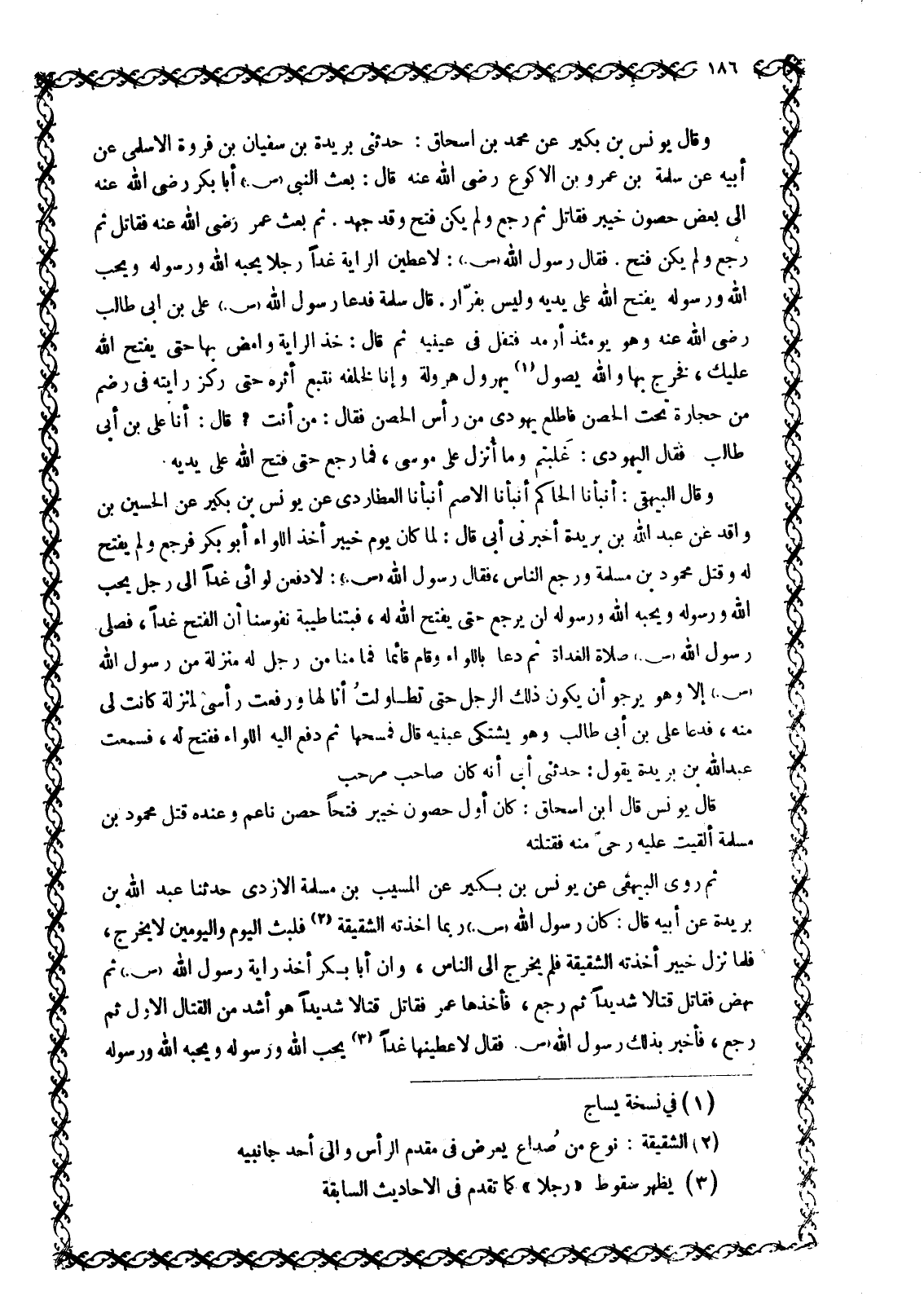 وَقَالَ يُونُسُ بْنُ بُكَيْرٍ عَنْ مُحَمَّدِ بْنِ إِسْحَاقَ: حَدَّثَنِي بُرَيْدَةَ بْنِ سُفْيَانِ بْنِ فَرْوَةَ الْأَسْلَمِيِّ عَنْ أَبِيهِ عَنْ سَلَمَةَ بْنِ عَمْرِو بْنِ الْأَكْوَعِ رَضِيَ اللَّهُ عَنْهُ قَالَ: بُعِثَ النَّبِيُّ صَلَّى اللَّهُ عَلَيْهِ وَسَلَّمَ أَبَا بَكْرٍ رَضِيَ اللَّهُ عَنْهُ إِلَى بَعْضِ حُصُونِ خَيْبَرَ فَقَاتَلَ ثُمَّ رَجَعَ وَلَمْ يَكُنْ فَتْحٌ وَقَدْ جَهِدَ. ثُمَّ بَعَثَ عُمَرَ رَضِيَ اللَّهُ عَنْهُ فَقَاتَلَ ثُمَّ رَجَعَ وَلَمْ يَكُنْ فَتْحٌ. فَقَالَ رَسُولُ اللَّهِ صَلَّى اللَّهُ عَلَيْهِ وَسَلَّمَ: لَأُعْطِيَنَّ الرَّايَةَ غَدًا رَجُلًا يُحِبُّهُ اللَّهُ وَرَسُولُهُ وَيُحِبُّ الله ورسوله يفتح الله على يديه وليس بِفَرَّارٍ. قَالَ سَلَمَةُ فَدَعَا رَسُولُ اللَّهِ صَلَّى اللَّهُ عَلَيْهِ وَسَلَّمَ عَلِيَّ بْنَ أَبِي طَالِبٍ رَضِيَ اللَّهُ عَنْهُ وَهُوَ يَوْمَئِذٍ أَرْمَدُ فَتَفَلَ فِي عَيْنَيْهِ ثُمَّ قَالَ: خُذِ الرَّايَةَ وَامْضِ بِهَا حَتَّى يَفْتَحَ اللَّهُ عَلَيْكَ، فَخَرَجَ بِهَا والله يصول [1] يُهَرْوِلُ هَرْوَلَةً وَإِنَّا لَخَلْفَهُ نَتَّبِعُ أَثَرَهُ حَتَّى رَكَزَ رَايَتَهُ فِي رَضْمٍ مِنْ حِجَارَةٍ تَحْتَ الْحِصْنِ فَاطَّلَعَ يَهُودِيٌّ مِنْ رَأْسِ الْحِصْنِ فَقَالَ: مَنْ أَنْتَ؟ قَالَ: أَنَا عَلِيُّ بْنُ أَبِي طالب فقال اليهودي: غلبتم وَمَا أُنْزِلَ عَلَى مُوسَى، فَمَا رَجَعَ حَتَّى فَتَحَ اللَّهُ عَلَى يَدَيْهِ وَقَالَ الْبَيْهَقِيُّ: أَنْبَأَنَا الْحَاكِمُ أَنْبَأَنَا الْأَصَمُّ أَنْبَأَنَا الْعُطَارِدِيُّ عَنْ يُونُسَ بْنِ بُكَيْرٍ عَنِ الْحُسَيْنِ بْنِ وَاقِدٍ عَنْ عَبْدِ اللَّهِ بْنِ بُرَيْدَةَ أَخْبَرَنِي أَبِي قَالَ: لَمَّا كَانَ يَوْمُ خَيْبَرَ أَخَذَ اللِّوَاءَ أَبُو بَكْرٍ فَرَجَعَ وَلَمْ يُفْتَحْ لَهُ وَقُتِلَ مَحْمُودُ بن مسلمة ورجع النَّاسُ، فَقَالَ رَسُولُ اللَّهِ صَلَّى اللَّهُ عَلَيْهِ وَسَلَّمَ: لَا دفعن لِوَائِي غَدًا إِلَى رَجُلٍ يُحِبُّ اللَّهَ وَرَسُولَهُ وَيُحِبُّهُ اللَّهُ وَرَسُولُهُ لَنْ يَرْجِعَ حَتَّى يَفْتَحَ اللَّهُ لَهُ، فَبِتْنَا طَيِّبَةً نُفُوسُنَا أَنَّ الْفَتْحَ غَدًا، فَصَلَّى رَسُولُ اللَّهِ صَلَّى اللَّهُ عَلَيْهِ وَسَلَّمَ صَلَاةَ الْغَدَاةِ ثُمَّ دَعَا بِاللِّوَاءِ وَقَامَ قَائِمًا فَمَا مِنَّا مِنْ رَجُلٍ لَهُ مَنْزِلَةٌ مِنْ رَسُولِ اللَّهِ صَلَّى اللَّهُ عَلَيْهِ وَسَلَّمَ إِلَّا وَهُوَ يَرْجُو أَنْ يَكُونَ ذَلِكَ الرَّجُلَ حتى تطاولت أنالها وَرَفَعْتُ رَأْسِي لِمَنْزِلَةٍ كَانَتْ لِي مِنْهُ، فَدَعَا عَلِيَّ بْنَ أَبِي طَالِبٍ وَهُوَ يَشْتَكِي عَيْنَيْهِ قَالَ فَمَسَحَهَا ثُمَّ دَفَعَ إِلَيْهِ اللِّوَاءَ فَفُتِحَ لَهُ، فَسَمِعْتُ عَبْدَ اللَّهِ بْنَ بُرَيْدَةَ يَقُولُ: حَدَّثَنِي أَبِي أَنَّهُ كَانَ صَاحِبَ مَرْحَبٍ قَالَ يُونُسُ قَالَ ابْنُ إِسْحَاقَ: كَانَ أَوَّلُ حُصُونِ خَيْبَرَ فَتْحًا حِصْنَ نَاعِمٍ وَعِنْدَهُ قُتِلَ مَحْمُودُ بْنُ مَسْلَمَةَ أُلْقِيَتْ عَلَيْهِ رَحًى مِنْهُ فَقَتَلَتْهُ ثُمَّ رَوَى الْبَيْهَقِيُّ عَنْ يُونُسَ بْنِ بُكَيْرٍ عَنِ الْمُسَيَّبِ بْنِ مَسْلَمَةَ الْأَزْدِيِّ حَدَّثَنَا عَبْدُ اللَّهِ بْنُ بُرَيْدَةَ عَنْ أَبِيهِ قَالَ: كَانَ رَسُولُ اللَّهِ صَلَّى اللَّهُ عَلَيْهِ وَسَلَّمَ رُبَّمَا أخذته الشقيقة [2] فلبث الْيَوْمَ وَالْيَوْمَيْنِ لَا يَخْرُجُ، فَلَمَّا نَزَلَ خَيْبَرَ أَخَذَتْهُ الشَّقِيقَةُ فَلَمْ يَخْرُجْ إِلَى النَّاسِ، وَإِنَّ أَبَا بَكْرٍ أَخَذَ رَايَةَ رَسُولُ اللَّهِ صَلَّى اللَّهُ عَلَيْهِ وَسَلَّمَ ثُمَّ نَهَضَ فَقَاتَلَ قِتَالًا شَدِيدًا ثُمَّ رَجَعَ، فَأَخَذَهَا عُمَرُ فَقَاتَلَ قِتَالًا شَدِيدًا هُوَ أَشَدُّ مِنَ الْقِتَالِ ا
