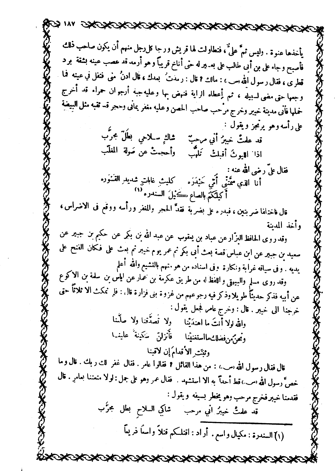 [1] قَالَ فاختلفا ضَرْبَتَيْنِ، فَبَدَرَهُ عَلِيٌّ بِضَرْبَةٍ فَقَدَّ الْحَجَرَ وَالْمِغْفَرَ وَرَأْسَهُ وَوَقَعَ فِي الْأَضْرَاسِ، وَأَخَذَ الْمَدِينَةَ وَقَدْ رَوَى الْحَافِظُ الْبَزَّارُ عَنْ عَبَّادِ بْنِ يَعْقُوبَ عن عبد الله بن بكر عَنْ حَكِيمُ بْنُ جُبَيْرٍ عَنْ سَعِيدِ بْنِ جُبَيْرٍ عَنِ ابْنِ عَبَّاسٍ قِصَّةَ بَعْثِ أَبِي بَكْرٍ ثُمَّ عُمَرَ يَوْمَ خَيْبَرَ ثُمَّ بَعْثِ عَلِيٍّ فَكَانَ الْفَتْحُ عَلَى يَدَيْهِ. وَفِي سِيَاقِهِ غَرَابَةٌ وَنَكَارَةٌ وَفِي إِسْنَادِهِ مَنْ هُوَ مُتَّهَمٌ بِالتَّشَيُّعِ وَاللَّهُ أَعْلَمُ وَقَدْ رَوَى مُسْلِمٌ والْبَيْهَقِيُّ وَاللَّفْظُ لَهُ مِنْ طَرِيقِ عِكْرِمَةَ بْنِ عَمَّارٍ عَنْ إِيَاسِ بْنِ سَلَمَةَ بْنِ الْأَكْوَعِ عَنْ أَبِيهِ فَذَكَرَ حَدِيثًا طَوِيلًا وَذَكَرَ فِيهِ رُجُوعَهُمْ مِنْ غَزْوَةِ بَنِي فَزَارَةَ قَالَ: فَلَمْ نَمْكُثْ إِلَّا ثَلَاثًا حَتَّى خَرَجْنَا إِلَى خَيْبَرَ. قَالَ: وَخَرَجَ عَامِرٌ فَجَعَلَ يَقُولُ: