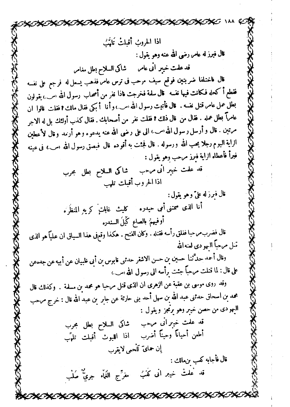قَالَ فَضَرَبَ مَرْحَبًا فَفَلَقَ رَأْسَهُ فَقَتَلَهُ. وَكَانَ الْفَتْحُ. هَكَذَا وَقَعَ فِي هَذَا السِّيَاقِ أَنَّ عَلِيًّا هُوَ الَّذِي قَتَلَ مَرْحَبًا الْيَهُودِيَّ لَعَنَهُ اللَّهُ وَقَالَ أَحْمَدُ حَدَّثَنَا حسين بن حسن الأشقر حدثني قَابُوسِ بْنِ أَبِي ظَبْيَانَ عَنْ أَبِيهِ عَنِ جَدِّهِ عَنْ عَلِيٍّ قَالَ: لَمَّا قَتَلْتُ مَرْحَبًا جِئْتُ بِرَأْسِهِ إِلَى رَسُولِ اللَّهِ صَلَّى اللَّهُ عَلَيْهِ وَسَلَّمَ وَقَدْ رَوَى مُوسَى بْنُ عُقْبَةَ عَنِ الزُّهْرِيِّ أَنَّ الَّذِي قَتَلَ مَرْحَبًا هُوَ مُحَمَّدُ بْنُ مَسْلَمَةَ. وَكَذَلِكَ قَالَ مُحَمَّدُ بْنُ إِسْحَاقَ حَدَّثَنِي عَبْدُ اللَّهِ بْنُ سَهْلٍ أَحَدُ بَنِي حَارِثَةَ عَنْ جَابِرِ بْنِ عَبْدِ اللَّهِ قَالَ: خَرَجَ مَرْحَبٌ الْيَهُودِيُّ مِنْ حِصْنِ خَيْبَرَ وَهُوَ يَرْتَجِزُ وَيَقُولُ: