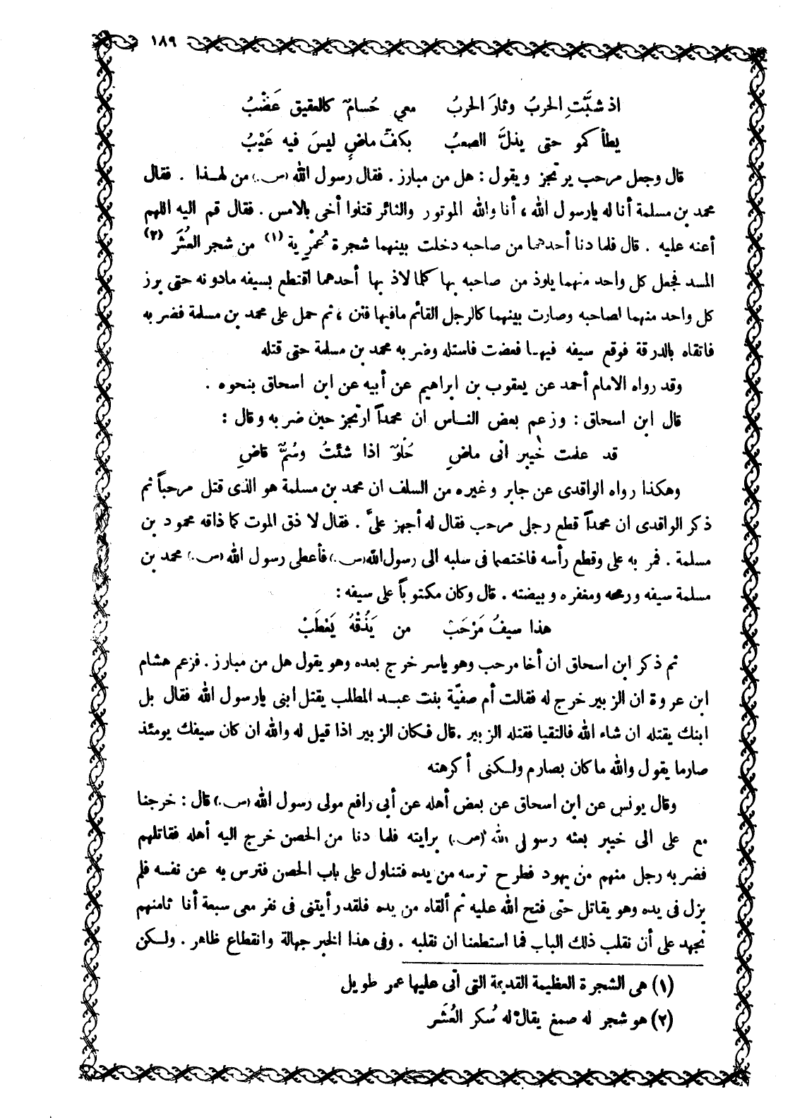 قال وجعل مرحب يَرْتَجِزُ وَيَقُولُ: هَلْ مِنْ مُبَارِزٍ. فَقَالَ رَسُولُ اللَّهِ صَلَّى اللَّهُ عَلَيْهِ وَسَلَّمَ مَنْ لِهَذَا فَقَالَ مُحَمَّدُ بْنُ مَسْلَمَةَ أَنَا لَهُ يَا رسول الله، أنا والله الموتور والثائر قَتَلُوا أَخِي بِالْأَمْسِ. فَقَالَ قُمْ إِلَيْهِ اللَّهمّ أَعِنْهُ عَلَيْهِ. قَالَ فَلَمَّا دَنَا أَحَدُهُمَا مِنْ صَاحَبِهِ دَخَلَتْ بَيْنَهُمَا شَجَرَةٌ عُمْرِيَّةٌ [1] مِنْ شَجَرِ العشر [2] المسد فَجَعَلَ كُلُّ وَاحِدٍ مِنْهُمَا يَلُوذُ مِنْ صَاحِبِهِ بها كلما لا ذبها أحدهما اقتطع بسيفه ما دونه حَتَّى بَرَزَ كُلُّ وَاحِدٍ مِنْهُمَا لِصَاحِبِهِ وَصَارَتْ بَيْنَهُمَا كَالرَّجُلِ الْقَائِمِ مَا فِيهَا فَنَنٌ، ثُمَّ حَمَلَ عَلَى مُحَمَّدِ بْنِ مَسْلَمَةَ فَضَرَبَهُ فَاتَّقَاهُ بالدرقة فوقع سيفه فيها فعضت فاستله وَضَرَبَهُ مُحَمَّدُ بْنُ مَسْلَمَةَ حَتَّى قَتَلَهُ وَقَدْ رَوَاهُ الْإِمَامُ أَحْمَدُ عَنْ يَعْقُوبَ بْنِ إِبْرَاهِيمَ عَنْ أَبِيهِ عَنِ ابْنِ إِسْحَاقَ بِنَحْوِهِ. قَالَ ابْنُ إِسْحَاقَ: وَزَعَمَ بَعْضُ النَّاسِ أَنَّ مُحَمَّدًا ارْتَجَزَ حِينَ ضَرَبَهُ وَقَالَ: