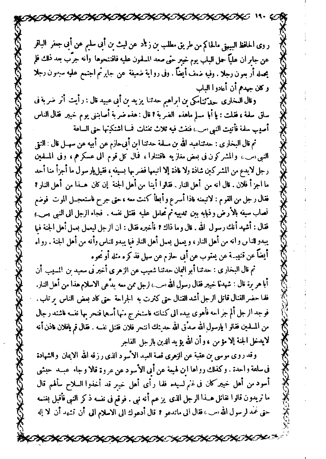 رَوَى الْحَافِظُ الْبَيْهَقِيُّ وَالْحَاكِمُ مِنْ طَرِيقِ مُطَّلِبِ بْنِ زِيَادٍ عَنْ لَيْثِ بْنِ أَبِي سُلَيْمٍ عَنْ أَبِي جَعْفَرٍ الْبَاقِرِ عَنْ جَابِرٍ أَنَّ عَلِيًّا حَمَلَ الْبَابَ يَوْمَ خَيْبَرَ حَتَّى صَعِدَ الْمُسْلِمُونَ عَلَيْهِ فَافْتَتَحُوهَا وَأَنَّهُ جُرِّبَ بَعْدَ ذَلِكَ فَلَمْ يَحْمِلْهُ أَرْبَعُونَ رَجُلًا. وَفِيهِ ضَعْفٌ أَيْضًا. وَفِي رِوَايَةٍ ضَعِيفَةٍ عَنْ جَابِرٍ ثُمَّ اجْتَمَعَ عَلَيْهِ سَبْعُونَ رَجُلًا وَكَانَ جَهْدَهُمْ أَنْ أَعَادُوا الْبَابَ وَقَالَ الْبُخَارِيُّ حَدَّثَنَا مَكِّيُّ بْنُ إِبْرَاهِيمَ حَدَّثَنَا يَزِيدُ بْنُ أَبِي عُبَيْدٍ قَالَ: رَأَيْتُ أَثَرَ ضَرْبَةٍ فِي سَاقِ سَلَمَةَ، فَقُلْتُ: يَا أَبَا مُسْلِمٍ مَا هَذِهِ الضَّرْبَةُ؟ قَالَ: هَذِهِ ضربة أصابتنى يَوْمَ خَيْبَرَ فَقَالَ النَّاسُ أُصِيبَ سَلَمَةُ فَأَتَيْتُ النَّبِيَّ صَلَّى اللَّهُ عَلَيْهِ وَسَلَّمَ فَنَفَثَ فِيهِ ثلاث تفثات فما اشتكيتها حَتَّى السَّاعَةِ ثُمَّ قَالَ الْبُخَارِيُّ: حَدَّثَنَا عَبْدُ اللَّهِ بْنُ مَسْلَمَةَ حَدَّثَنَا ابْنُ أَبِي حَازِمٍ عَنْ أَبِيهِ عَنْ سَهْلٍ قَالَ: الْتَقَى النَّبِيُّ صَلَّى اللَّهُ عَلَيْهِ وَسَلَّمَ وَالْمُشْرِكُونَ فِي بَعْضِ مَغَازِيهِ فَاقْتَتَلُوا، فَمَالَ كُلُّ قَوْمٍ إِلَى عَسْكَرِهِمْ، وَفِي الْمُسْلِمِينَ رَجُلٌ لَا يَدَعُ مِنَ الْمُشْرِكِينَ شَاذَّةً وَلَا فَاذَّةً إِلَّا اتَّبَعَهَا فَضَرَبَهَا بِسَيْفِهِ، فقيل يا رسول ما أجزأ منا أَحَدٌ مَا أَجْزَأَ فُلَانٌ. قَالَ إِنَّهُ مِنْ أَهْلِ النَّارِ. فَقَالُوا أَيُّنَا مِنْ أَهْلِ الْجَنَّةِ إِنْ كَانَ هَذَا مِنْ أَهْلِ النَّارِ؟
