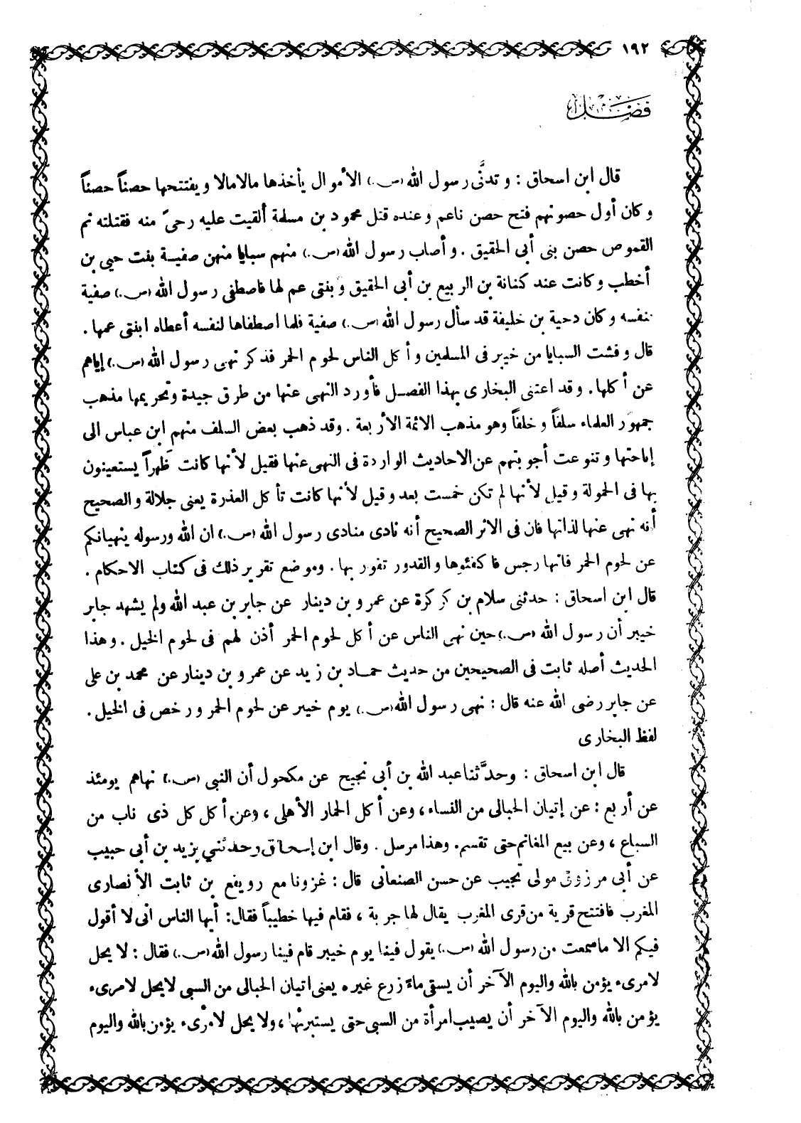 لَفْظُ الْبُخَارِيِّ قَالَ ابْنُ إِسْحَاقَ: وَحَدَّثَنَا عَبْدُ اللَّهِ بْنُ أَبِي نَجِيحٍ عَنْ مَكْحُولٍ أَنَّ النَّبِيَّ صَلَّى اللَّهُ عَلَيْهِ وَسَلَّمَ نَهَاهُمْ يَوْمَئِذٍ عَنْ أَرْبَعٍ: عَنْ إِتْيَانِ الْحَبَالَى مِنَ النِّسَاءِ، وَعَنْ أَكْلِ الْحِمَارِ الْأَهْلِيِّ، وَعَنْ أَكْلِ كُلِّ ذِي نَابٍ مِنَ السِّبَاعِ، وَعَنْ بَيْعِ الْمَغَانِمِ حَتَّى تُقْسَمَ. وَهَذَا مُرْسَلٌ. وَقَالَ ابْنُ إِسْحَاقَ: وَحَدَّثَنِي يَزِيدُ بْنُ أَبِي حَبِيبٍ عَنْ أَبِي مَرْزُوقٍ مولى تجيب عن حسن الصَّنْعَانِيِّ قَالَ: غَزَوْنَا مَعَ رُوَيْفِعِ بْنِ ثَابِتٍ الْأَنْصَارِيِّ الْمَغْرِبَ فَافْتَتَحَ قَرْيَةً مِنْ قُرَى الْمَغْرِبِ يقال لها جربة، فقام فيها خَطِيبًا فَقَالَ: أَيُّهَا النَّاسُ إِنِّي لَا أَقُولُ فِيكُمْ إِلَّا مَا سَمِعْتُ مِنْ رَسُولِ اللَّهِ صَلَّى اللَّهُ عَلَيْهِ وَسَلَّمَ يقول فيما يَوْمَ خَيْبَرَ قَامَ فِينَا رَسُولُ اللَّهِ صَلَّى اللَّهُ عَلَيْهِ وَسَلَّمَ فَقَالَ: لَا يَحِلُّ لِامْرِئٍ يؤمن باللَّه واليوم الآخر أن يسقى ماء زَرْعَ غَيْرِهِ يَعْنِي إِتْيَانَ الْحَبَالَى مِنَ السَّبْيِ لَا يَحِلُّ لِامْرِئٍ يُؤْمِنُ باللَّه وَالْيَوْمِ الْآخِرِ أَنْ يُصِيبَ امْرَأَةً مِنَ السَّبْيِ حَتَّى يَسْتَبْرِئَهَا، وَلَا يَحِلُّ لِامْرِئٍ يُؤْمِنُ باللَّه وَالْيَوْمِ