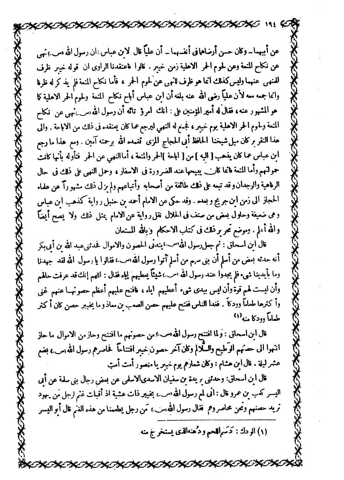عَنْ أَبِيهِمَا- وَكَانَ حَسَنٌ أَرْضَاهُمَا فِي أَنْفُسِهِمَا- أَنَّ عَلِيًّا قَالَ لِابْنِ عَبَّاسٍ: أَنَّ رَسُولَ اللَّهِ صَلَّى اللَّهُ عَلَيْهِ وَسَلَّمَ نَهَى عَنْ نِكَاحِ الْمُتْعَةِ وَعَنْ لُحُومِ الْحُمُرِ الْأَهْلِيَّةِ زَمَنَ خيبر. قالوا فاعتقدنا الرَّاوِي أَنَّ قَوْلَهُ خَيْبَرَ ظَرْفٌ لِلْمَنْهِيِّ عَنْهُمَا وَلَيْسَ كَذَلِكَ إِنَّمَا هُوَ ظَرْفٌ لِلنَّهْيِ عَنْ لُحُومِ الْحُمُرِ، فَأَمَّا نِكَاحُ الْمُتْعَةِ فَلَمْ يَذْكُرْ لَهُ ظَرْفًا وَإِنَّمَا جَمَعَهُ مَعَهُ لِأَنَّ عَلِيًّا رَضِيَ اللَّهُ عَنْهُ بَلَغَهُ أَنَّ ابْنَ عَبَّاسٍ أَبَاحَ نِكَاحَ الْمُتْعَةِ وَلُحُومَ الْحُمُرِ الْأَهْلِيَّةِ كَمَا هُوَ الْمَشْهُورُ عَنْهُ، فَقَالَ لَهُ أَمِيرُ الْمُؤْمِنِينَ عَلِيٌّ: إِنَّكَ امْرُؤٌ تَائِهٌ إِنَّ رَسُولَ اللَّهِ صَلَّى اللَّهُ عَلَيْهِ وَسَلَّمَ نَهَى عَنْ نِكَاحِ الْمُتْعَةِ وَلُحُومِ الْحُمُرِ الْأَهْلِيَّةِ يَوْمَ خَيْبَرَ، فَجَمَعَ لَهُ النَّهْيَ لِيَرْجِعَ عَمَّا كَانَ يَعْتَقِدُهُ فِي ذَلِكَ مِنَ الْإِبَاحَةِ. وَإِلَى هَذَا التَّقْرِيرِ كَانَ مَيْلُ شَيْخِنَا الْحَافِظِ أَبِي الْحَجَّاجِ الْمِزِّيِّ تَغَمَّدَهُ اللَّهُ بِرَحْمَتِهِ آمِينَ. وَمَعَ هَذَا مَا رَجَعَ ابْنُ عَبَّاسٍ عَمَّا كَانَ يَذْهَبُ [إِلَيْهِ] مِنْ [إِبَاحَةِ] الْحُمُرِ وَالْمُتْعَةِ، أَمَّا النَّهْيُ عَنِ الْحُمُرِ فَتَأَوَّلَهُ بِأَنَّهَا كَانَتْ حَمُولَتَهُمْ وَأَمَّا الْمُتْعَةُ فَإِنَّمَا كَانَ يُبِيحُهَا عِنْدَ الضَّرُورَةِ فِي الْأَسْفَارِ، وَحَمَلَ النَّهْيَ عَلَى ذَلِكَ فِي حَالِ الرَّفَاهِيَةِ وَالْوِجْدَانِ وَقَدْ تَبِعَهُ عَلَى ذَلِكَ طَائِفَةٌ مِنْ أَصْحَابِهِ وَأَتْبَاعِهِمْ وَلَمْ يَزَلْ ذَلِكَ مَشْهُورًا عَنْ عُلَمَاءِ الْحِجَازِ إِلَى زَمَنِ ابْنِ جُرَيْجٍ وَبَعْدَهُ. وَقَدْ حُكِيَ عَنِ الْإِمَامِ أَحْمَدَ بْنِ حَنْبَلٍ رِوَايَةٌ كمذهب ابن عباس وهي ضعفة وحاول بعض من صنف في الحلال نقل رواية عن الامام بِمِثْلِ ذَلِكَ وَلَا يَصِحُّ أَيْضًا وَاللَّهُ أَعْلَمُ. وَمَوْضِعُ تَحْرِيرِ ذَلِكَ فِي كِتَابِ الْأَحْكَامِ وباللَّه الْمُسْتَعَانُ قَالَ ابْنُ إِسْحَاقَ: ثُمَّ جَعَلَ رَسُولُ اللَّهِ صَلَّى اللَّهُ عَلَيْهِ وَسَلَّمَ يَتَدَنَّى الْحُصُونَ وَالْأَمْوَالَ فَحَدَّثَنِي عَبْدُ اللَّهِ بْنُ أَبِي بَكْرٍ أَنَّهُ حَدَّثَهُ بَعْضُ مَنْ أَسْلَمَ أَنَّ بَنِي سَهْمٍ مِنْ أَسْلَمَ أَتَوْا رَسُولِ اللَّهِ صَلَّى اللَّهُ عَلَيْهِ وَسَلَّمَ فَقَالُوا يا رسولي الله لقد جهدنا وما بأيدينا شَيْءٍ فَلَمْ يَجِدُوا عِنْدَ رَسُولِ اللَّهِ صَلَّى اللَّهُ عَلَيْهِ وَسَلَّمَ شَيْئًا يُعْطِيهِمْ إِيَّاهُ فَقَالَ: اللَّهمّ إِنَّكَ قَدْ عَرَفْتَ حَالَهُمْ وَأَنْ لَيْسَتْ لهم قُوَّةٌ وَأَنْ لَيْسَ بِيَدِي شَيْءٌ أُعْطِيهِمْ إِيَّاهُ، فافتح عليهم أعظم حصونها عنهم غنى وَأَكْثَرَهَا طَعَامًا وَوَدَكًا. فَغَدَا النَّاسُ فَفُتِحَ عَلَيْهِمْ حِصْنُ الصَّعْبِ بْنِ مُعَاذٍ وَمَا بِخَيْبَرَ حِصْنٌ كَانَ أَكْثَرَ طَعَامًا وَوَدَكًا مِنْهُ [1] قَالَ ابْنُ إِسْحَاقَ: وَلَمَّا افْتَتَحَ رَسُولُ اللَّهِ صَلَّى اللَّهُ عَلَيْهِ وَسَلَّمَ مِنْ حُصُونِهِمْ مَا افْتَتَحَ وَحَازَ مِنَ الْأَمْوَالِ مَا حَازَ انْتَهَوْا إِلَى حِصْنِهِمُ الْوَطِيحِ وَالسُّلَالِمِ وَكَانَ آخِرَ حُصُونِ خَيْبَرَ افْتِتَاحًا فَحَاصَرَهُمْ رَسُولُ اللَّهِ صَلَّى اللَّهُ عَلَيْهِ وَسَلَّمَ بِضْعَ عشر لَيْلَةً. قَالَ ابْنُ هِشَامٍ: وَكَانَ شِعَارُهُمْ يَوْمَ خَيْبَرَ يَا مَنْصُورُ أَمِتْ أَمِتْ قَالَ ابْنُ إسحاق: وحدثني بريدة بن سفيان الأسدي الْأَسْلَمِيُّ عَنْ بَعْضِ رِجَالِ بَنِي سَلِمَةَ عَنْ أبى اليسر كعب بن عمرو قال