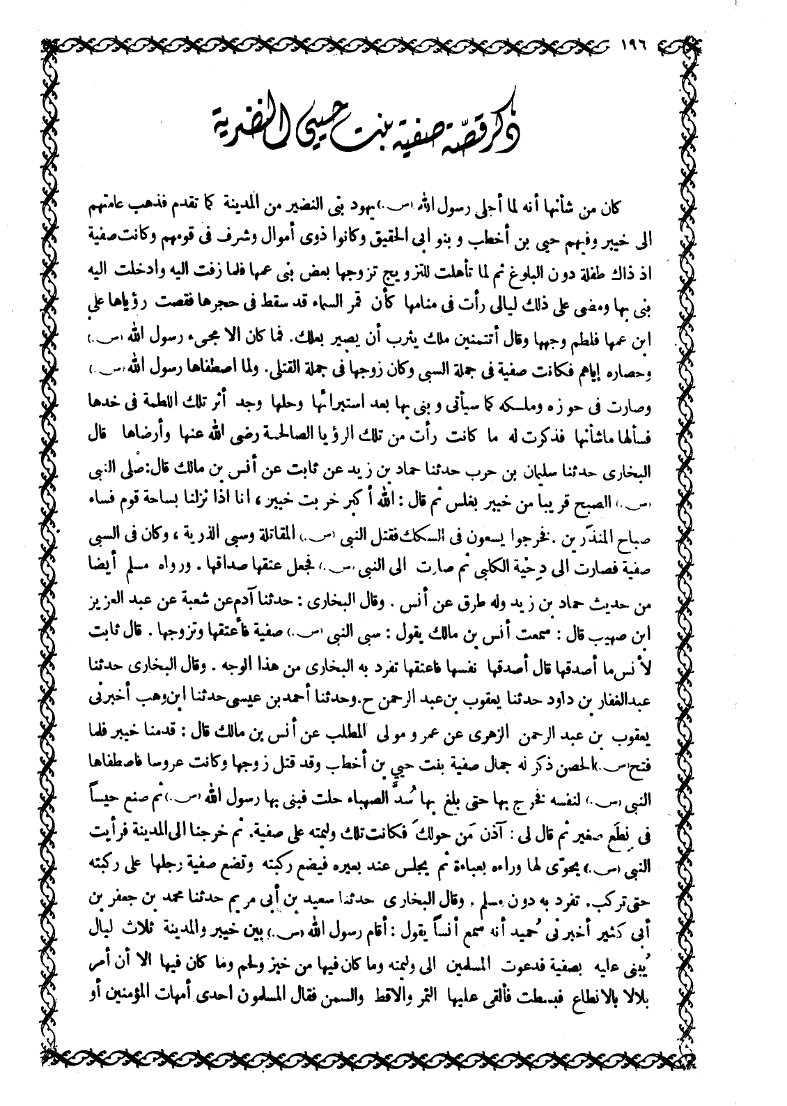 كان مِنْ شَأْنِهَا أَنَّهُ لَمَّا أَجْلَى رَسُولُ اللَّهِ صَلَّى اللَّهُ عَلَيْهِ وَسَلَّمَ يَهُودَ بَنِي النَّضِيرِ مِنَ الْمَدِينَةِ كَمَا تَقَدَّمَ فَذَهَبَ عَامَّتُهُمْ إِلَى خَيْبَرَ وَفِيهِمْ حُيَيُّ بْنُ أَخْطَبَ وَبَنُو أَبِي الْحُقَيْقِ وَكَانُوا ذَوِي أَمْوَالٍ وَشَرَفٍ فِي قَوْمِهِمْ وَكَانَتْ صَفِيَّةُ إِذْ ذَاكَ طِفْلَةً دُونَ الْبُلُوغِ ثُمَّ لَمَّا تَأَهَّلَتْ لِلتَّزْوِيجِ تَزَوَّجَهَا بَعْضُ بَنِي عمها فلما زفت اليه وادخلت اليه بنى بها ومضى على ذلك ليالي رَأَتْ فِي مَنَامِهَا كَأَنَّ قَمَرَ السَّمَاءِ قَدْ سَقَطَ فِي حِجْرِهَا فَقَصَّتْ رُؤْيَاهَا عَلَى ابْنِ عَمِّهَا فَلَطَمَ وَجْهَهَا وَقَالَ أَتَتَمَنَّيْنَ مَلِكَ يَثْرِبَ أَنْ يَصِيرَ بَعْلَكِ. فَمَا كَانَ إِلَّا مَجِيءُ رَسُولِ اللَّهِ صَلَّى اللَّهُ عَلَيْهِ وَسَلَّمَ وَحِصَارُهُ إِيَّاهُمْ فَكَانَتْ صَفِيَّةُ فِي جُمْلَةِ السَّبْيِ وَكَانَ زَوْجُهَا فِي جُمْلَةِ الْقَتْلَى. وَلَمَّا اصْطَفَاهَا رَسُولُ اللَّهِ صَلَّى اللَّهُ عَلَيْهِ وَسَلَّمَ وَصَارَتْ فِي حَوْزِهِ وَمُلْكِهِ كَمَا سَيَأْتِي وَبَنَى بِهَا بَعْدَ اسْتِبْرَائِهَا وَحِلِّهَا وَجَدَ أَثَرَ تِلْكَ اللَّطْمَةِ فِي خَدِّهَا فَسَأَلَهَا مَا شَأْنُهَا فَذَكَرَتْ لَهُ مَا كَانَتْ رَأَتْ مِنْ تِلْكَ الرُّؤْيَا الصَّالِحَةِ رَضِيَ اللَّهُ عَنْهَا وَأَرْضَاهَا قَالَ الْبُخَارِيُّ حَدَّثَنَا سُلَيْمَانُ بْنُ حَرْبٍ حَدَّثَنَا حَمَّادُ بْنُ زَيْدٍ عَنْ ثَابِتٍ عَنْ أَنَسِ بْنِ مَالِكٍ قَالَ: صَلَّى النَّبِيُّ صَلَّى اللَّهُ عَلَيْهِ وَسَلَّمَ الصُّبْحَ قَرِيبًا مِنْ خَيْبَرَ بِغَلَسٍ ثُمَّ قَالَ: اللَّهُ أَكْبَرُ خَرِبَتْ خَيْبَرُ، إِنَّا إِذَا نَزَلْنَا بِسَاحَةِ قَوْمٍ فَسَاءَ صَبَاحُ الْمُنْذَرِينَ. فَخَرَجُوا يَسْعَوْنَ فِي السِّكَكِ فَقَتَلَ النَّبِيُّ صَلَّى اللَّهُ عَلَيْهِ وَسَلَّمَ الْمُقَاتِلَةَ وَسَبَى الذُّرِّيَّةَ، وَكَانَ فِي السَّبْيِ صَفِيَّةُ فَصَارَتْ إِلَى دِحْيَةَ الْكَلْبِيِّ ثُمَّ صَارَتْ إِلَى النَّبِيِّ صَلَّى اللَّهُ عَلَيْهِ وَسَلَّمَ فَجَعَلَ عِتْقَهَا صَدَاقَهَا. وَرَوَاهُ مُسْلِمٌ أَيْضًا مِنْ حَدِيثِ حَمَّادِ بْنِ زَيْدٍ وَلَهُ طُرُقٌ عَنْ أَنَسٍ. وَقَالَ الْبُخَارِيُّ: حَدَّثَنَا آدَمُ عَنْ شُعْبَةَ عَنْ عَبْدِ الْعَزِيزِ ابن صُهَيْبٍ قَالَ: سَمِعْتُ أَنَسَ بْنَ مَالِكٍ يَقُولُ: سَبَى النَّبِيُّ صَلَّى اللَّهُ عَلَيْهِ وَسَلَّمَ صَفِيَّةَ فَأَعْتَقَهَا وَتَزَوَّجَهَا. قَالَ ثَابِتٌ لِأَنَسٍ مَا أَصْدَقَهَا قَالَ أَصْدَقَهَا نَفْسَهَا فَأَعْتَقَهَا تَفَرَّدَ بِهِ الْبُخَارِيُّ مِنْ هَذَا الْوَجْهِ. وَقَالَ الْبُخَارِيُّ حَدَّثَنَا عَبْدُ الْغَفَّارِ بْنُ دَاوُدَ حَدَّثَنَا يَعْقُوبُ بْنُ عَبْدِ الرحمن ح. وَحَدَّثَنَا أَحْمَدُ بْنُ عِيسَى حَدَّثَنَا ابْنُ وَهْبٍ أَخْبَرَنِي يَعْقُوبُ بْنُ عَبْدِ الرَّحْمَنِ الزُّهْرِيُّ عَنْ عَمْرٍو مَوْلَى الْمُطَّلِبِ عَنْ أَنَسِ بْنِ مَالِكٍ قال: قدمنا خيبر فلما فتح صلّى الله عليه وسلّم الْحِصْنَ ذُكِرَ لَهُ جَمَالُ صَفِيَّةَ بِنْتِ حُيَيِّ بْنِ أَخْطَبَ وَقَدْ قُتِلَ زَوْجُهَا وَكَانَتْ عَرُوسًا فَاصْطَفَاهَا النَّبِيُّ صَلَّى اللَّهُ عَلَيْهِ وَسَلَّمَ لِنَفْسِهِ فَخَرَجَ بِهَا حَتَّى بَلَغَ بِهَا سَدَّ الصَّهْبَاءِ حَلَّتْ فَبَنَى بِهَا رَسُولُ اللَّهِ صَلَّى اللَّهُ عَلَيْهِ وَسَلَّمَ ثُمَّ صَنَعَ حَيْسًا فِي نِطْعٍ صَغِيرٍ ثُمَّ قَالَ لِي: آذِنْ مَنْ حَوْلَكَ فَكَانَتْ تِلْكَ وَلِيمَتَهُ عَلَى صَفِيَّةَ. ثُمَّ خَرَجْنَا إِلَى الْمَدِينَةِ فَرَأَيْتُ النَّبِيَّ صَلَّى اللَّهُ عَلَيْهِ وَسَلَّمَ يُحَوِّي لَهَا وَرَاءَهُ بِعَبَاءَةٍ ثُمَّ يَجْلِسُ عِن