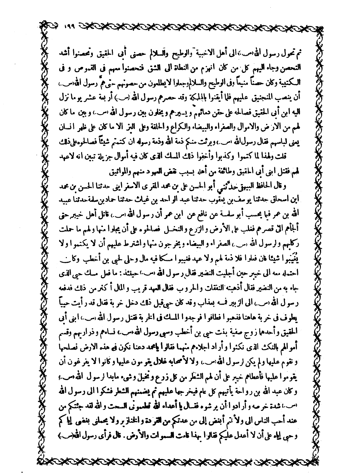 ثُمَّ تَحَوَّلَ رَسُولُ اللَّهِ صَلَّى اللَّهُ عَلَيْهِ وَسَلَّمَ إِلَى أهل الاخبية والوطيح والسلالم حصني أَبِي الْحُقَيْقِ وَتَحَصَّنُوا أَشَدَّ التَّحَصُّنِ وَجَاءَ إِلَيْهِمْ كل من كان انهزم من النطاة الى الشق فتحصنوا معهم في القموص وفي الكتيبة وكان حصنا منيعا وفي الوطيح والسلام وَجَعَلُوا لَا يَطْلُعُونَ مِنْ حُصُونِهِمْ حَتَّى هَمَّ رَسُولُ اللَّهِ صَلَّى اللَّهُ عَلَيْهِ وَسَلَّمَ إِنَّ يَنْصِبَ الْمَنْجَنِيقَ عَلَيْهِمْ فَلَمَّا أَيْقَنُوا بِالْهَلَكَةِ وَقَدْ حَصَرَهُمْ رَسُولُ اللَّهِ صَلَّى اللَّهُ عَلَيْهِ وَسَلَّمَ أَرْبَعَةَ عَشَرَ يَوْمًا نَزَلَ إِلَيْهِ ابْنُ أَبِي الْحُقَيْقِ فَصَالَحَهُ عَلَى حَقْنِ دِمَائِهِمْ وَيُسَيِّرُهُمْ وَيُخَلُّونَ بَيْنَ رَسُولِ اللَّهِ صَلَّى اللَّهُ عَلَيْهِ وَسَلَّمَ وَبَيْنَ مَا كَانَ لَهُمْ مِنَ الْأَرْضِ وَالْأَمْوَالِ وَالصَّفْرَاءِ وَالْبَيْضَاءِ وَالْكُرَاعِ وَالْحَلْقَةِ وَعَلَى الْبَزِّ إِلَّا ما كان على ظهر إنسان يَعْنِي لِبَاسَهُمْ فَقَالَ رَسُولُ اللَّهِ صَلَّى اللَّهُ عَلَيْهِ وَسَلَّمَ وَبَرِئَتْ مِنْكُمْ ذِمَّةُ اللَّهِ وَذِمَّةُ رسول إِنْ كَتَمْتُمْ شَيْئًا فَصَالَحُوهُ عَلَى ذَلِكَ قُلْتُ وَلِهَذَا لَمَّا كَتَمُوا وَكَذَبُوا وَأَخْفَوْا ذَلِكَ الْمَسْكَ الَّذِي كَانَ فِيهِ أَمْوَالٌ جَزِيلَةٌ تَبَيَّنَ أَنَّهُ لا عهد لهم فقتل ابني أَبِي الْحُقَيْقِ وَطَائِفَةٌ مِنْ أَهْلِهِ بِسَبَبِ نَقْضِ العهود منهم والمواثيق وقال الحافظ البيهقي حدّثنا أبو الحسن على بن محمد المقري الأسفراييني حدثنا الحسن بن محمد ابن إِسْحَاقَ حَدَّثَنَا يُوسُفُ بْنُ يَعْقُوبَ حَدَّثَنَا عَبْدُ الْوَاحِدِ بْنُ غِيَاثٍ حَدَّثَنَا حَمَّادُ بْنُ سَلَمَةَ حَدَّثَنَا عُبَيْدُ اللَّهِ بْنُ عُمَرَ فِيمَا يَحْسَبُ أَبُو سَلَمَةَ عَنْ نَافِعٍ عَنِ ابْنِ عُمَرَ أَنَّ رَسُولَ اللَّهِ صَلَّى اللَّهُ عَلَيْهِ وَسَلَّمَ قَاتَلَ أَهْلَ خَيْبَرَ حَتَّى أَلْجَأَهُمْ إِلَى قَصْرِهِمْ فَغَلَبَ عَلَى الْأَرْضِ وَالزَّرْعِ وَالنَّخْلِ فَصَالَحُوهُ عَلَى أَنْ يُجْلَوْا مِنْهَا وَلَهُمْ مَا حَمَلَتْ رِكَابُهُمْ وَلِرَسُولِ اللَّهِ صَلَّى اللَّهُ عَلَيْهِ وَسَلَّمَ الصَّفْرَاءُ وَالْبَيْضَاءُ وَيَخْرُجُونَ مِنْهَا وَاشْتَرَطَ عَلَيْهِمْ أَنْ لَا يَكْتُمُوا وَلَا يُغَيِّبُوا شَيْئًا فَإِنْ فَعَلُوا فَلَا ذِمَّةَ لَهُمْ وَلَا عَهْدَ فَغَيَّبُوا مَسْكًا فِيهِ مَالٌ وَحُلِيٌّ لِحُيَيِّ بْنِ أَخْطَبَ وَكَانَ احْتَمَلَهُ مَعَهُ إِلَى خَيْبَرَ حِينَ أُجْلِيَتِ النَّضِيرُ فَقَالَ رَسُولُ اللَّهِ صَلَّى اللَّهُ عَلَيْهِ وَسَلَّمَ حينئذ: مَا فَعَلَ مَسْكُ حُيَيٍّ الَّذِي جَاءَ بِهِ مِنَ النَّضِيرِ فَقَالَ أَذْهَبَتْهُ النَّفَقَاتُ وَالْحُرُوبُ فَقَالَ الْعَهْدُ قَرِيبٌ وَالْمَالُ أَكْثَرُ مِنْ ذَلِكَ فَدَفَعَهُ رَسُولُ اللَّهِ صَلَّى اللَّهُ عَلَيْهِ وَسَلَّمَ إِلَى الزُّبَيْرِ فَمَسَّهُ بِعَذَابٍ وَقَدْ كَانَ حُيَيٌّ قَبْلَ ذَلِكَ دَخَلَ خَرِبَةٍ فَقَالَ قَدْ رَأَيْتُ حُيَيًّا يَطُوفُ فِي خَرِبَةٍ هَاهُنَا فَذَهَبُوا فَطَافُوا فَوَجَدُوا الْمَسْكَ فِي الْخَرِبَةِ فَقَتَلَ رَسُولُ اللَّهِ صَلَّى اللَّهُ عَلَيْهِ وَسَلَّمَ ابْنَيْ أَبِي الْحُقَيْقِ وَأَحَدُهُمَا زَوْجُ صَفِيَّةَ بِنْتِ حُيَيِّ بْنِ أَخْطَبَ وَسَبَى رَسُولُ اللَّهِ صَلَّى اللَّهُ عَلَيْهِ وَسَلَّمَ نِسَاءَهُمْ وَذَرَارِيَّهُمْ وَقَسَمَ أَمْوَالَهُمْ بِالنَّكْثِ الَّذِي نَكَثُوا وَأَرَادَ اجلاءهم منهما فَقَالُوا يَا مُحَمَّدُ دَعْنَا نَكُونُ فِي هَذِهِ الْأَرْضِ نُصْلِحُهَا وَنَقُومُ عَلَيْهَا وَلَمْ يَكُنْ لِرَسُولِ اللَّهِ صَلَّى اللَّهُ عَلَيْهِ وَسَلَّمَ وَلَا لِأَصْحَابِهِ