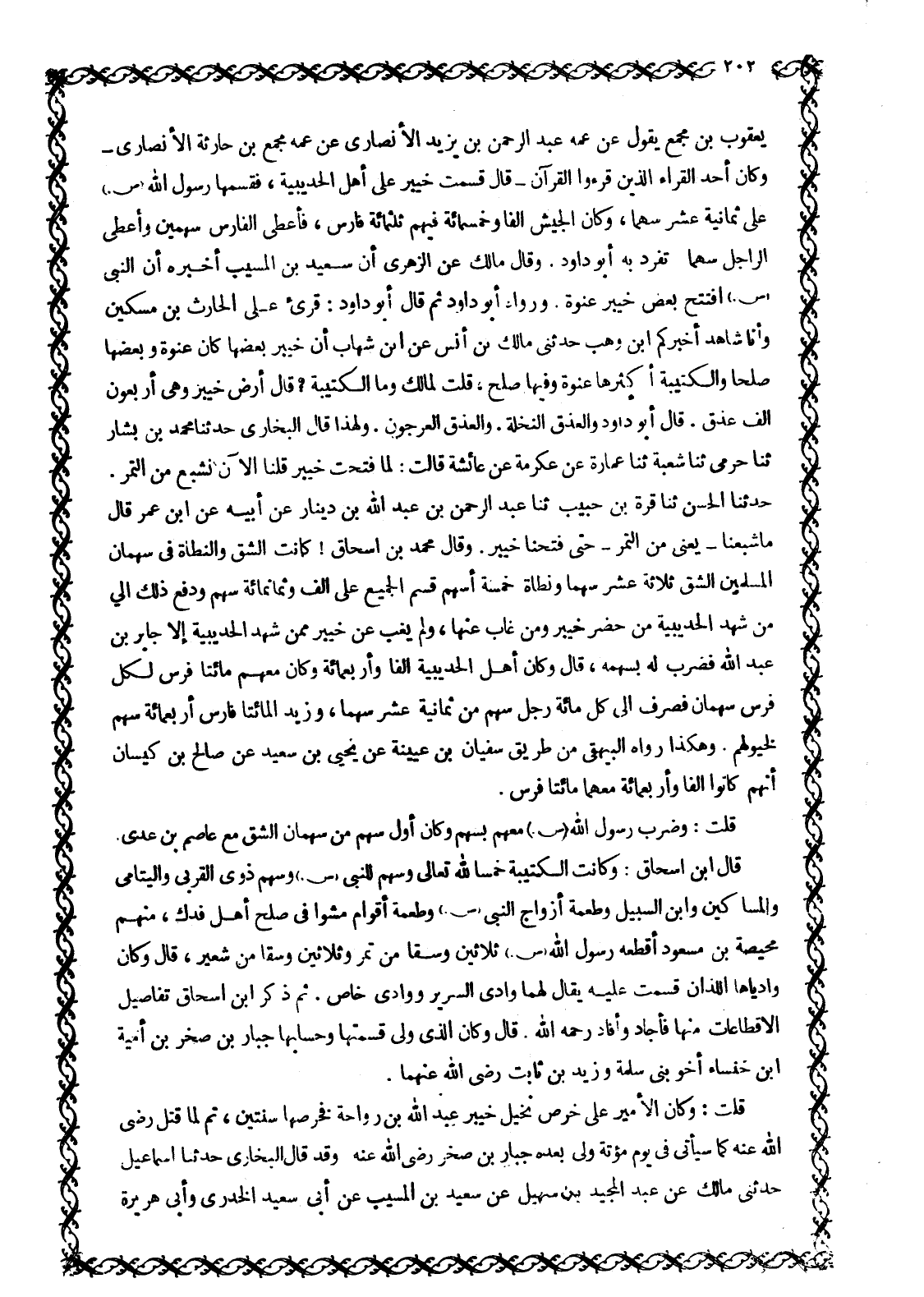 يَعْقُوبَ بْنِ مُجَمِّعٍ يَقُولُ عَنْ عَمِّهِ عَبْدِ الرَّحْمَنِ بْنِ يَزِيدَ الْأَنْصَارِيِّ عَنْ عَمِّهِ مُجَمِّعِ بن حارثة الْأَنْصَارِيِّ- وَكَانَ أَحَدَ الْقُرَّاءِ الَّذِينَ قَرَءُوا الْقُرْآنَ- قَالَ قُسِمَتْ خَيْبَرُ عَلَى أَهْلِ الْحُدَيْبِيَةِ، فَقَسَمَهَا رَسُولُ اللَّهِ صَلَّى اللَّهُ عَلَيْهِ وَسَلَّمَ عَلَى ثَمَانِيَةَ عَشَرَ سَهْمًا، وَكَانَ الْجَيْشُ أَلْفًا وَخَمْسَمِائَةٍ فِيهِمْ ثَلَاثُمِائَةِ فَارِسٍ، فَأَعْطَى الْفَارِسَ سَهْمَيْنِ وَأَعْطَى الرَّاجِلَ سَهْمًا. تَفَرَّدَ بِهِ أَبُو دَاوُدَ. وَقَالَ مَالِكٌ عَنِ الزُّهْرِيِّ أَنَّ سَعِيدَ بْنَ الْمُسَيَّبِ أَخْبَرَهُ أَنَّ النَّبِيَّ صَلَّى اللَّهُ عَلَيْهِ وَسَلَّمَ افتتح بعض خيبر عنوة. ورواء أَبُو دَاوُدَ ثُمَّ قَالَ أَبُو دَاوُدَ: قُرِئَ عَلَى الْحَارِثِ بْنِ مِسْكِينٍ وَأَنَا شَاهِدٌ أَخْبَرَكُمُ ابْنُ وَهْبٍ حَدَّثَنِي مَالِكُ بْنُ أَنَسٍ عَنِ ابْنِ شِهَابٍ أَنْ خَيْبَرَ بَعْضُهَا كَانَ عَنْوَةً وَبَعْضُهَا صُلْحًا وَالْكَتِيبَةُ أَكْثَرُهَا عَنْوَةً وَفِيهَا صُلْحٌ، قُلْتُ لِمَالِكٍ وَمَا الْكَتِيبَةُ؟ قَالَ أَرْضُ خَيْبَرَ وَهِيَ أَرْبَعُونَ أَلْفَ عَذْقٍ. قَالَ أَبُو دَاوُدَ والعذق النخلة. أو العذق الْعُرْجُونُ. وَلِهَذَا قَالَ الْبُخَارِيُّ حَدَّثَنَا مُحَمَّدُ بْنُ بَشَّارٍ ثَنَا حَرَمِيٌّ ثَنَا شُعْبَةُ ثَنَا عُمَارَةُ عَنْ عِكْرِمَةَ عَنْ عَائِشَةَ قَالَتْ: لَمَّا فُتِحَتْ خَيْبَرُ قُلْنَا الْآنَ نَشْبَعُ مِنَ التَّمْرِ.