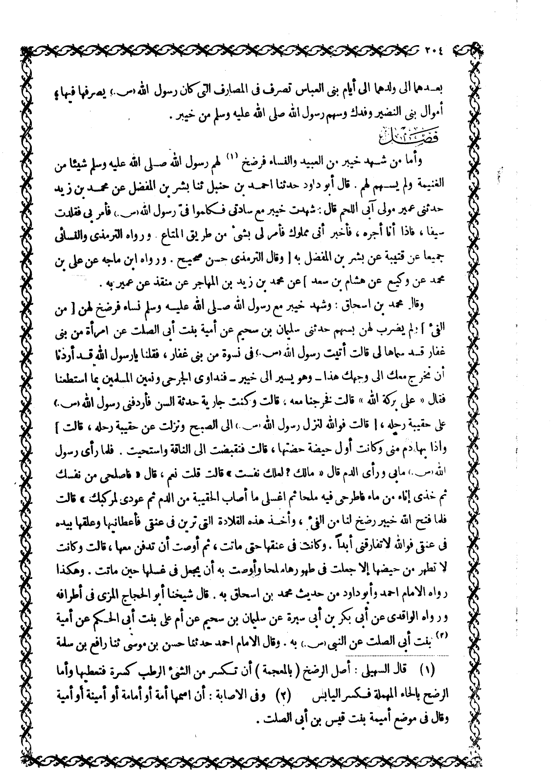 وَأَمَّا مَنْ شَهِدَ خَيْبَرَ مِنَ الْعَبِيدِ وَالنِّسَاءِ فَرَضَخَ [1] لَهُمْ رَسُولُ اللَّهِ صَلَّى اللَّهُ عَلَيْهِ وَسَلَّمَ شَيْئًا مِنَ الْغَنِيمَةِ وَلَمْ يُسْهِمْ لَهُمْ. قَالَ أَبُو دَاوُدَ حَدَّثَنَا أَحْمَدُ بْنُ حَنْبَلٍ ثَنَا بِشْرُ بْنُ الْمُفَضَّلِ عَنْ مُحَمَّدِ بْنِ زَيْدٍ حَدَّثَنِي عُمَيْرٌ مَوْلَى آبِي اللَّحْمِ قَالَ: شَهِدْتُ خَيْبَرَ مَعَ سَادَتِي فَكَلَّمُوا فِي رَسُولِ اللَّهِ صَلَّى اللَّهُ عَلَيْهِ وَسَلَّمَ فَأَمَرَ بِي فَقُلِّدْتُ سَيْفًا، فَإِذَا أَنَا أَجُرُّهُ، فَأُخْبِرَ أَنِّي مملوك فأمر لي بشيء من طريق الْمَتَاعِ. وَرَوَاهُ التِّرْمِذِيُّ وَالنَّسَائِيُّ جَمِيعًا عَنْ قُتَيْبَةَ عَنْ بِشْرِ بْنِ الْمُفَضَّلِ بِهِ [وَقَالَ التِّرْمِذِيُّ حَسَنٌ صَحِيحٌ. وَرَوَاهُ ابْنُ مَاجَهْ عَنْ عَلِيِّ بْنِ مُحَمَّدٍ عَنْ وَكِيعٍ عَنْ هِشَامِ بْنِ سَعْدٍ] عَنْ مُحَمَّدِ بْنِ زَيْدِ بْنِ الْمُهَاجِرِ عن منقذ عَنْ عُمَيْرٍ بِهِ.