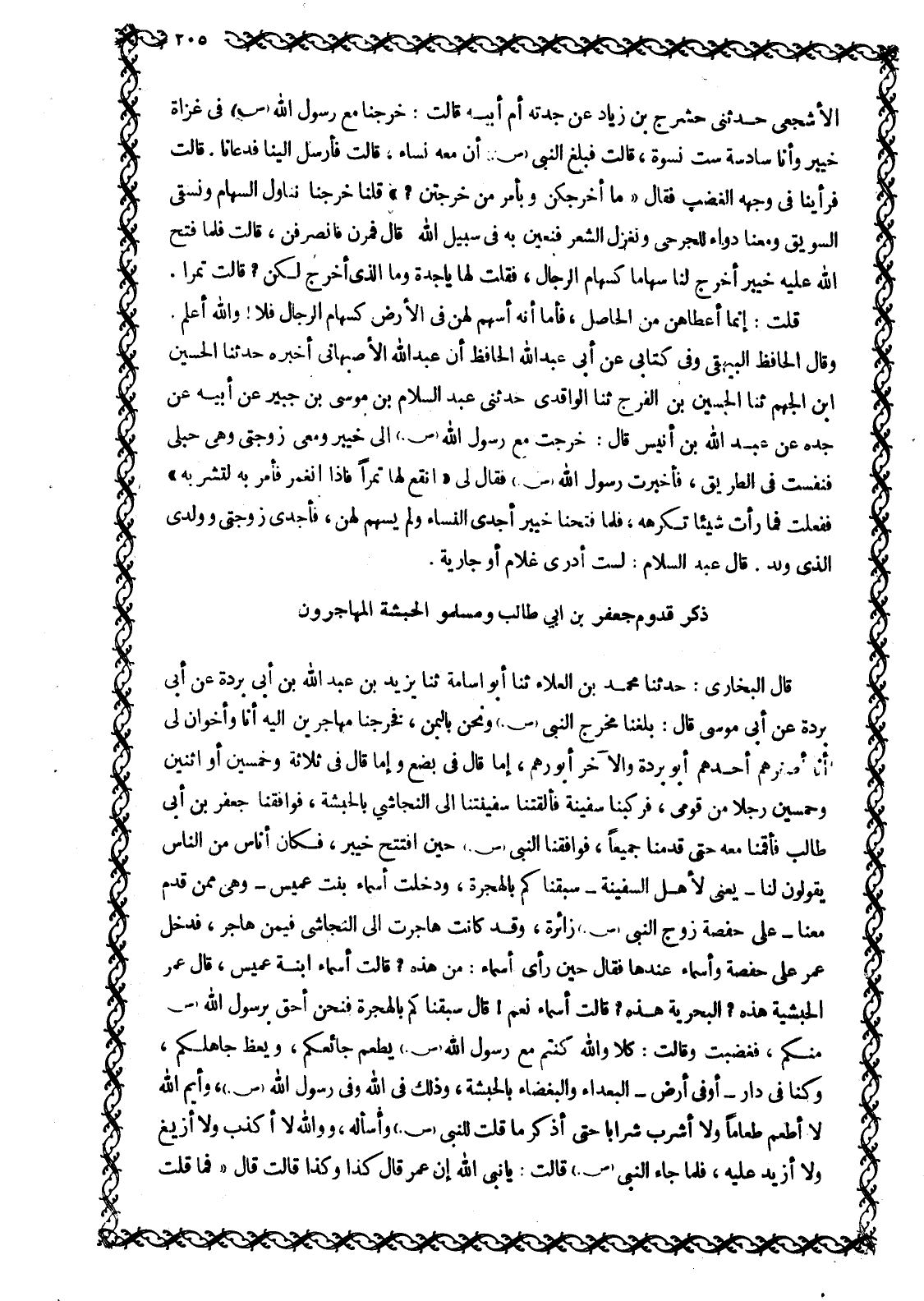 قَالَ الْبُخَارِيُّ: حَدَّثَنَا مُحَمَّدُ بْنُ الْعَلَاءِ ثَنَا أَبُو أُسَامَةَ ثَنَا يَزِيدَ بْنِ عَبْدِ اللَّهِ بْنِ أَبِي بُرْدَةَ عَنْ أَبِي بُرْدَةَ عَنْ أَبِي مُوسَى قَالَ: بَلَغَنَا مَخْرَجُ النَّبِيِّ صَلَّى اللَّهُ عَلَيْهِ وَسَلَّمَ وَنَحْنُ بِالْيَمَنِ، فَخَرَجْنَا مُهَاجِرِينَ إِلَيْهِ أَنَا وَأَخَوَانِ لِي أنا أصغرهم أحدهم أَبُو بُرْدَةَ وَالْآخَرُ أَبُو رُهْمٍ، إِمَّا قَالَ فِي بِضْعٍ وَإِمَّا قَالَ فِي ثَلَاثَةٍ وَخَمْسِينَ أَوِ اثْنَيْنِ وَخَمْسِينَ رَجُلًا مِنْ قَوْمِي، فَرَكِبْنَا سَفِينَةً فَأَلْقَتْنَا سَفِينَتُنَا إِلَى النَّجَاشِيِّ بِالْحَبَشَةِ، فَوَافَقْنَا جَعْفَرَ بْنَ أَبِي طَالِبٍ فَأَقَمْنَا مَعَهُ حَتَّى قَدِمْنَا جَمِيعًا، فَوَافَقْنَا النَّبِيَّ صَلَّى اللَّهُ عَلَيْهِ وَسَلَّمَ حِينَ افْتَتَحَ خَيْبَرَ، فَكَانَ أُنَاسٌ مِنَ الناس يقولون لنا- يعنى لأهل السفينة- سبقنا كم بِالْهِجْرَةِ، وَدَخَلَتْ أَسْمَاءُ بِنْتُ عُمَيْسٍ- وَهِيَ مِمَنْ قَدِمَ مَعَنَا- عَلَى حَفْصَةَ زَوْجِ النَّبِيِّ صَلَّى اللَّهُ عَلَيْهِ وَسَلَّمَ زَائِرَةً، وَقَدْ كَانَتْ هَاجَرَتْ إِلَى النَّجَاشِيِّ فِيمَنْ هَاجَرَ، فَدَخَلَ عُمَرُ عَلَى حفصة وأسماء عندها فقال حِينَ رَأَى أَسْمَاءَ: مَنْ هَذِهِ؟ قَالَتْ أَسْمَاءُ ابنة عُمَيْسٍ، قَالَ عُمَرُ الْحَبَشِيَّةُ هَذِهِ؟ الْبَحْرِيَّةُ هَذِهِ؟ قَالَتْ أَسْمَاءُ نَعَمْ! قَالَ سَبَقْنَاكُمْ بِالْهِجْرَةِ فَنَحْنُ أَحَقُّ بِرَسُولِ اللَّهِ صَلَّى اللَّهُ عَلَيْهِ وَسَلَّمَ مِنْكُمْ، فَغَضِبَتْ وَقَالَتْ: كَلَّا وَاللَّهِ كُنْتُمْ مَعَ رَسُولِ اللَّهِ صَلَّى اللَّهُ عَلَيْهِ وَسَلَّمَ يُطْعِمُ جَائِعَكُمْ، وَيَعِظُ جَاهِلَكُمْ، وَكُنَّا فِي دَارِ- أَوْ فِي أَرْضِ- الْبُعَدَاءِ وَالْبُغَضَاءِ بِالْحَبَشَةِ، وَذَلِكَ فِي اللَّهِ وَفِي رَسُولِ اللَّهِ صَلَّى اللَّهُ عَلَيْهِ وَسَلَّمَ، وَايْمُ اللَّهِ لَا أَطْعَمُ طَعَامًا وَلَا أَشْرَبُ شَرَابًا حَتَّى أَذْكُرَ مَا قُلْتَ لِلنَّبِيِّ صلّى الله عليه وسلّم وأسأله، وو الله لَا أَكْذِبُ وَلَا أَزِيغُ وَلَا أَزِيدُ عَلَيْهِ، فَلَمَّا جَاءَ النَّبِيُّ صَلَّى اللَّهُ عَلَيْهِ وَسَلَّمَ قَالَتْ: يَا نَبِيَّ اللَّهِ إِنَّ عُمَرَ قَالَ كذا وكذا قالت قَالَ «فَمَا قُلْتِ