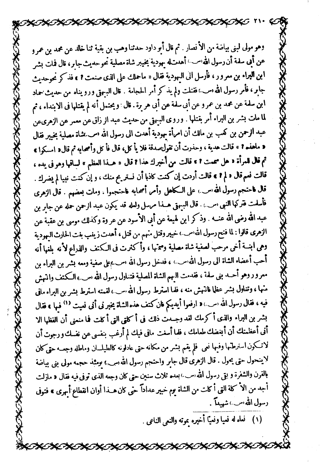 وَهُوَ مَوْلَى لِبَنِي بَيَاضَةَ مِنَ الْأَنْصَارِ. ثُمَّ قَالَ أَبُو دَاوُدَ حَدَّثَنَا وَهْبُ بْنُ بَقِيَّةَ ثَنَا خَالِدٌ عَنْ مُحَمَّدِ بْنِ عَمْرٍو عَنْ أَبِي سَلَمَةَ أَنَّ رَسُولَ اللَّهِ صَلَّى اللَّهُ عَلَيْهِ وَسَلَّمَ أَهْدَتْ لَهُ يَهُودِيَّةٌ بِخَيْبَرَ شَاةً مَصْلِيَّةً نَحْوَ حَدِيثِ جَابِرٍ، قَالَ فَمَاتَ بِشْرُ ابن الْبَرَاءِ بْنِ مَعْرُورٍ، فَأَرْسَلَ إِلَى الْيَهُودِيَّةِ فَقَالَ «مَا حَمَلَكِ عَلَى الَّذِي صَنَعْتِ؟» فَذَكَرَ نَحْوَ حديث جابر، فَأَمَرَ رَسُولُ اللَّهِ صَلَّى اللَّهُ عَلَيْهِ وَسَلَّمَ فَقُتِلَتْ وَلَمْ يَذْكُرْ أَمْرَ الْحِجَامَةِ. قَالَ الْبَيْهَقِيُّ ورويناه من حديث حماد ابن سَلَمَةَ عَنْ مُحَمَّدِ بْنِ عَمْرٍو عَنْ أَبِي سَلَمَةَ عَنْ أَبِي هُرَيْرَةَ. قَالَ: وَيُحْتَمَلُ أَنَّهُ لَمْ يَقْتُلْهَا فِي الِابْتِدَاءِ، ثُمَّ لَمَّا مَاتَ بِشْرُ بْنُ الْبَرَاءِ أَمَرَ بِقَتْلِهَا. وَرَوَى الْبَيْهَقِيُّ مِنْ حَدِيثِ عَبْدِ الرَّزَّاقِ عَنْ مَعْمَرٍ عَنْ الزُّهْرِيِّ عَنْ عَبْدِ الرَّحْمَنِ بْنِ كَعْبِ بْنِ مَالِكٍ أَنَّ امْرَأَةً يَهُودِيَّةً أَهْدَتْ إِلَى رَسُولِ اللَّهِ صَلَّى اللَّهُ عَلَيْهِ وَسَلَّمَ شَاةً مَصْلِيَّةً بِخَيْبَرَ فَقَالَ «مَا هَذِهِ؟» قَالَتْ هَدِيَّةٌ، وَحَذِرَتْ أَنْ تَقُولَ صَدَقَةٌ فَلَا يَأْكُلُ، قَالَ فَأَكَلَ وَأَصْحَابُهُ ثُمَّ قَالَ «أَمْسِكُوا» ثُمَّ قَالَ لِلْمَرْأَةِ «هل سمعت؟» قَالَتْ مَنْ أَخْبَرَكَ هَذَا؟ قَالَ «هَذَا الْعَظْمُ» لِسَاقِهَا وَهُوَ فِي يَدِهِ، قَالَتْ نَعَمْ قَالَ «لِمَ؟» قَالَتْ أَرَدْتُ إِنْ كُنْتَ كَاذِبًا أَنْ نَسْتَرِيحَ مِنْكَ، وَإِنْ كُنْتَ نَبِيًّا لَمْ يَضُرَّكَ. قَالَ فَاحْتَجَمَ رَسُولُ اللَّهِ صَلَّى اللَّهُ عَلَيْهِ وَسَلَّمَ عَلَى الْكَاهِلِ وَأَمَرَ أَصْحَابَهُ فَاحْتَجَمُوا. وَمَاتَ بَعْضُهُمْ. قَالَ الزُّهْرِيُّ فَأَسْلَمَتْ فَتَرَكَهَا النَّبِيُّ صَلَّى اللَّهُ عَلَيْهِ وَسَلَّمَ قَالَ الْبَيْهَقِيُّ هَذَا مُرْسَلٌ وَلَعَلَّهُ قَدْ يَكُونُ عَبْدُ الرَّحْمَنِ حَمَلَهُ عَنْ جَابِرِ بْنِ عَبْدِ اللَّهِ رَضِيَ اللَّهُ عَنْهُ. وَذَكَرَ ابْنُ لَهِيعَةَ عَنْ أَبِي الْأَسْوَدِ عَنْ عُرْوَةَ وَكَذَلِكَ مُوسَى بْنُ عُقْبَةَ عَنِ الزُّهْرِيِّ قَالُوا: لَمَّا فَتَحَ رَسُولُ اللَّهِ صَلَّى اللَّهُ عَلَيْهِ وَسَلَّمَ خَيْبَرَ وَقَتَلَ مِنْهُمْ مَنْ قَتَلَ، أَهْدَتْ زَيْنَبُ بِنْتُ الْحَارِثِ الْيَهُودِيَّةُ وَهِيَ ابْنَةُ أَخِي مَرْحَبٍ لِصَفِيَّةَ شَاةً مَصْلِيَّةً وَسَمَّتْهَا، وَأَكْثَرَتْ فِي الْكَتِفِ وَالذِّرَاعِ لِأَنَّهُ بَلَغَهَا أَنَّهُ أَحَبُّ أَعْضَاءِ الشَّاةِ إِلَى رَسُولِ اللَّهِ صَلَّى اللَّهُ عَلَيْهِ وَسَلَّمَ، فَدَخَلَ رَسُولُ اللَّهِ صَلَّى اللَّهُ عَلَيْهِ وَسَلَّمَ عَلَى صَفِيَّةَ وَمَعَهُ بِشْرُ بْنُ الْبَرَاءِ بْنِ مَعْرُورٍ وَهُوَ أَحَدُ بَنِي سَلَمَةَ، فَقَدَّمَتْ إِلَيْهِمُ الشَّاةَ الْمَصْلِيَّةَ فَتَنَاوَلَ رَسُولُ اللَّهِ صَلَّى اللَّهُ عَلَيْهِ وَسَلَّمَ الْكَتِفَ وَانْتَهَشَ مِنْهَا، وَتَنَاوَلَ بِشْرٌ عَظْمًا فَانْتَهَشَ مِنْهُ، فَلَمَّا اسْتَرَطَ رَسُولُ اللَّهِ صَلَّى اللَّهُ عَلَيْهِ وَسَلَّمَ لُقْمَتَهُ اسْتَرَطَ بِشْرُ بْنُ الْبَرَاءِ مَا فِي فِيهِ، فَقَالَ رَسُولُ اللَّهِ صَلَّى اللَّهُ عَلَيْهِ وَسَلَّمَ «ارْفَعُوا أَيْدِيَكُمْ فَإِنَّ كَتِفَ هَذِهِ الشَّاةِ يُخْبِرُنِي أَنِّي نُعِيتُ [1] فِيهَا» فَقَالَ بِشْرُ بْنُ الْبَرَاءِ وَالَّذِي أَكْرَمَكَ لَقَدْ وَجَدْتُ ذَلِكَ فِي أَكْلَتِي الَّتِي أَكَلْتُ فَمَا مَنَعَنِي أَنْ أَلْفِظَهَا إِلَّا أنى أعظمتك أن أبغضك طَعَامَكَ، فَلَمَّا أَسَغْتَ مَا فِي فِيكَ لَمْ أَرْغَ